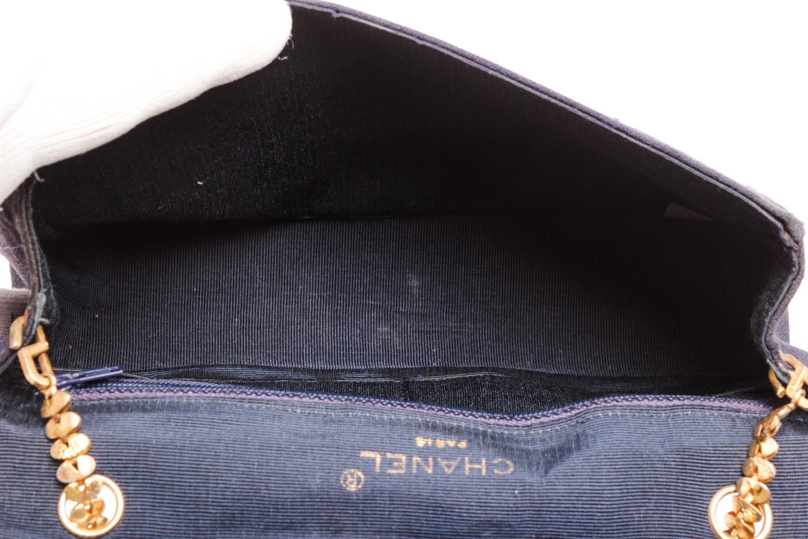Chanel Navy Blue Fabric Envelope Flap Crossbody Bag. All available information is listed in the description and shown in the photos. Chanel Navy Blue Fabric Envelope Flap Crossbody Bag with gold-tone hardware, single chain-link and leather shoulder strap, blue fabric lining, single slit pocket at interior wall, CC turn-lock closure at front flap. 28338Measurements: Length: 8 in / 20 cm Width: 1.25 in / 3 cm 5.25 in / 13 cm Condition: Pre-Owned Good overall, please see photographs for detail.