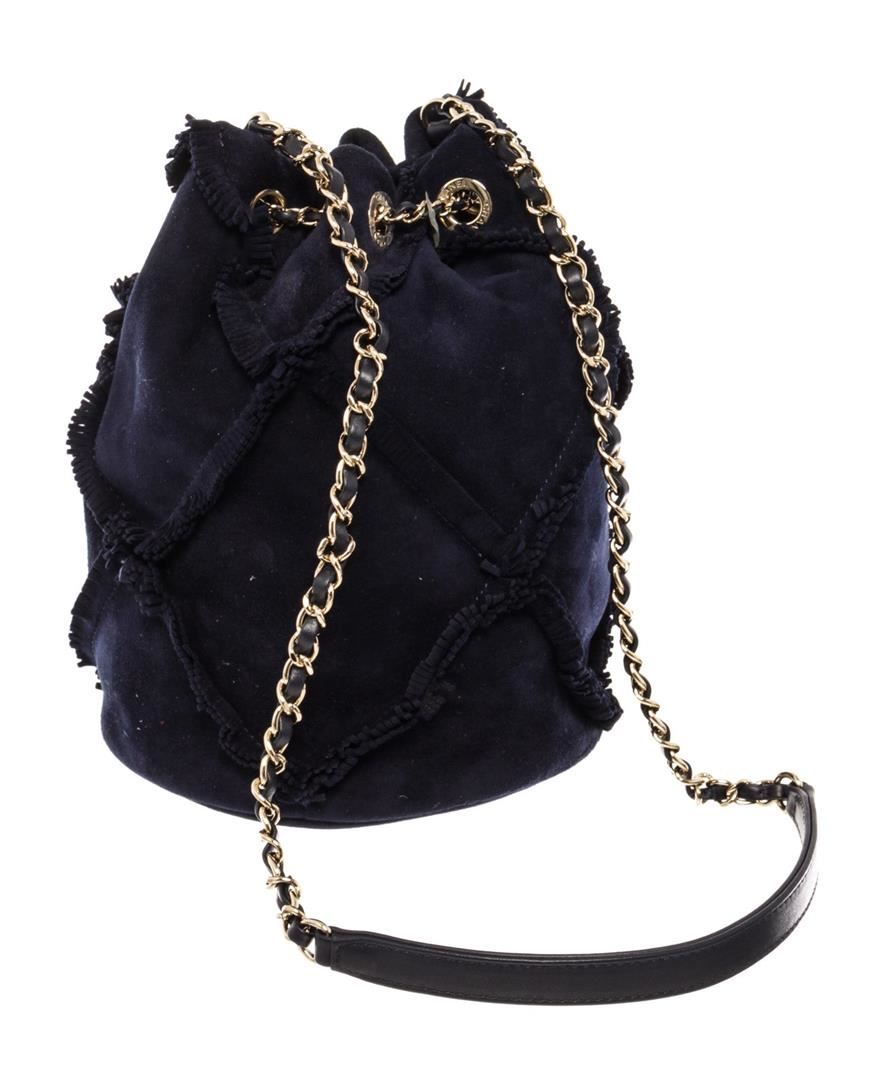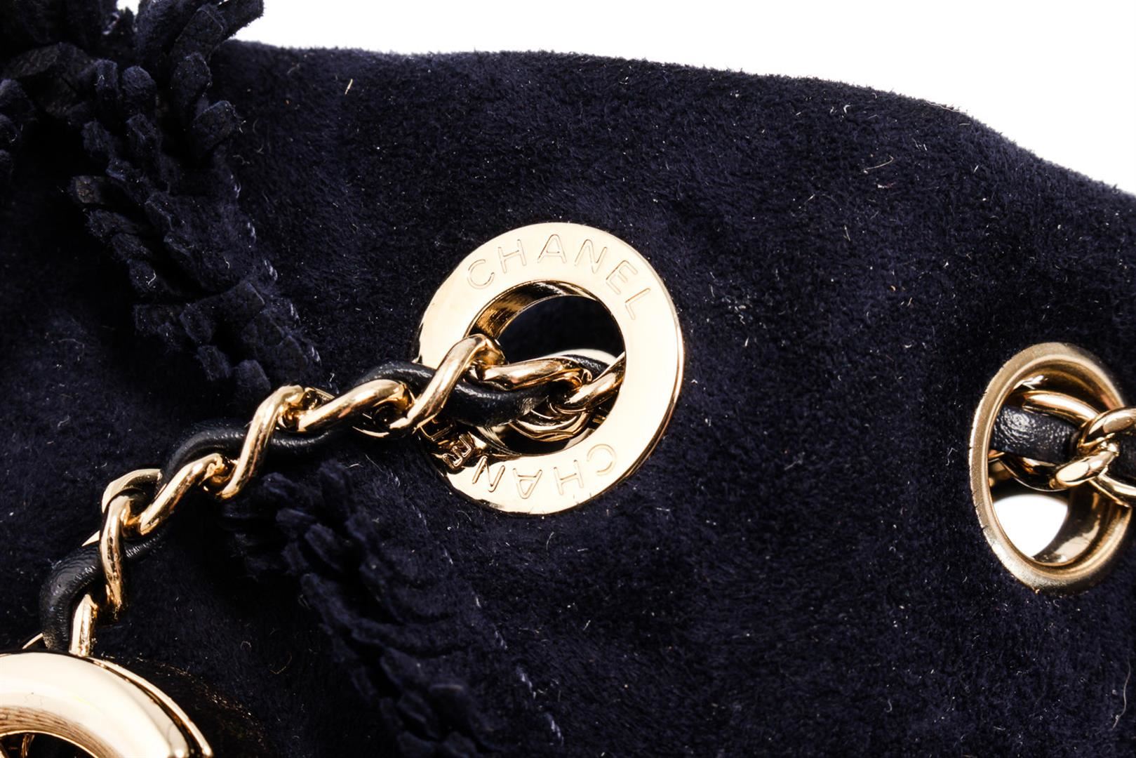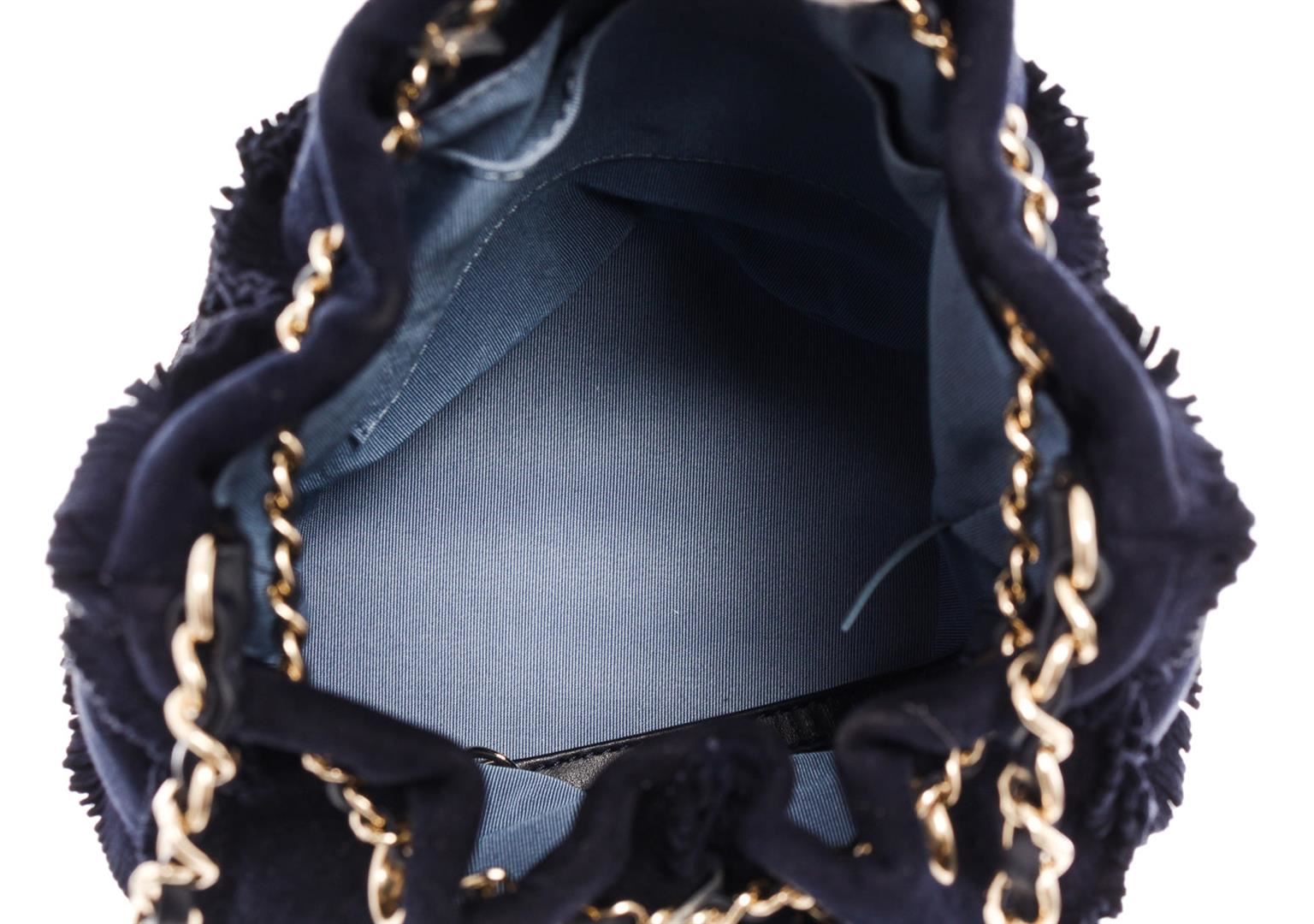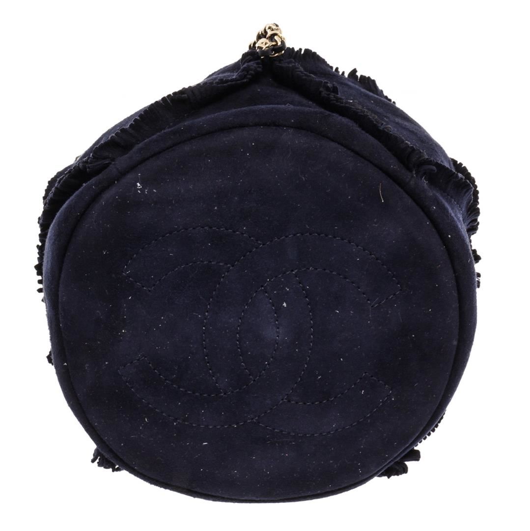Chanel Fringed Drawstring Bucket Bag with navy blue suede body, gold-tone hardware, entwined leather-chain drawstring and shoulder strap with an interlocking CC logo and light blue fabric lining with one flat pocket inside. eight 8.5", Width 8", Dept
