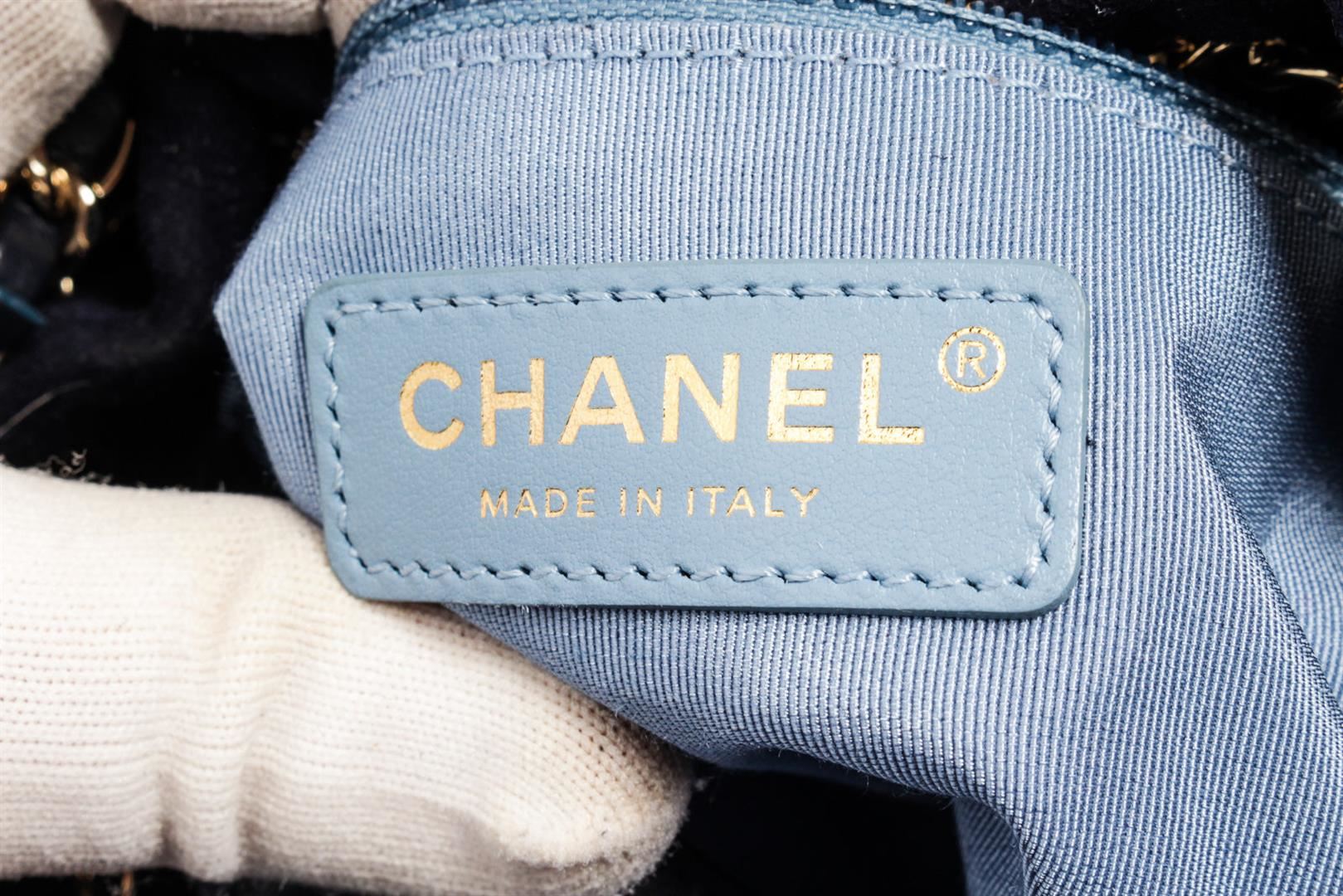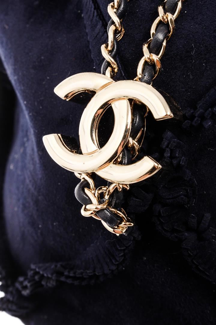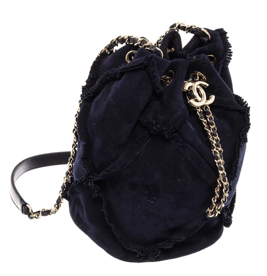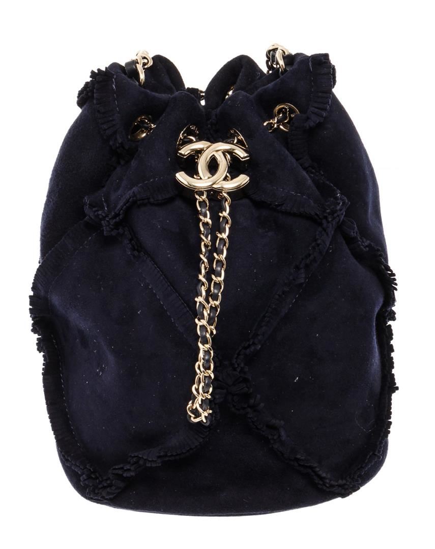 Chanel Fringed Drawstring Bucket Bag with navy blue suede body, gold-tone hardware, entwined leather-chain drawstring and shoulder strap with an interlocking CC logo and light blue fabric lining with one flat pocket inside. eight 8.5", Width 8", Dept