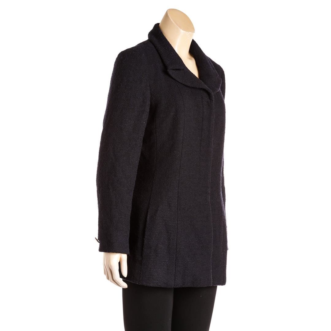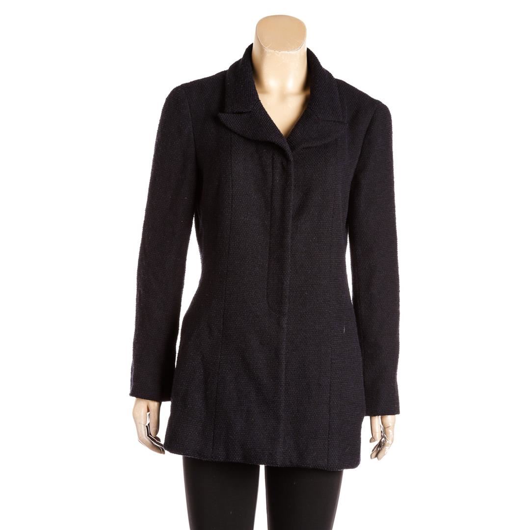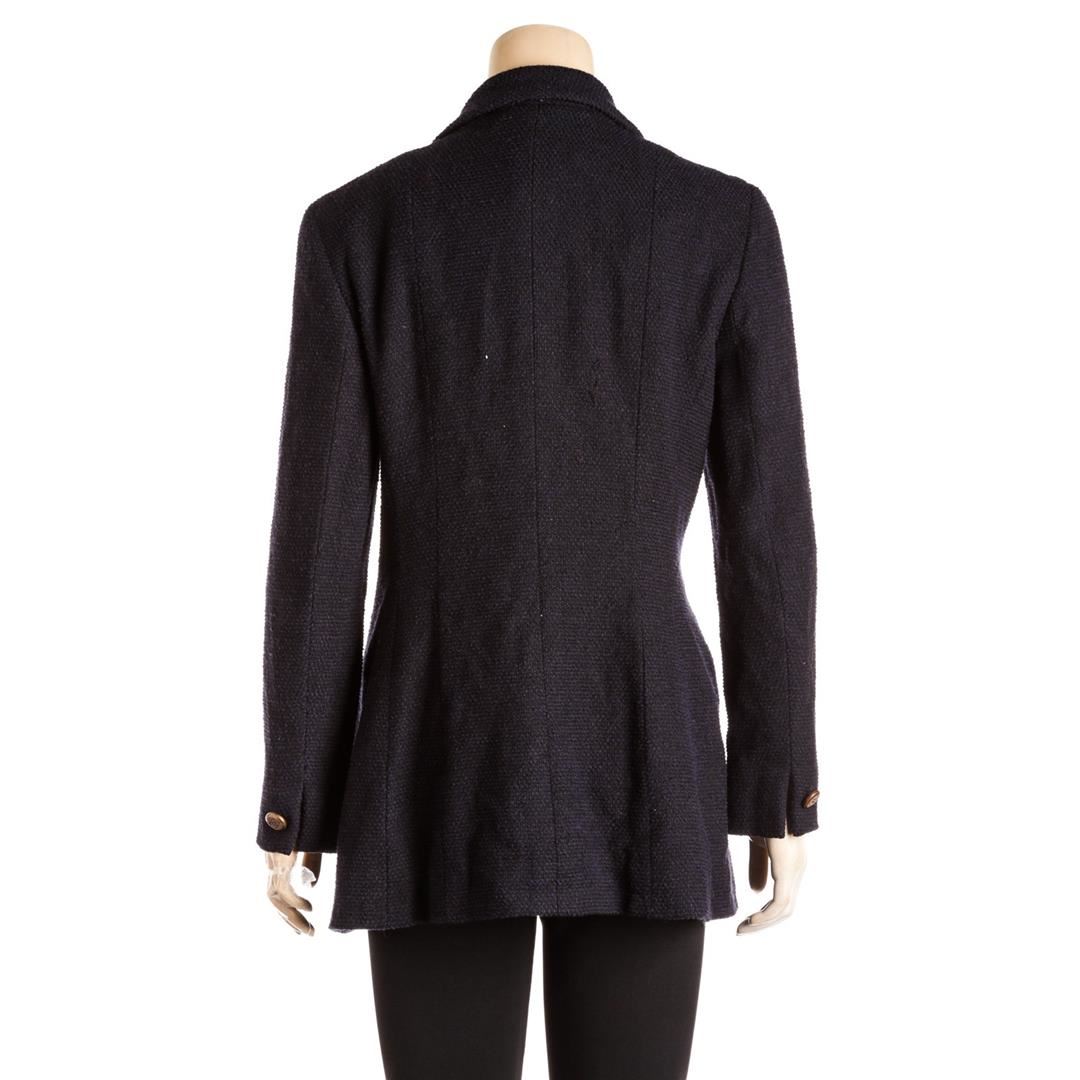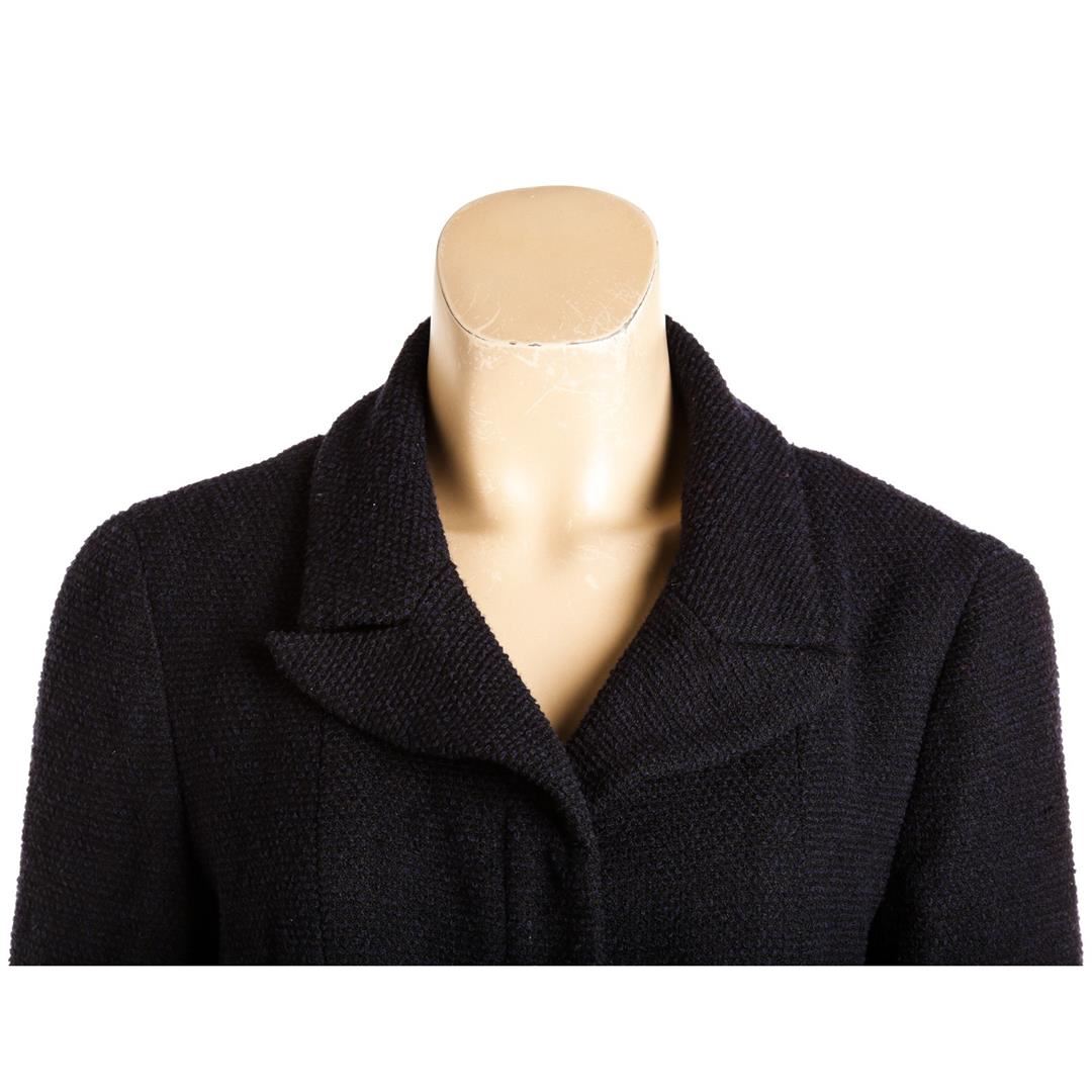 From the 01C collection. Navy and black Chanel tweed jacket, notched collar, structured shoulders, dual side pockets, silver-tone chain at interior hem CC button at cuffs and at center front.