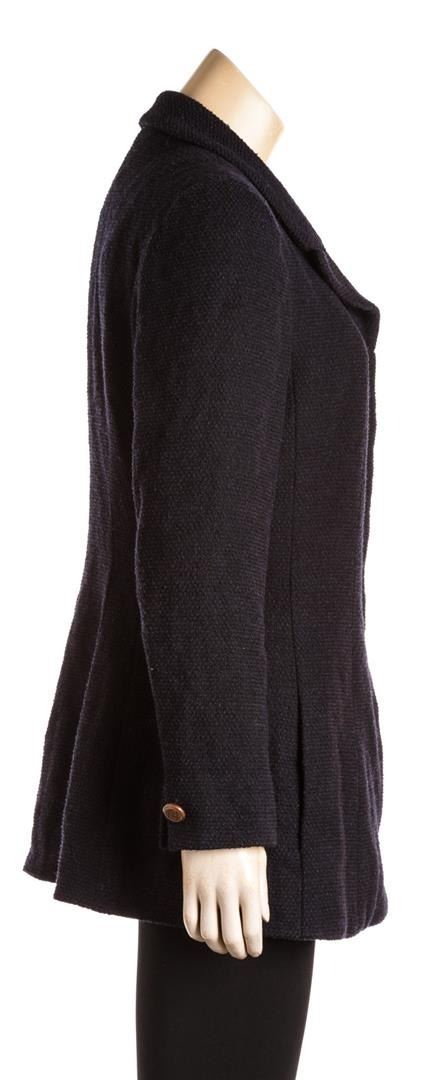 One Chanel Navy Blue Tweed Mid- Jacket. From the C collection. Navy and black Chanel tweed jacket, notched collar, structured shoulders, dual side pockets, silver-tone chain at interior hem CC button at cuffs and at center front.