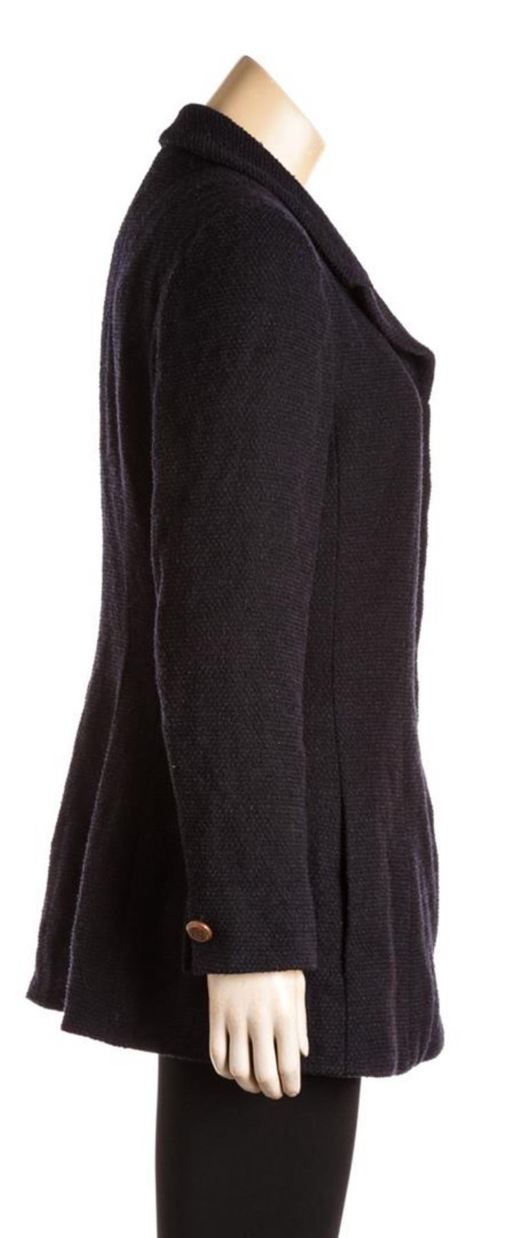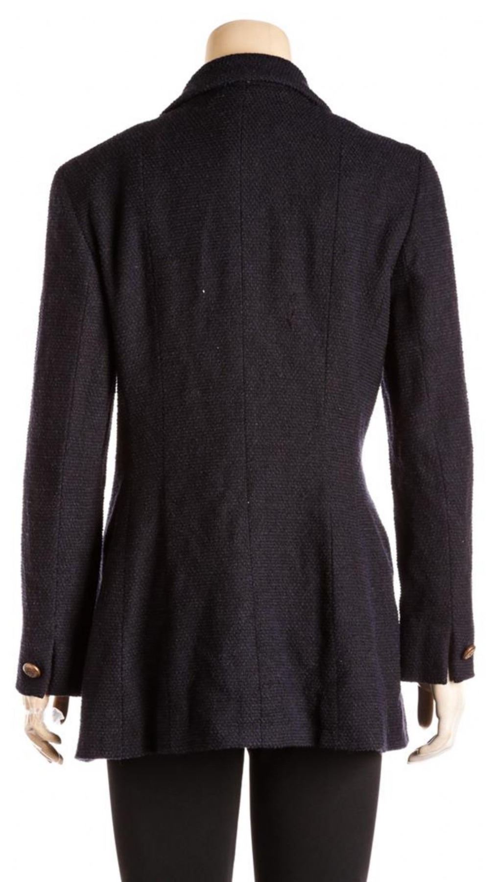 One Chanel Navy Blue Tweed Mid- Jacket. From the C collection. Navy and black Chanel tweed jacket, notched collar, structured shoulders, dual side pockets, silver-tone chain at interior hem CC button at cuffs and at center front.