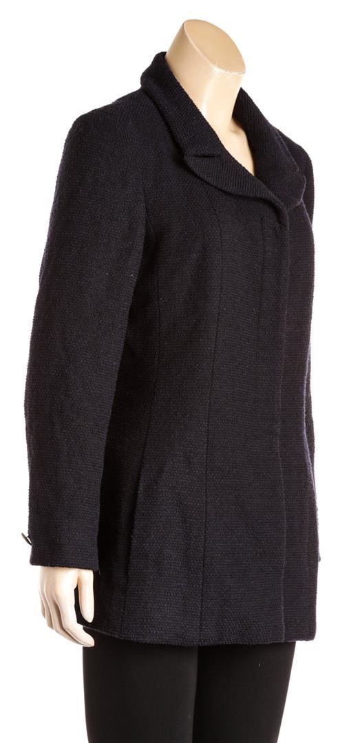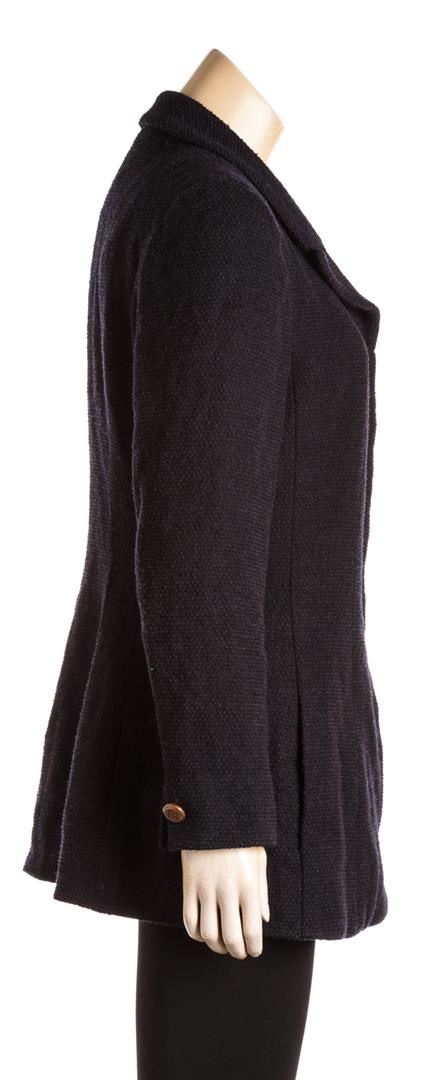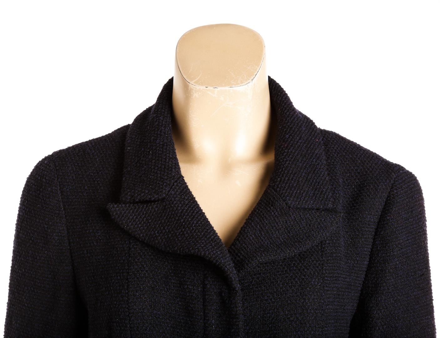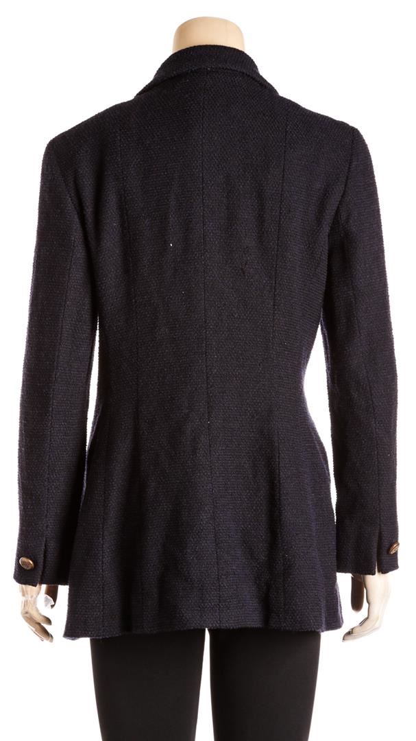 From the 01C collection. Navy and black Chanel tweed jacket, notched collar, structured shoulders, dual side pockets, silver-tone chain at interior hem CC button at cuffs and at center front.