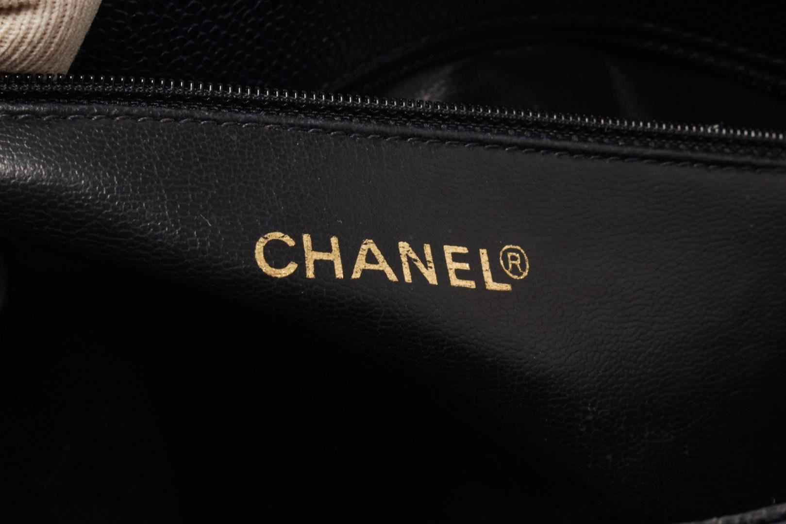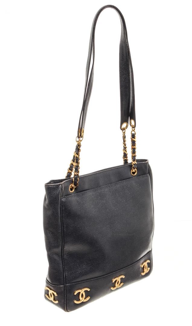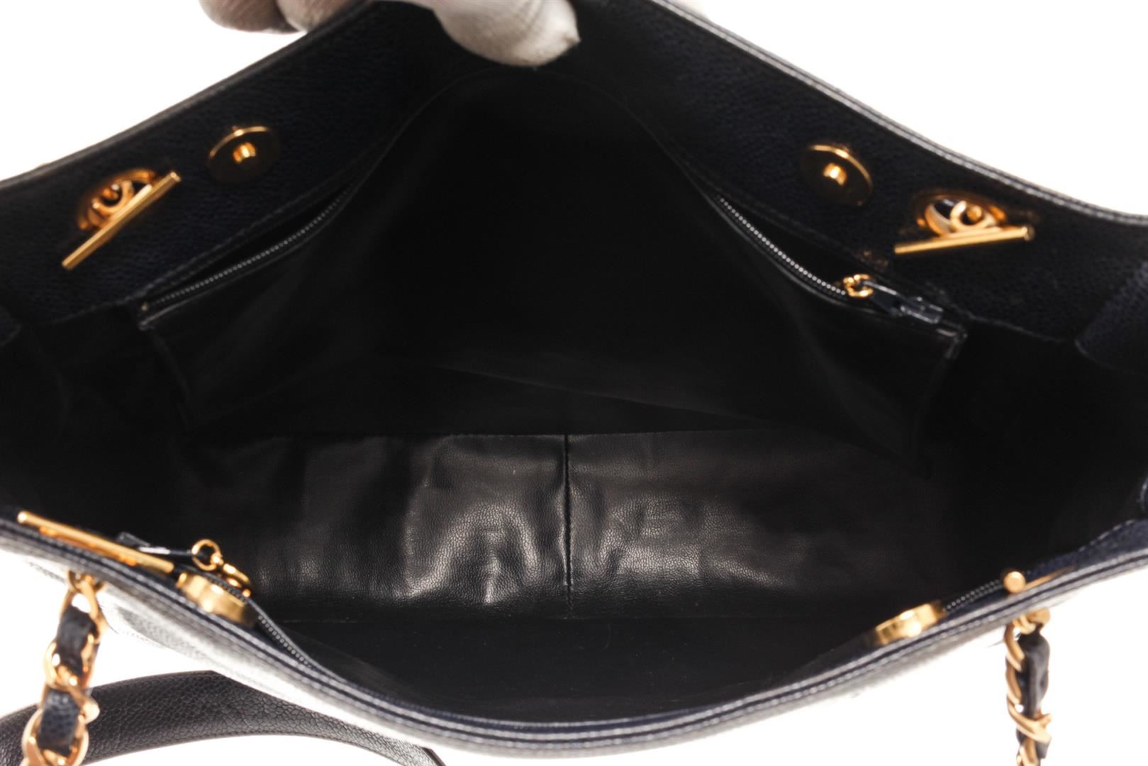 One Chanel Navy Caviar Leather Triple CC Shoulder Bag. Item is sold AS-IS. All available information is listed in the description and shown in the photo. Chanel Navy Caviar Leather Triple CC Shoulder Bag with caviar leather, this shoulder bag features tall leather shoulder straps with woven-in chain details, iconic gold CC logo hardware at its base, front pocket, and gold-tone hardware accents. Its top snap closure opens to a black leather interior with side zip pockets Height: 11 in (27.94 cm), Width: 12 in (30.48 cm), Depth: 3.5 in (8.89 cm)