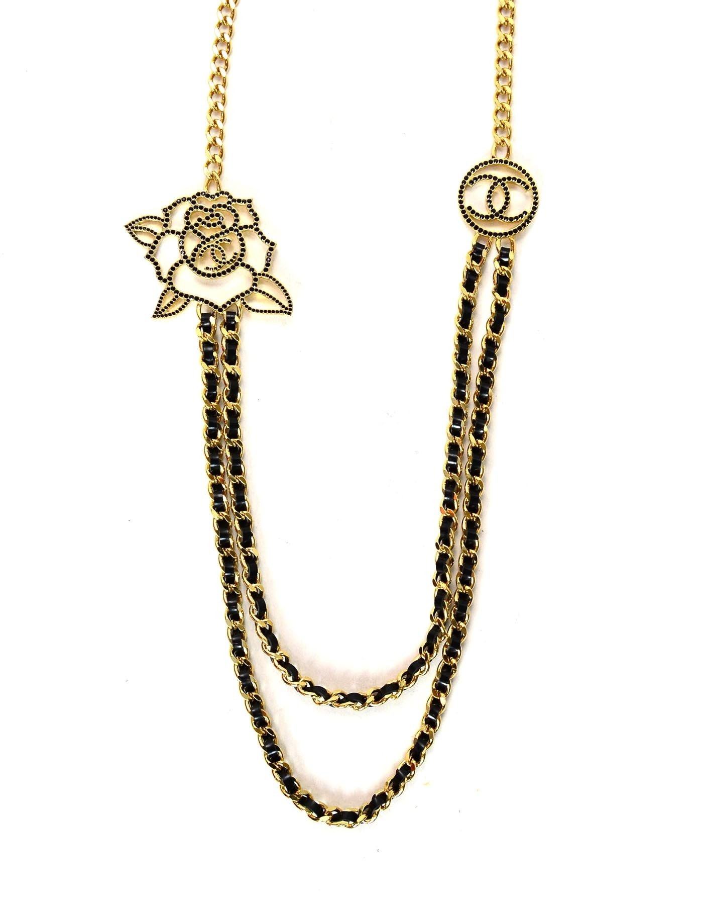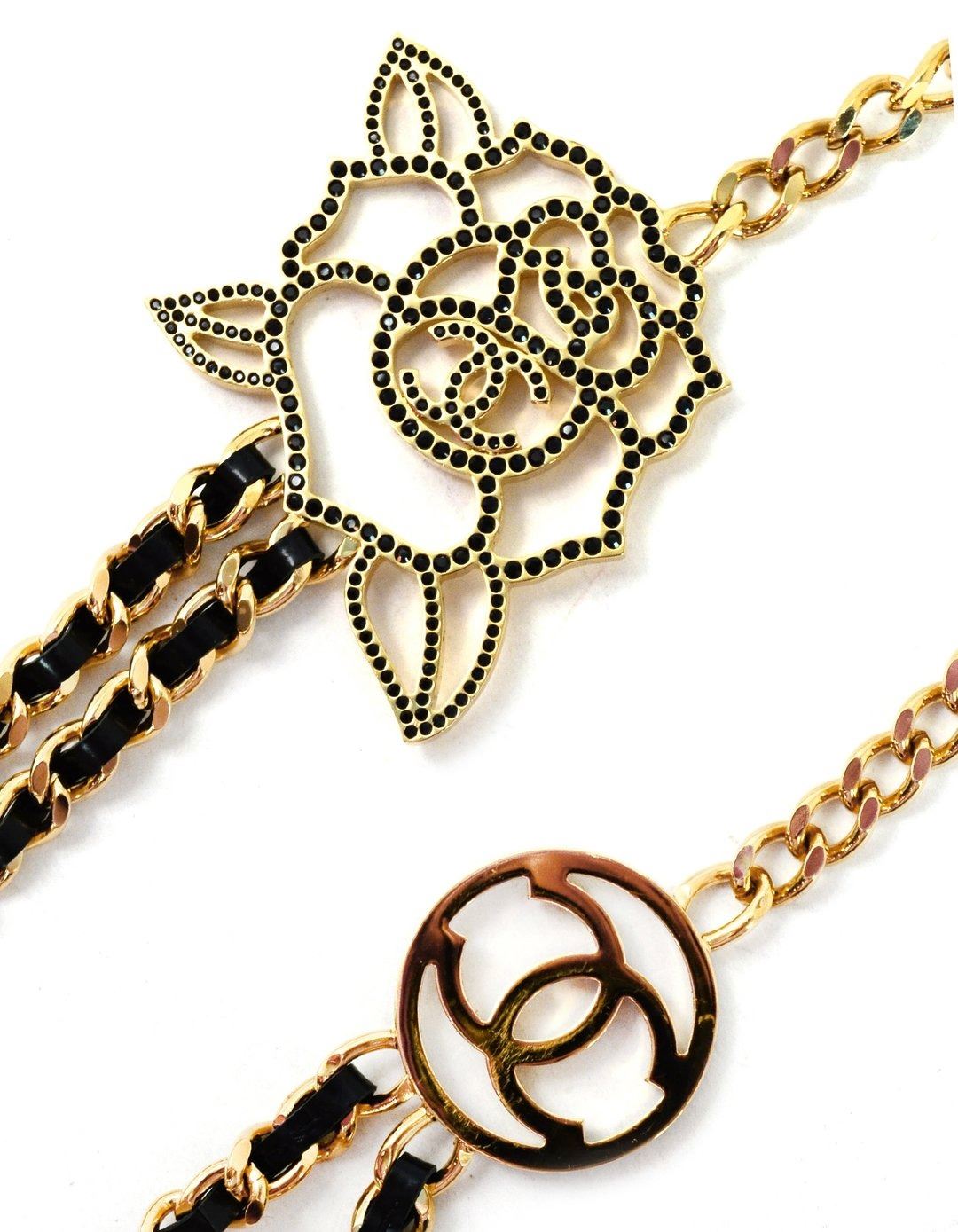 Chanel 2017 Black/Gold Leather Laced Necklace W/ Crystal CC & Camelia
