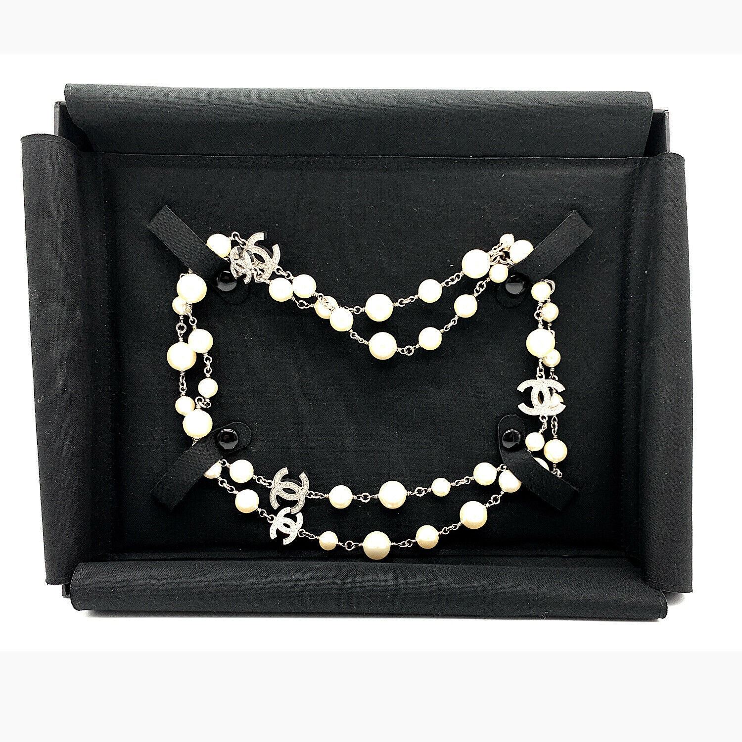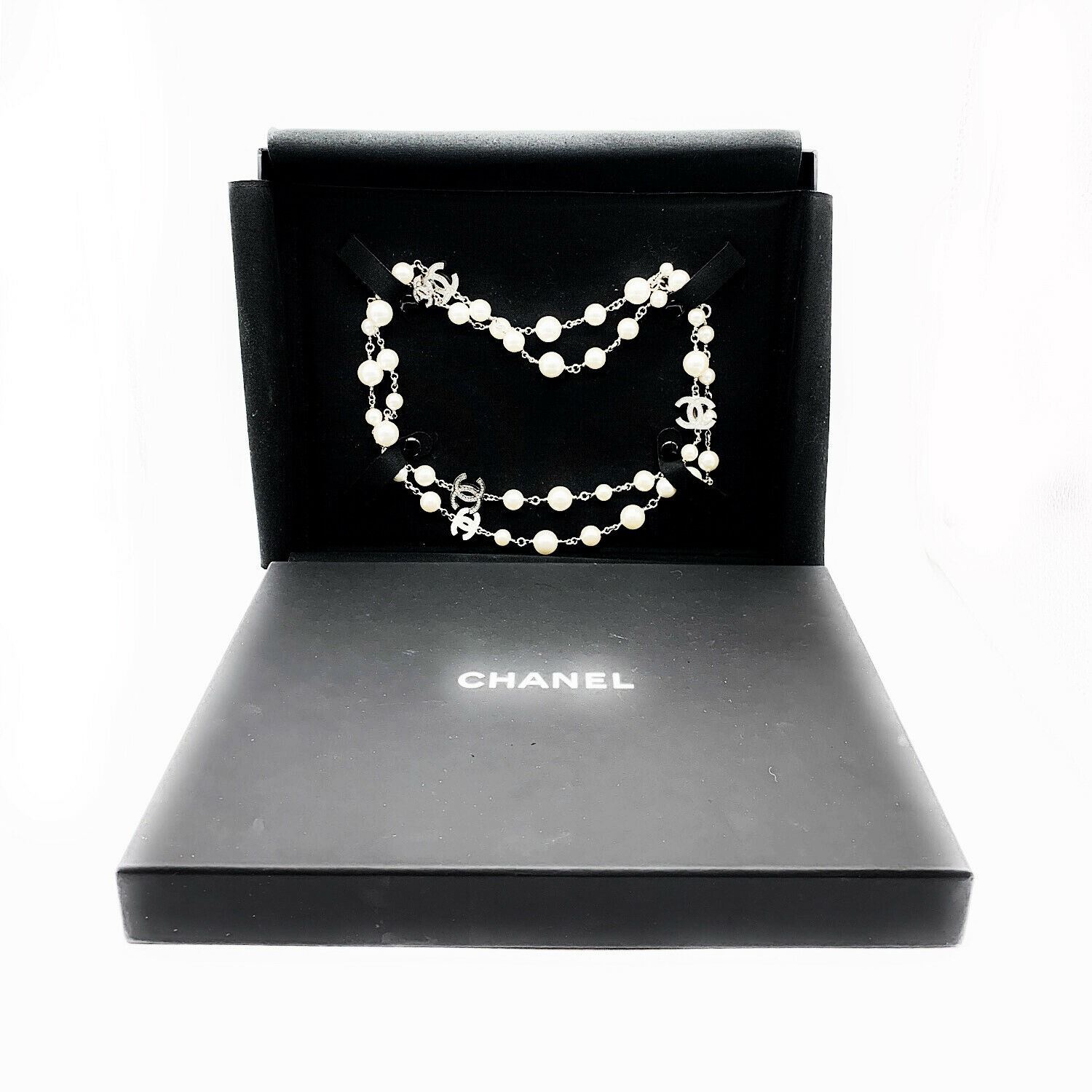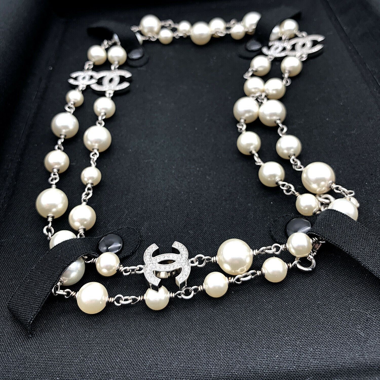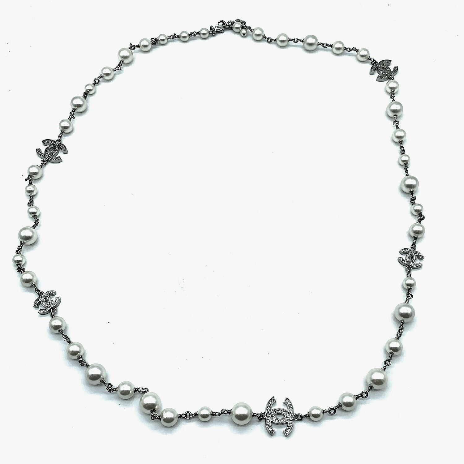 Long strand of fine various sized faux pearls separated by silver toned links and silver set Chanel CC medallions encrusted with crystals. Worn low towards the waist or doubled around the collar.