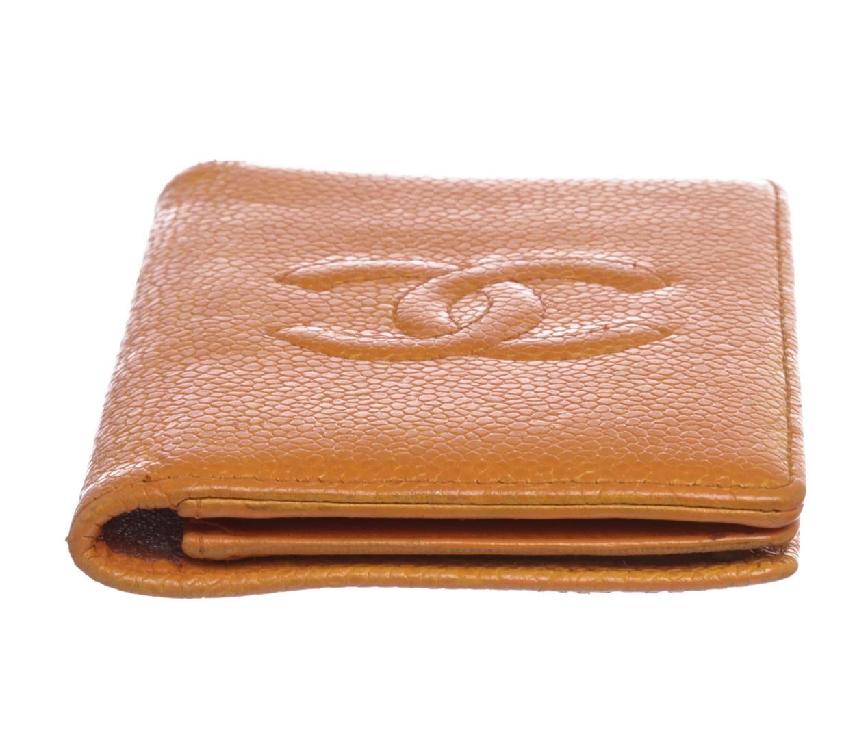 Overall flap bifold closure. Interior is leather lined and contains six credit card slip pockets. Exterior contains CC stitching on back.