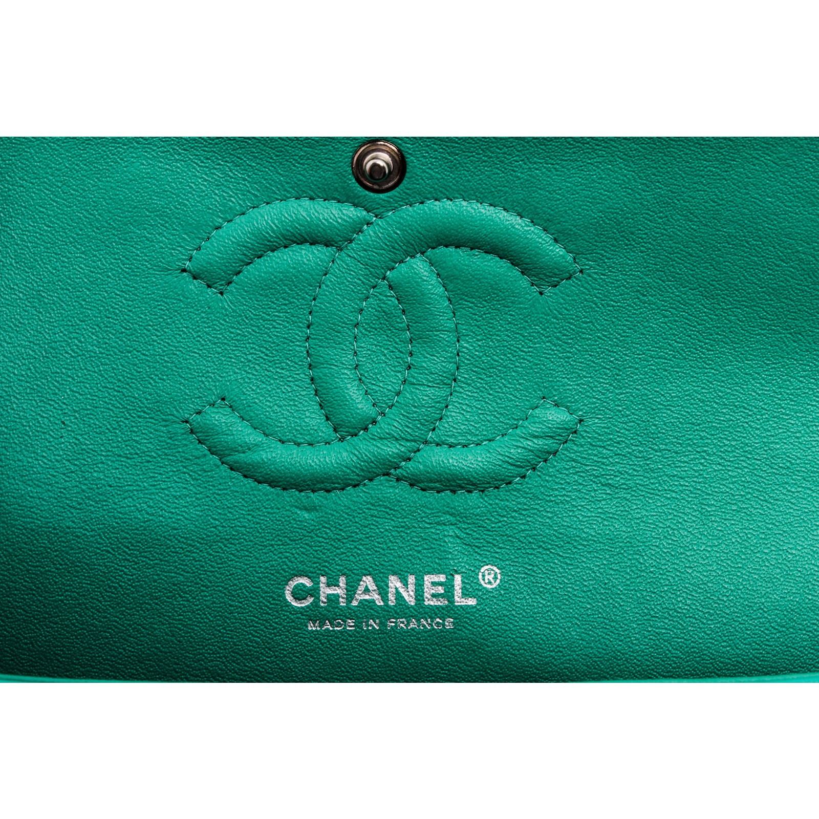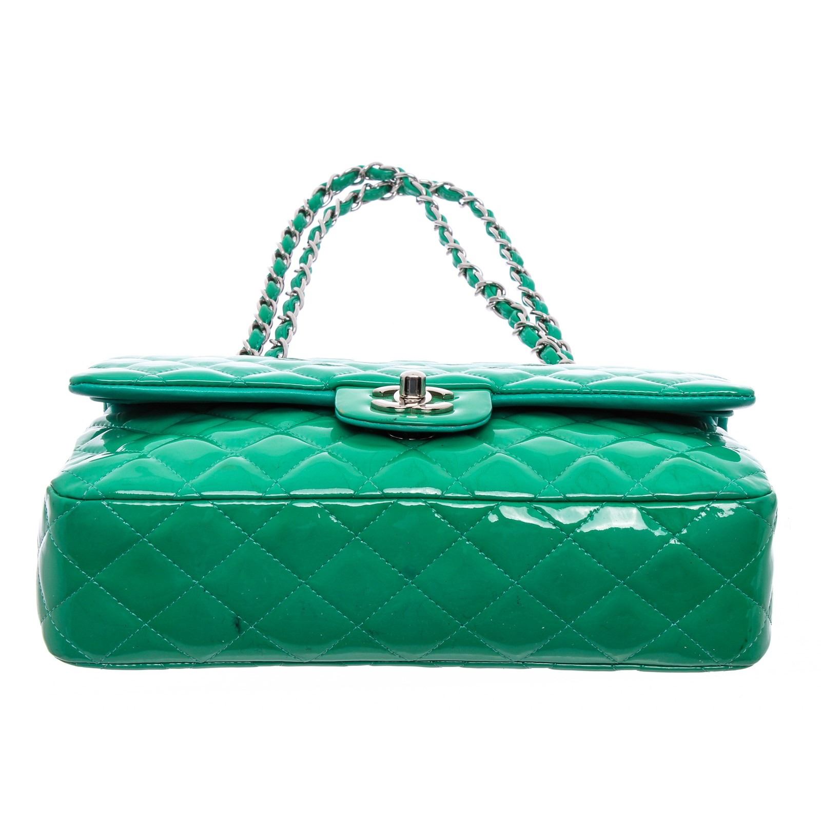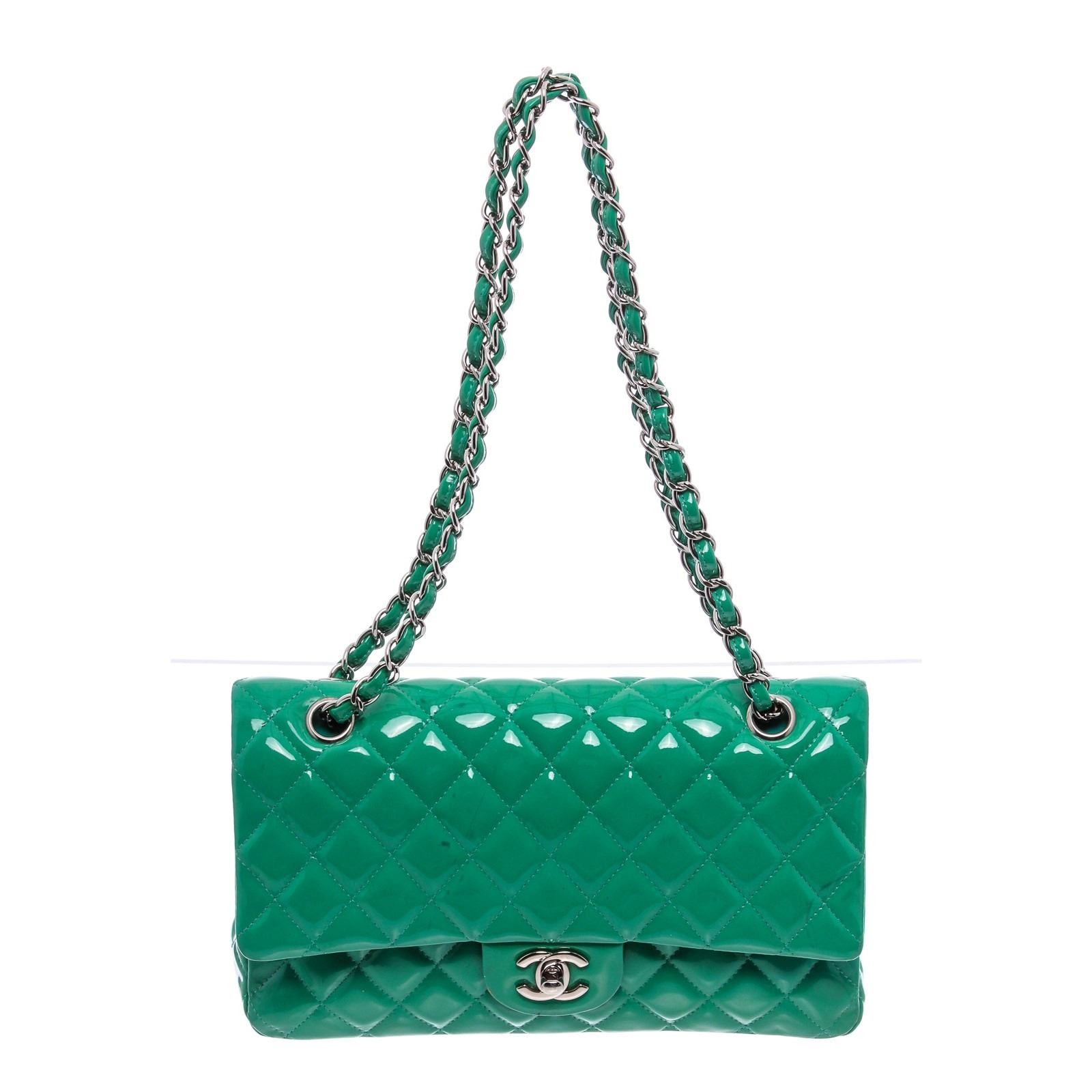 Green quilted patent leather Chanel Classic Medium Double Flap bag with silver-tone hardware, convertible chain-link and patent leather shoulder strap, single patch pocket at back, single zip pocket at front flap underside, three interior compartments; two with snap closure at flap, tonal leather interior, dual interior slit pockets and CC turn-lock closure at front flap.