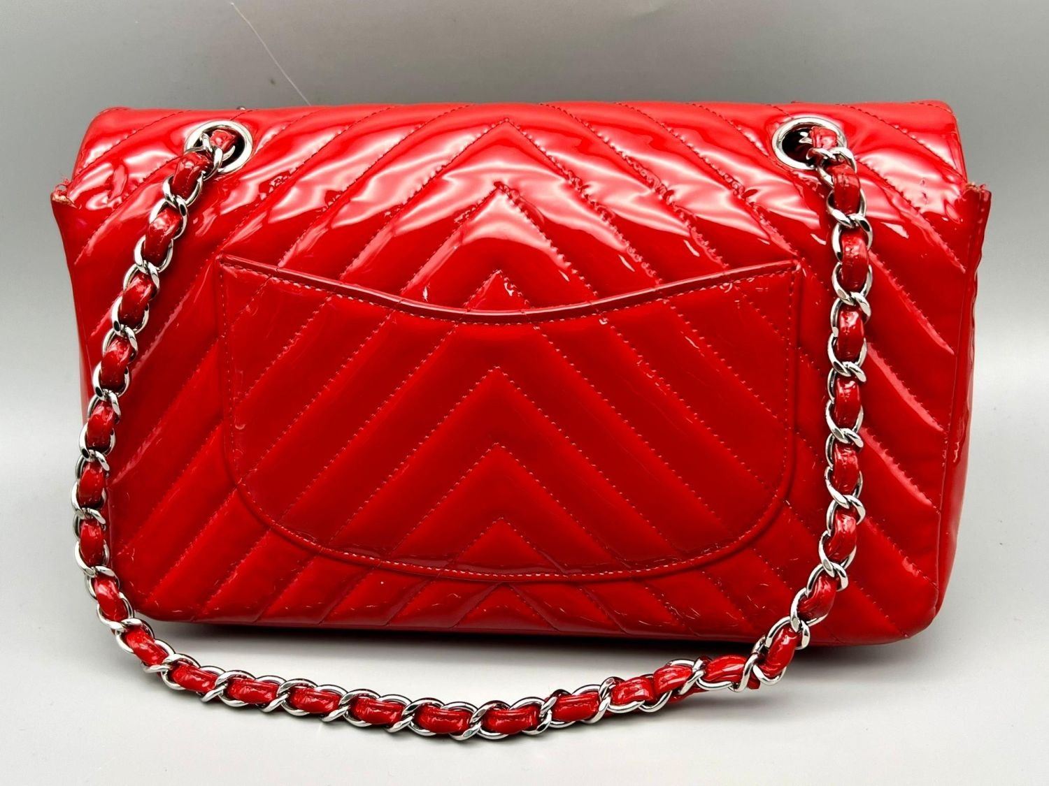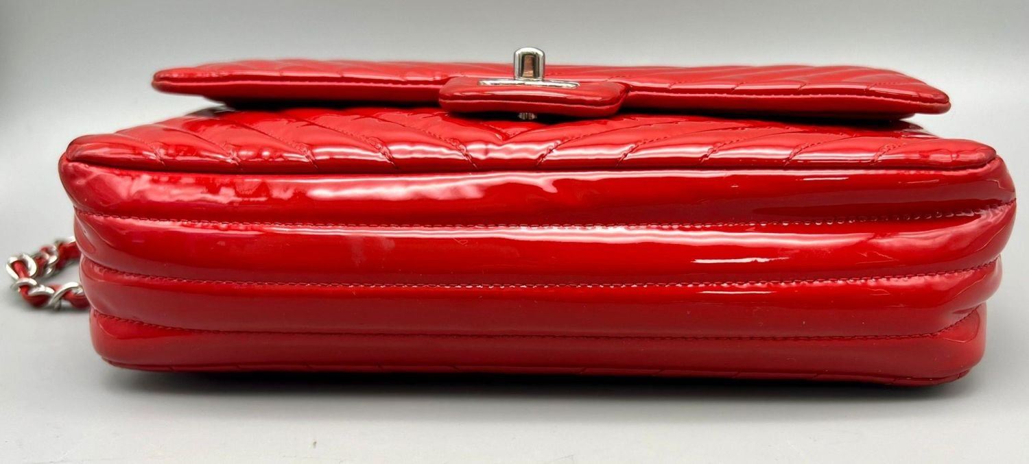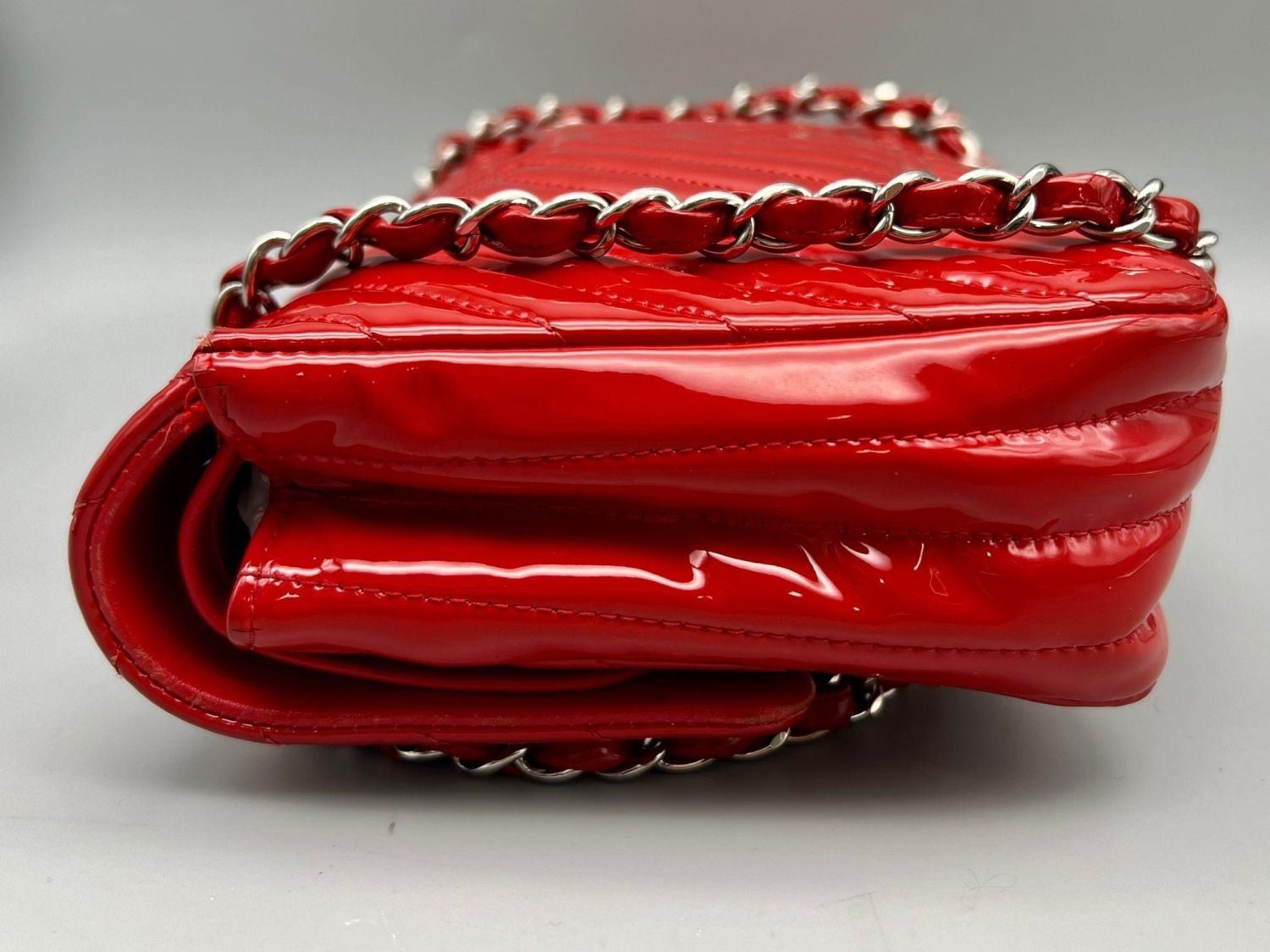 Bright red patent leather quilted exterior. Classic Chanel logo silver-tone clasp. Adjustable handle that extends to shoulder. Red leather interior with multiple open compartments.