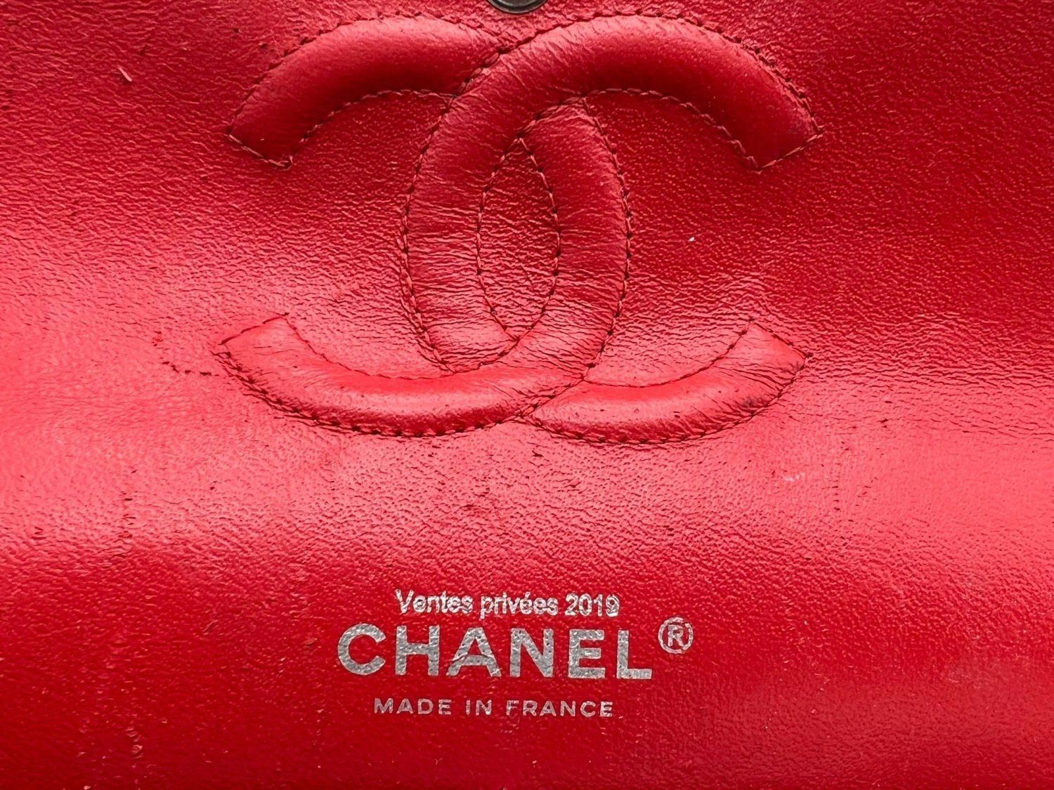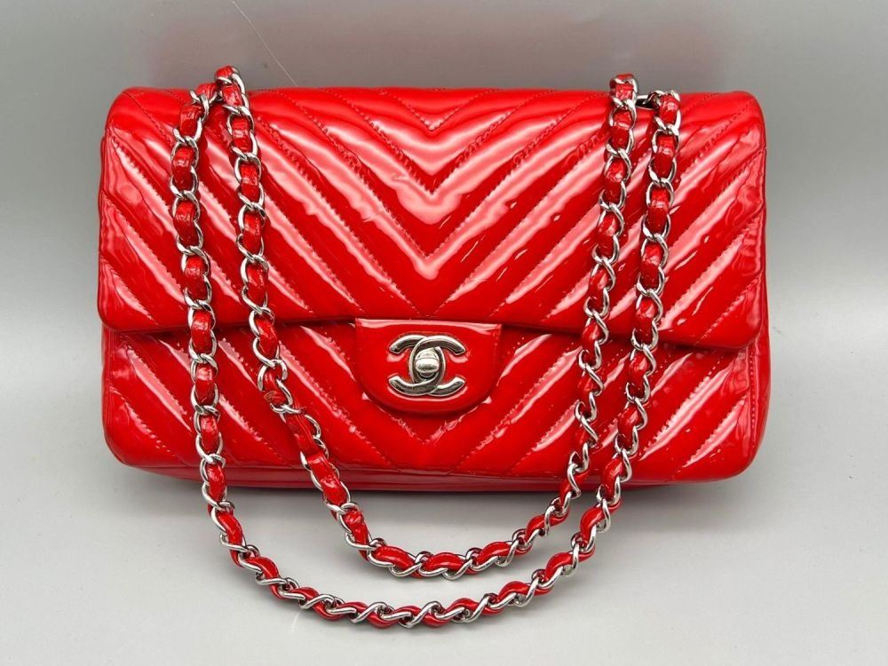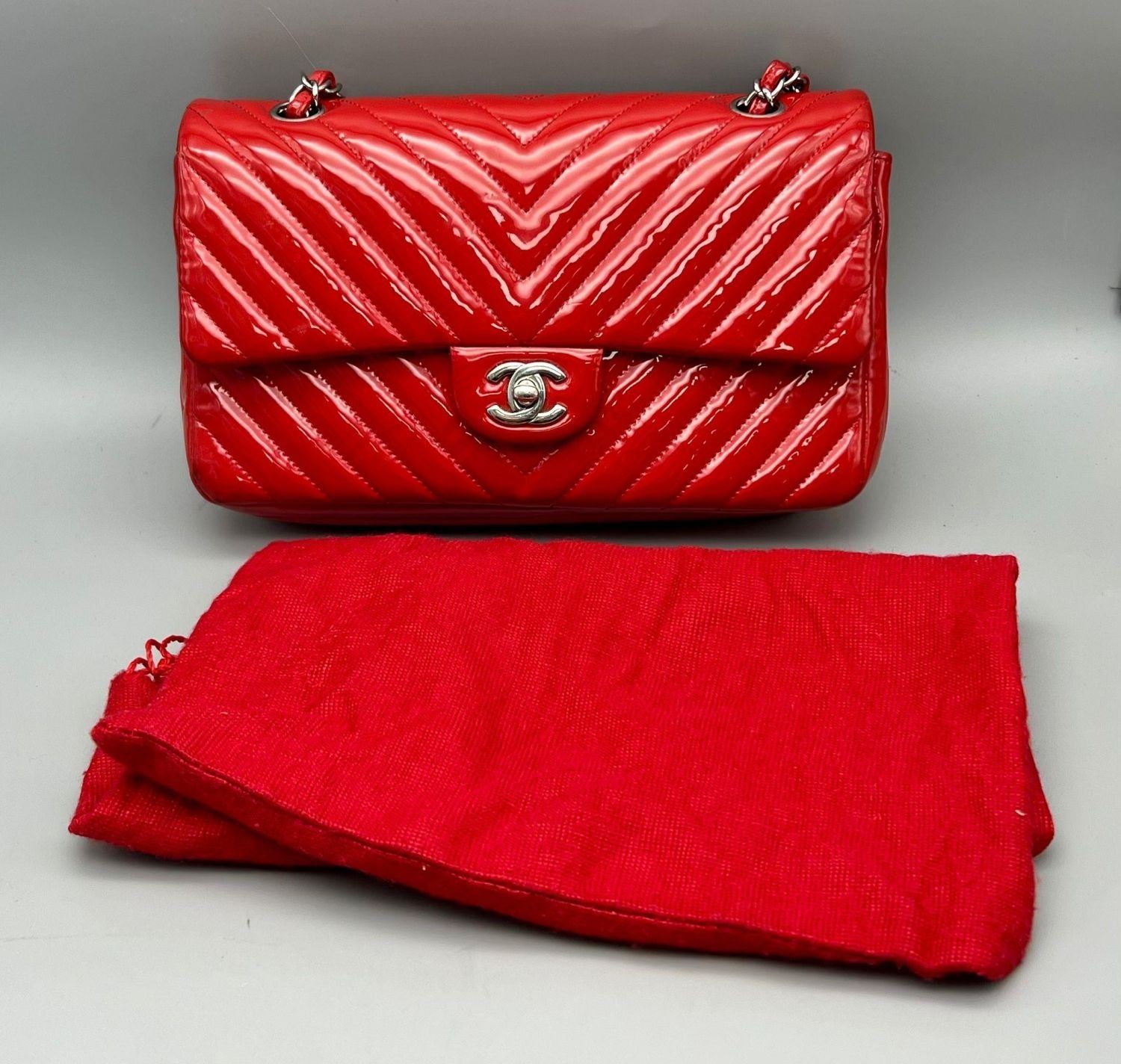 Bright red patent leather quilted exterior. Classic Chanel logo silver-tone clasp. Adjustable handle that extends to shoulder. Red leather interior with multiple open compartments.
