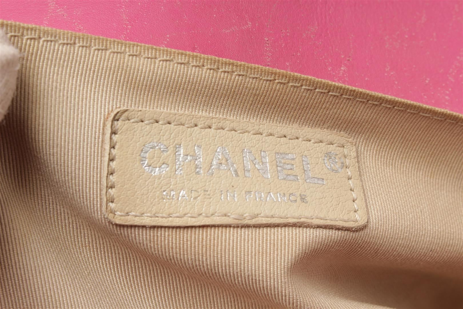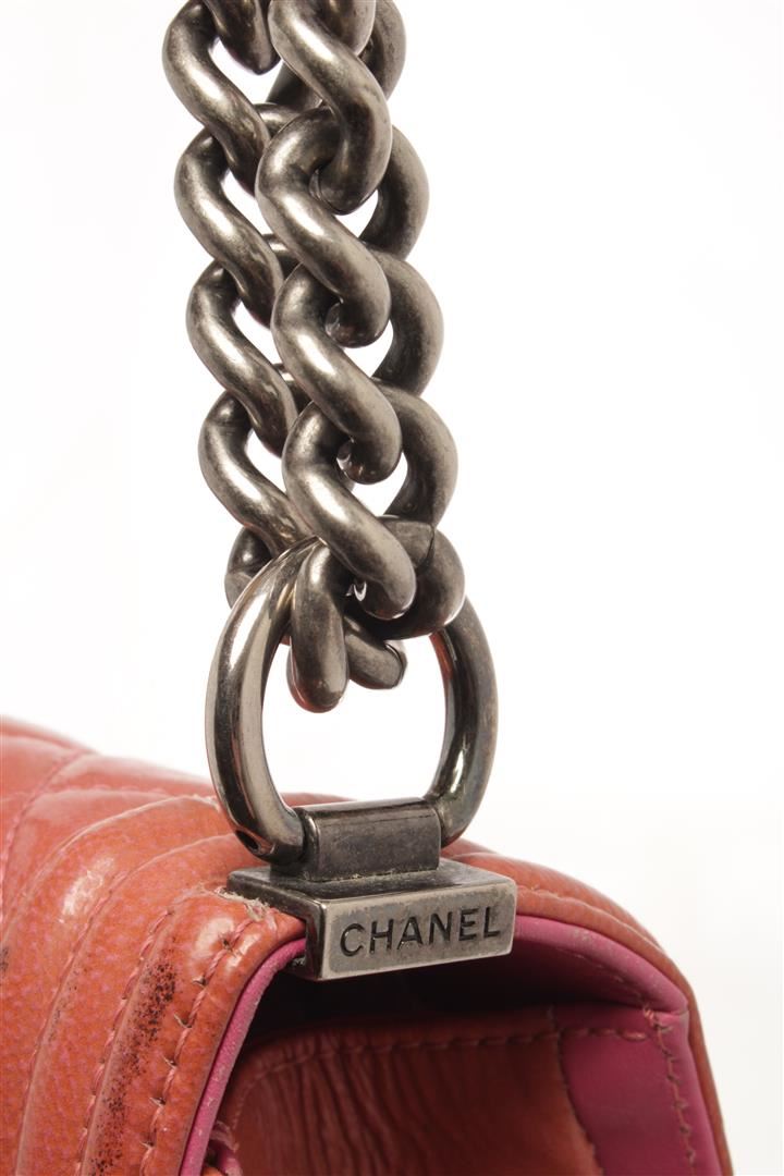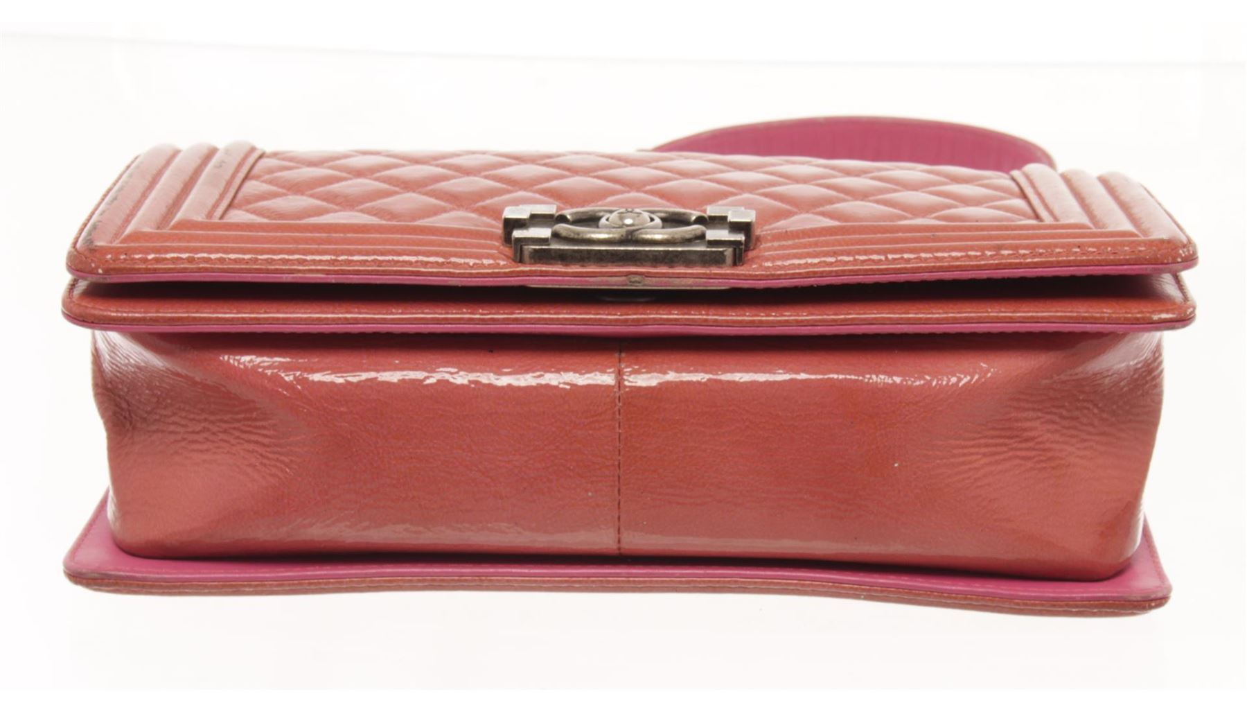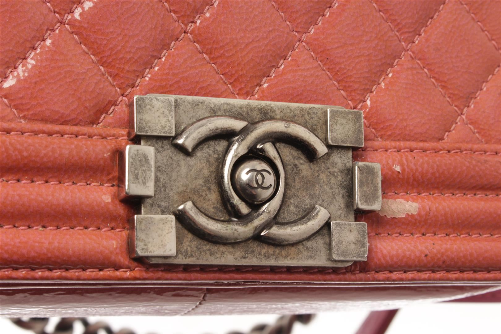 One Chanel Peach Lambskin Large Boy Shoulder Bag. Item is sold AS-IS. All available information is listed in the description and shown in the photo. Chanel Peach Lambskin Large Boy Shoulder Bag with silver-tone hardware, patent leather, quilted, leather/chain shoulder strap, fabric lining, interior pocket, snap closure. There are some defects on the patent leather, stains on the fabric lining. Please refer to photos. Depth 3.3 in, Height 6.1 in, Strap 20.5 in, Width 9.8 in/ Depth 8.5 cm, Height 15.5 cm, Strap 52 cm, Width 25 cm
