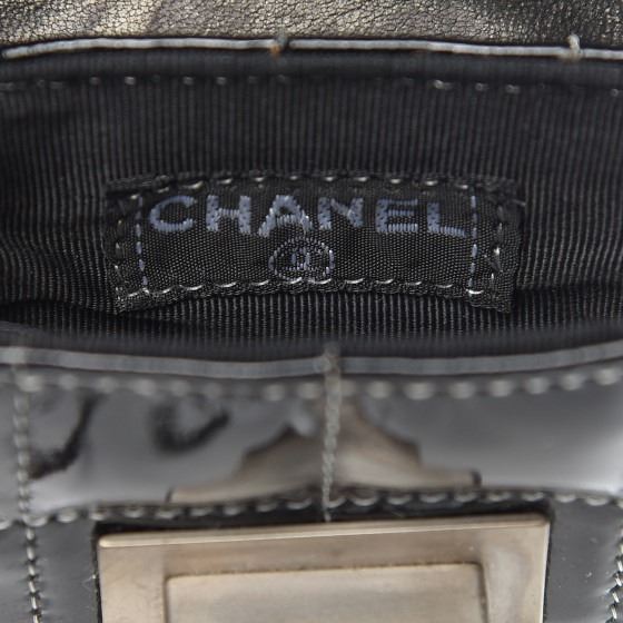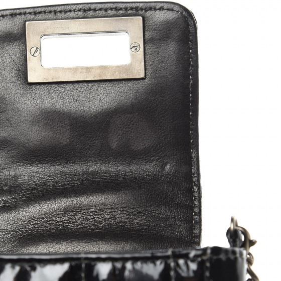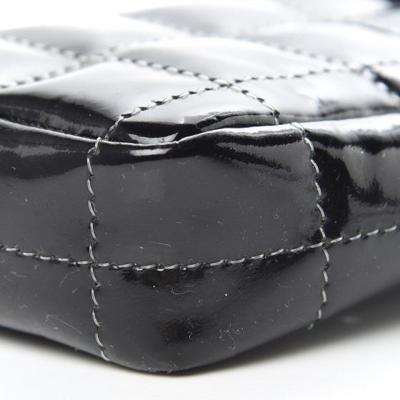 Cross body baguette is crafted of square quilted calfskin patent leather in black. The bag features a cross body matte silver shoulder strap and a cross over flap that closes with with a matte silver squared Mademoiselle turn lock.