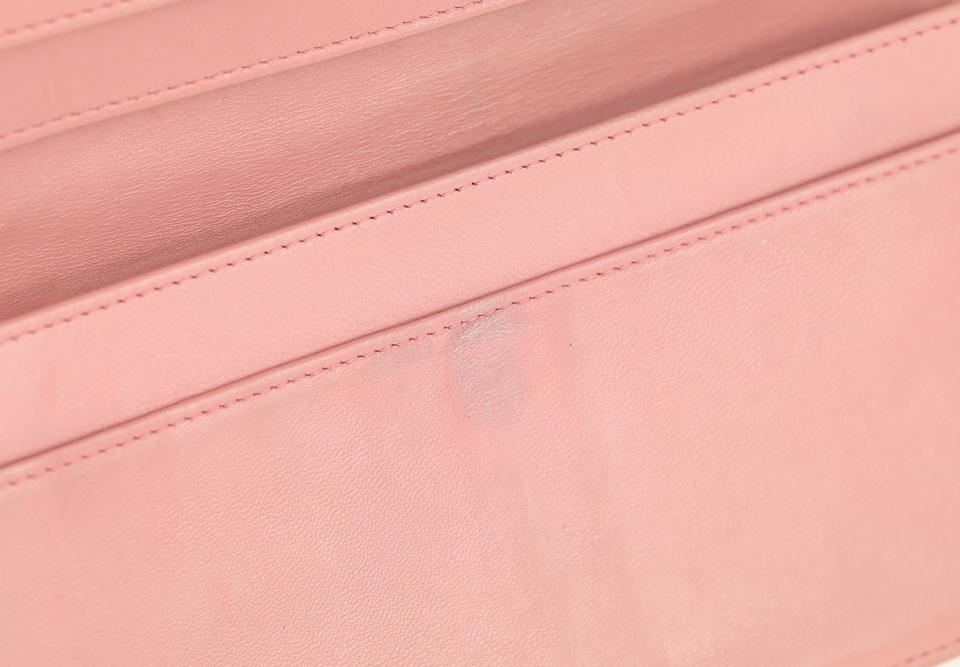 Chanel Camellia Leather Wallet Fold over and pull snap closure Silver-tone hardware Pink leather with Camellia embossed details 7 Interior credit card slots 3 Long bill slots 1 Gusset compartment along the main compartment The exterior has a gusset coin pocket with a snap-flap closure Made in Italy