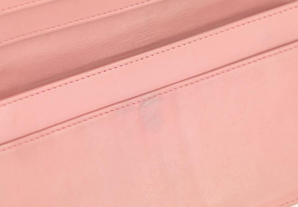 Chanel Camellia Leather Wallet Fold over and pull snap closure Silver-tone hardware Pink leather with Camellia embossed details 7 Interior credit card slots 3 Long bill slots 1 Gusset compartment along the main compartment The exterior has a gusset coin pocket with a snap-flap closure Made in Italy Measurements: Length: 7.5 in / 19 cm Width: 0.95 in / 2 cm 4.25 in / 11 cm Condition: Pre-Owned Good overall, please see photographs for detail.