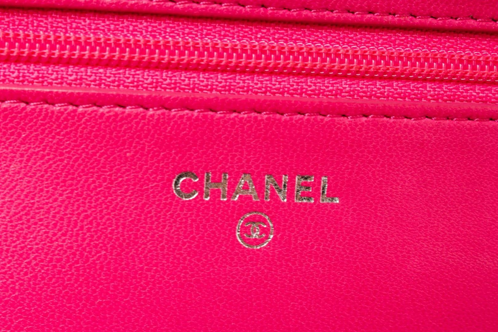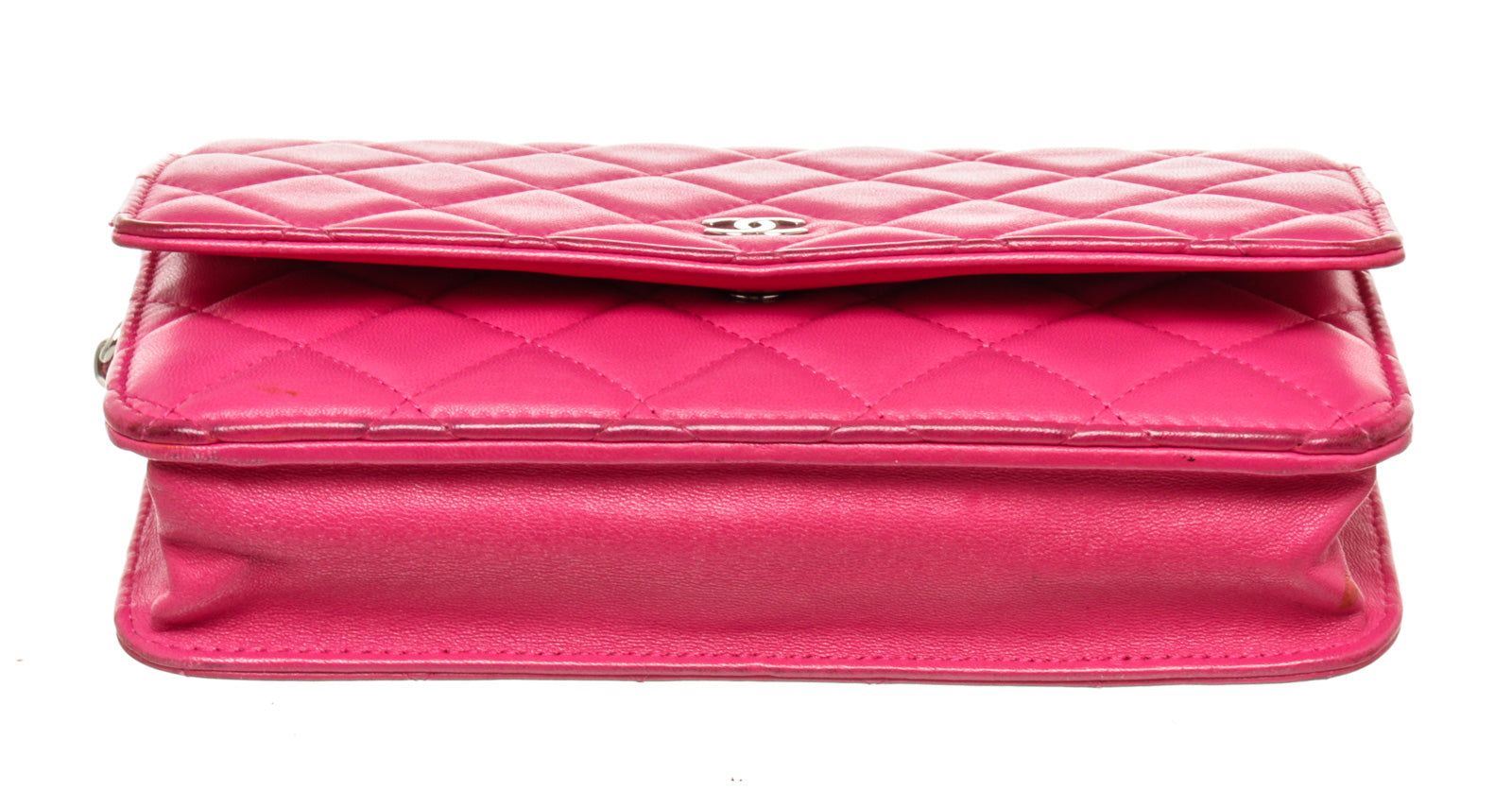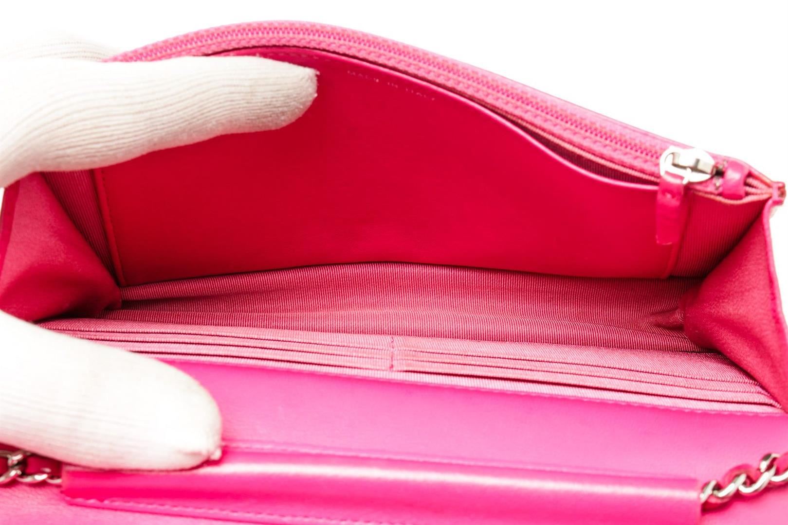 Chanel Pink Caviar Leather WOC Chain Shoulder Bag with silver-tone hardware, single chain-link and leather shoulder strap, single exterior patch pocket at back, dual pockets at flap underside; one with zip closure, tonal leather lining, dual interior comp
