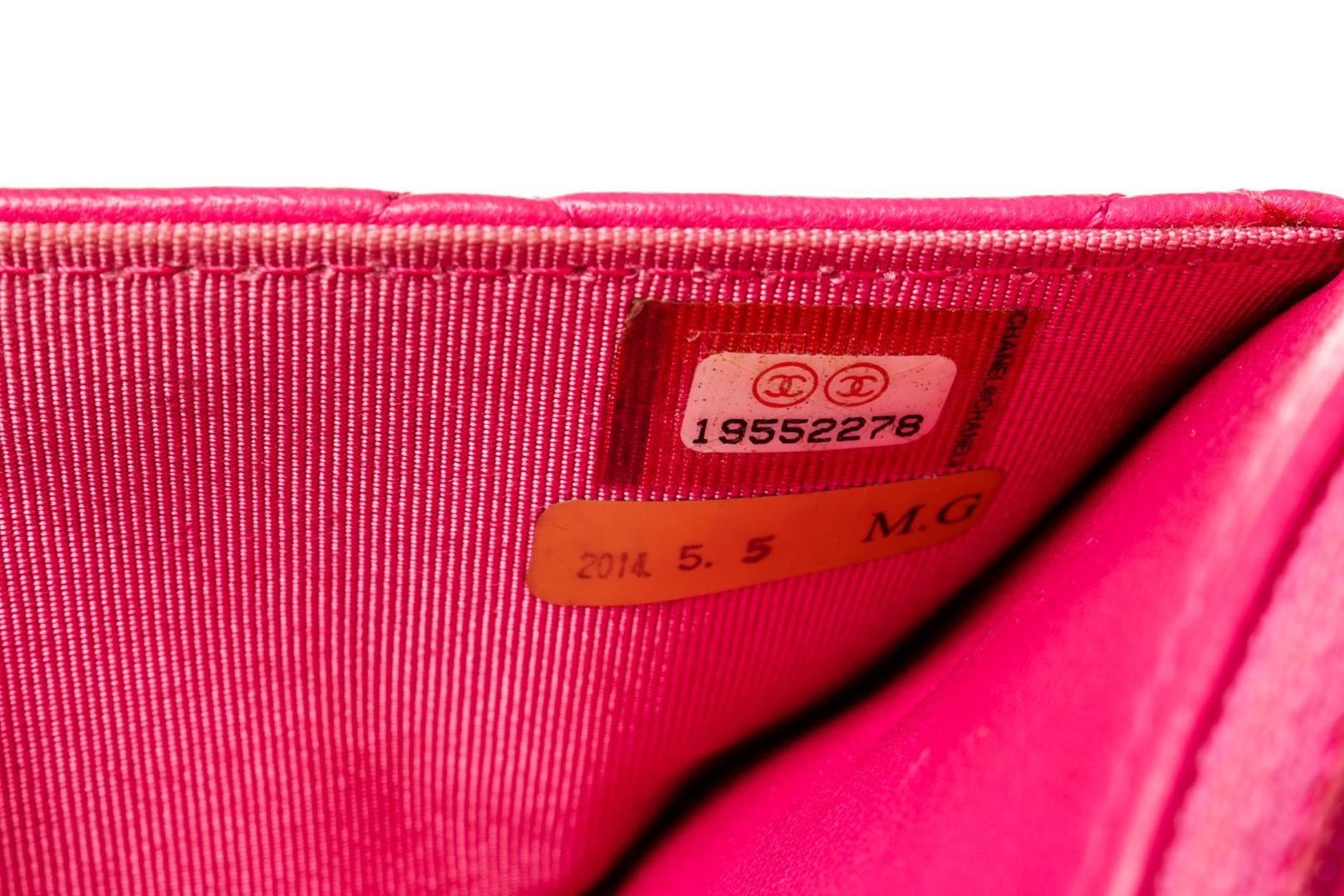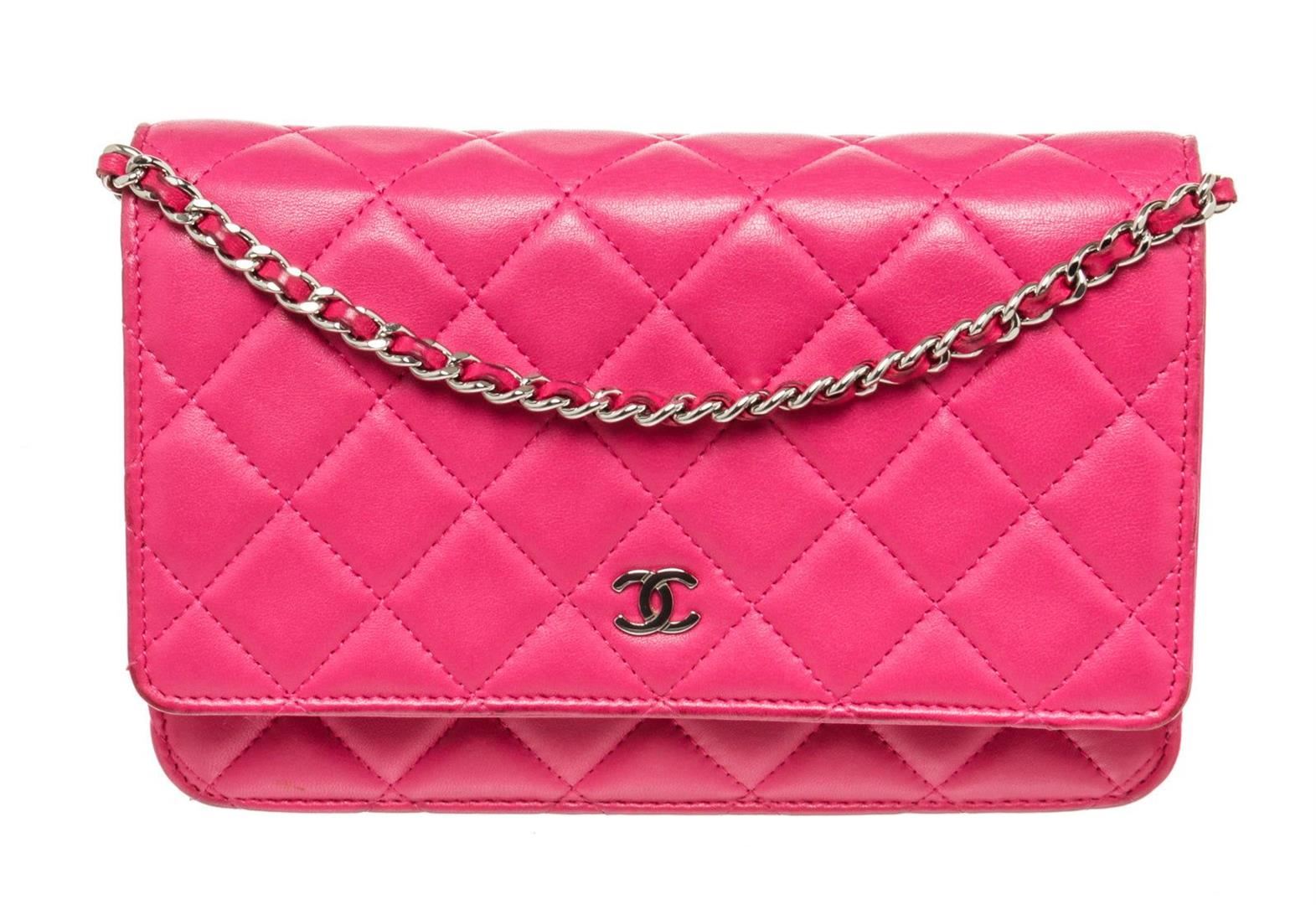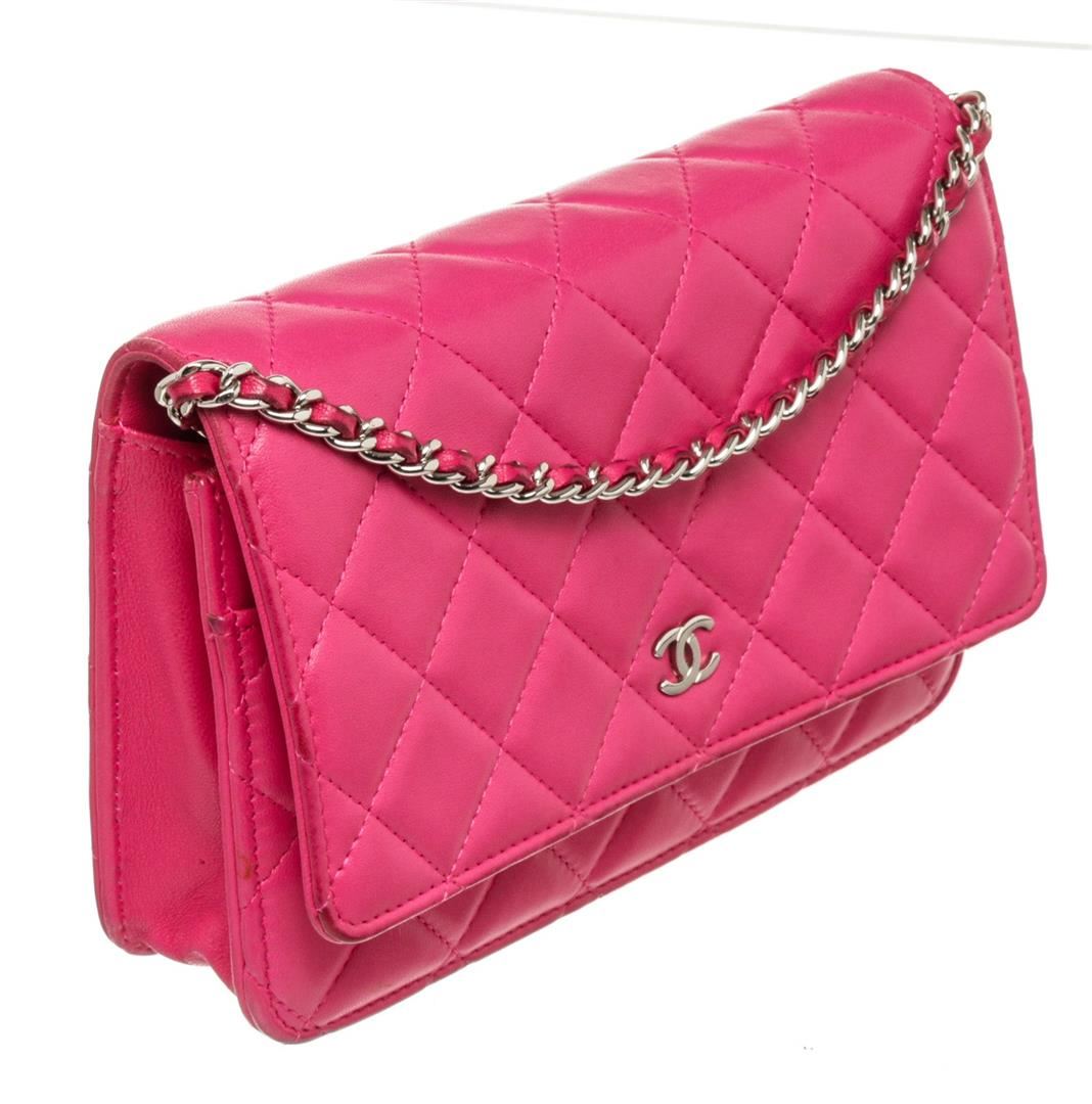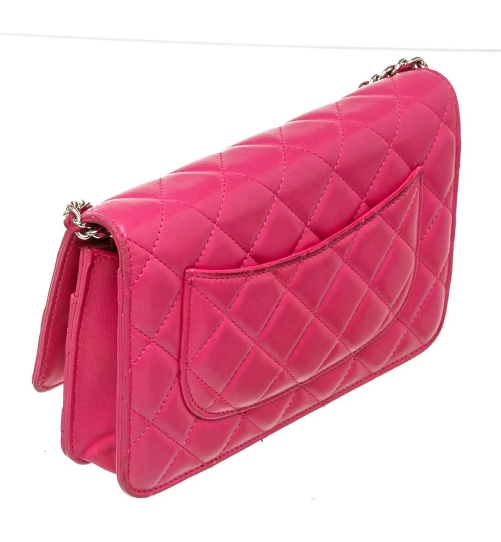 Chanel Pink Caviar Leather WOC Chain Shoulder Bag with silver-tone hardware, single chain-link and leather shoulder strap, single exterior patch pocket at back, dual pockets at flap underside; one with zip closure, tonal leather lining, dual interior comp