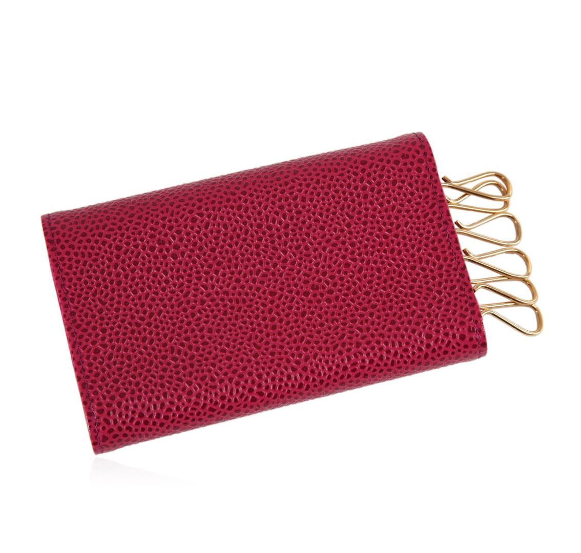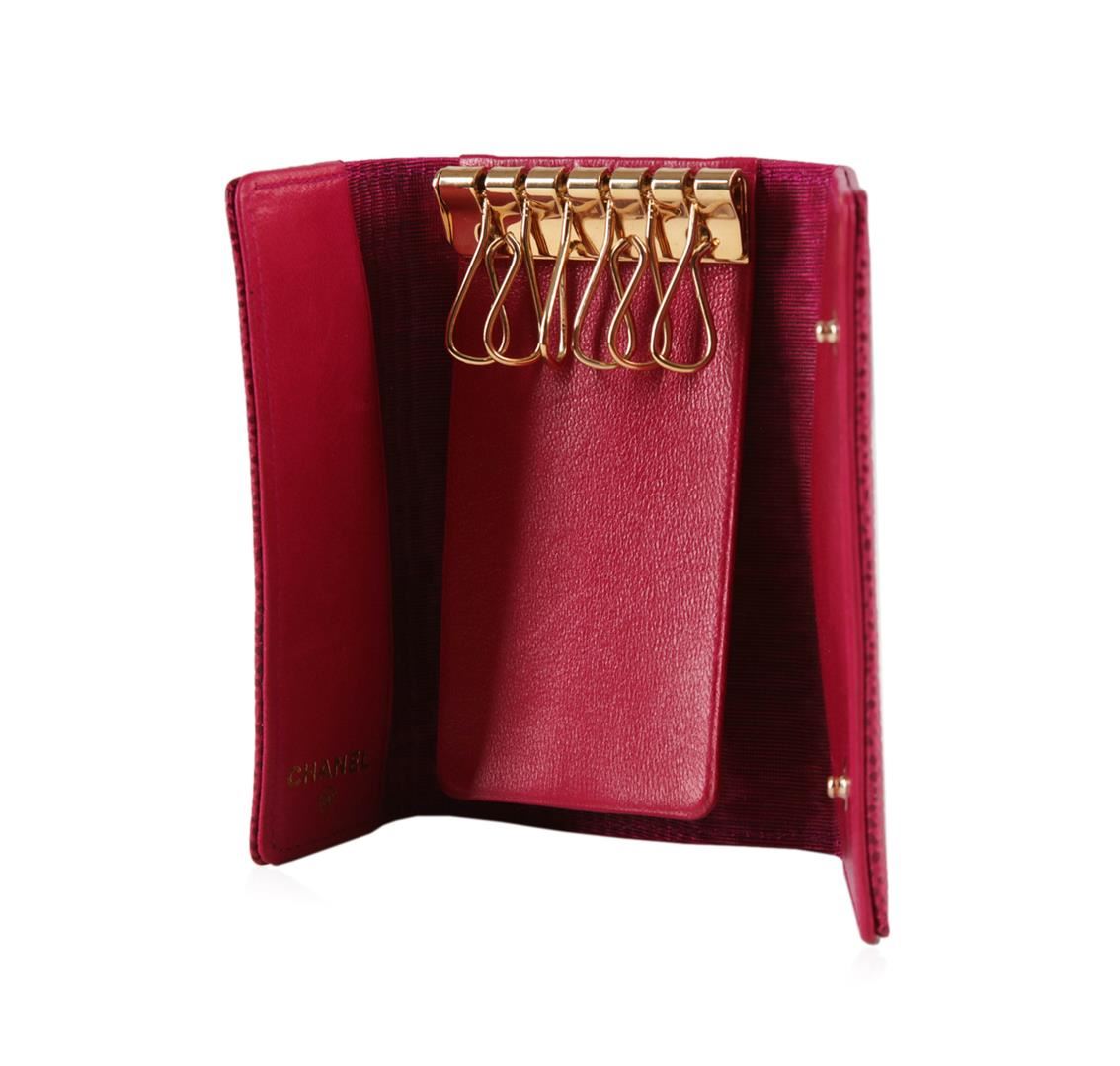 One Chanel pink leather key holder, measuring approximately 2.75 by 4.25 inches. The key holder is in good condition and has two slots for cards and six hangers for keys. Comes with a Chanel box and card of authenticity.