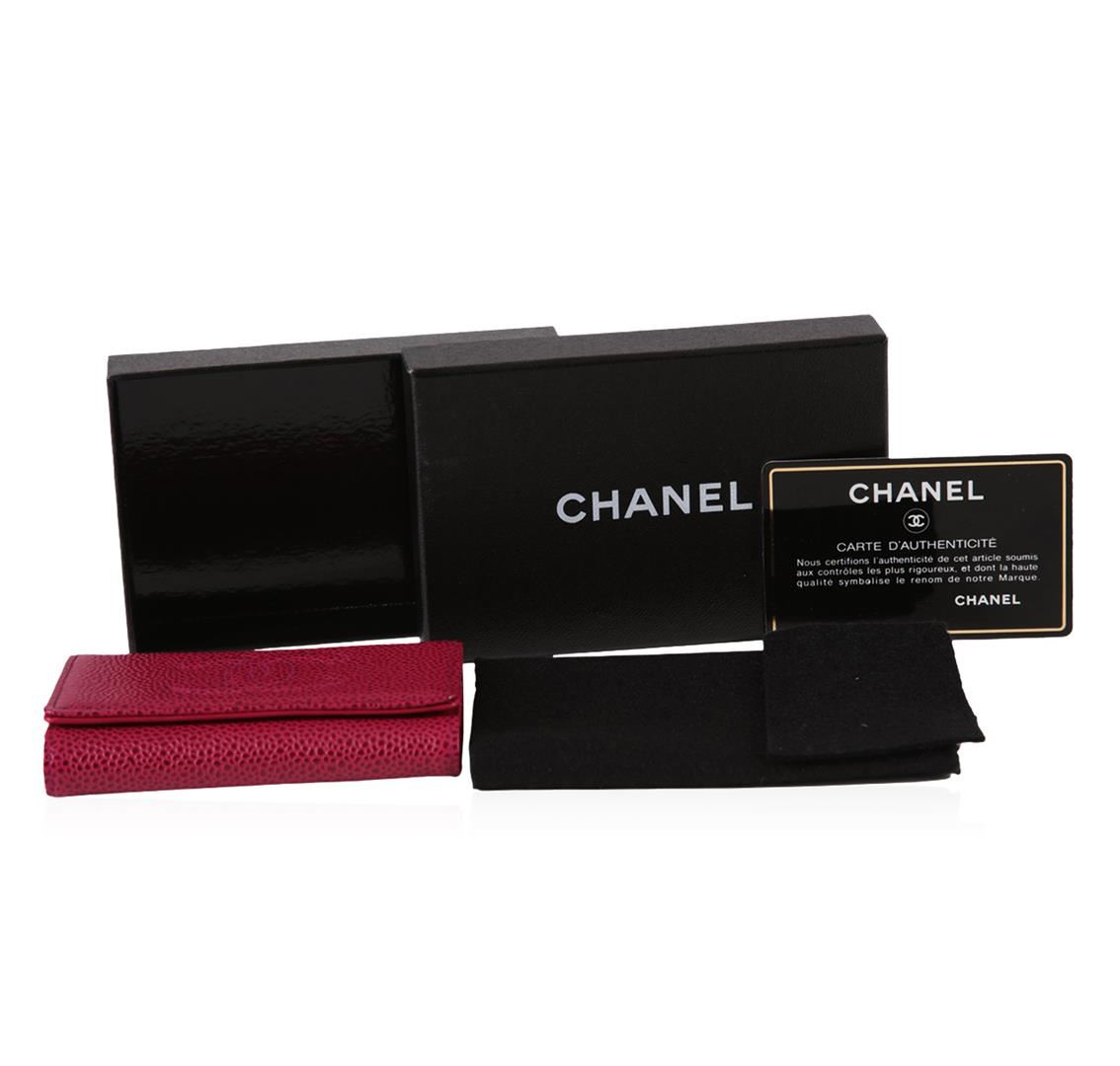 One Chanel pink leather key holder, measuring approximately 2.75 by 4.25 inches. The key holder is in good condition and has two slots for cards and six hangers for keys. Comes with a Chanel box and card of authenticity.