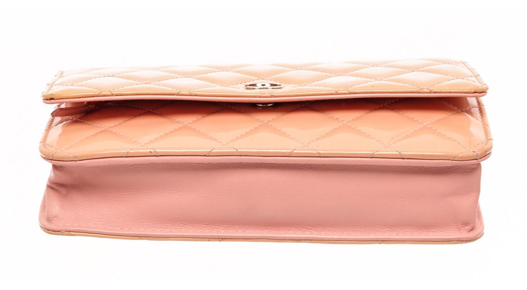 Chanel Pink Patent Leather Wallet on Chain Crossbody Bag. All available information is listed in the description and shown in the photos. chanel pink patent leather wallet on chain crossbody bag with interlocking cc logo, silver-tone hardware, chain-link shoulder strap, single exterior pocket, grosgrain lining & dual interior pockets, snap closure at front. Height: 5.25" Width: 7.75" Depth: 0.75", Shoulder Strap Drop: 15.75" / 13.33 x 19.68 x 1.90 Cm