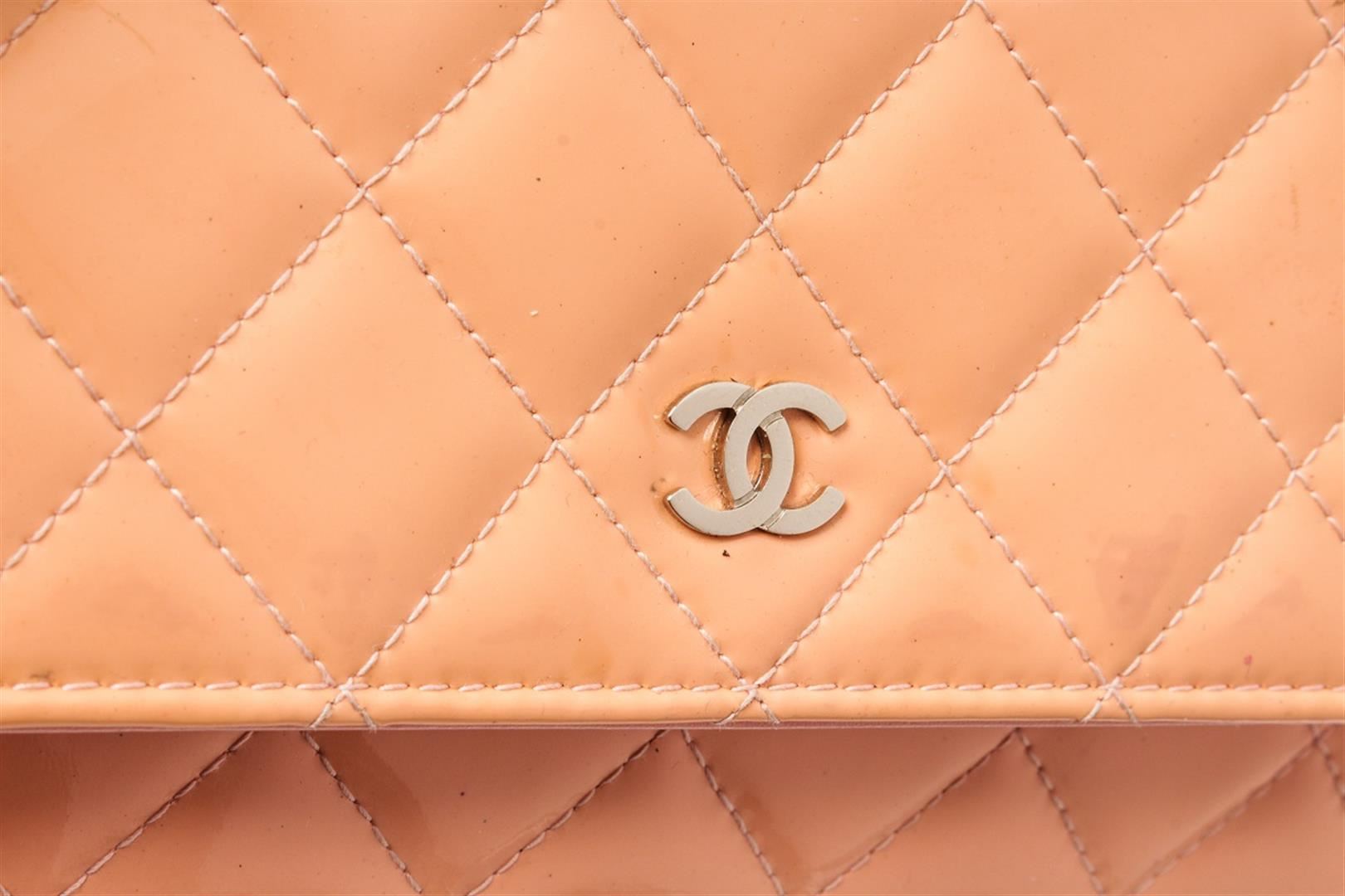 Chanel Pink Patent Leather Wallet on Chain Crossbody Bag. All available information is listed in the description and shown in the photos. chanel pink patent leather wallet on chain crossbody bag with interlocking cc logo, silver-tone hardware, chain-link shoulder strap, single exterior pocket, grosgrain lining & dual interior pockets, snap closure at front. Height: 5.25" Width: 7.75" Depth: 0.75", Shoulder Strap Drop: 15.75" / 13.33 x 19.68 x 1.90 Cm