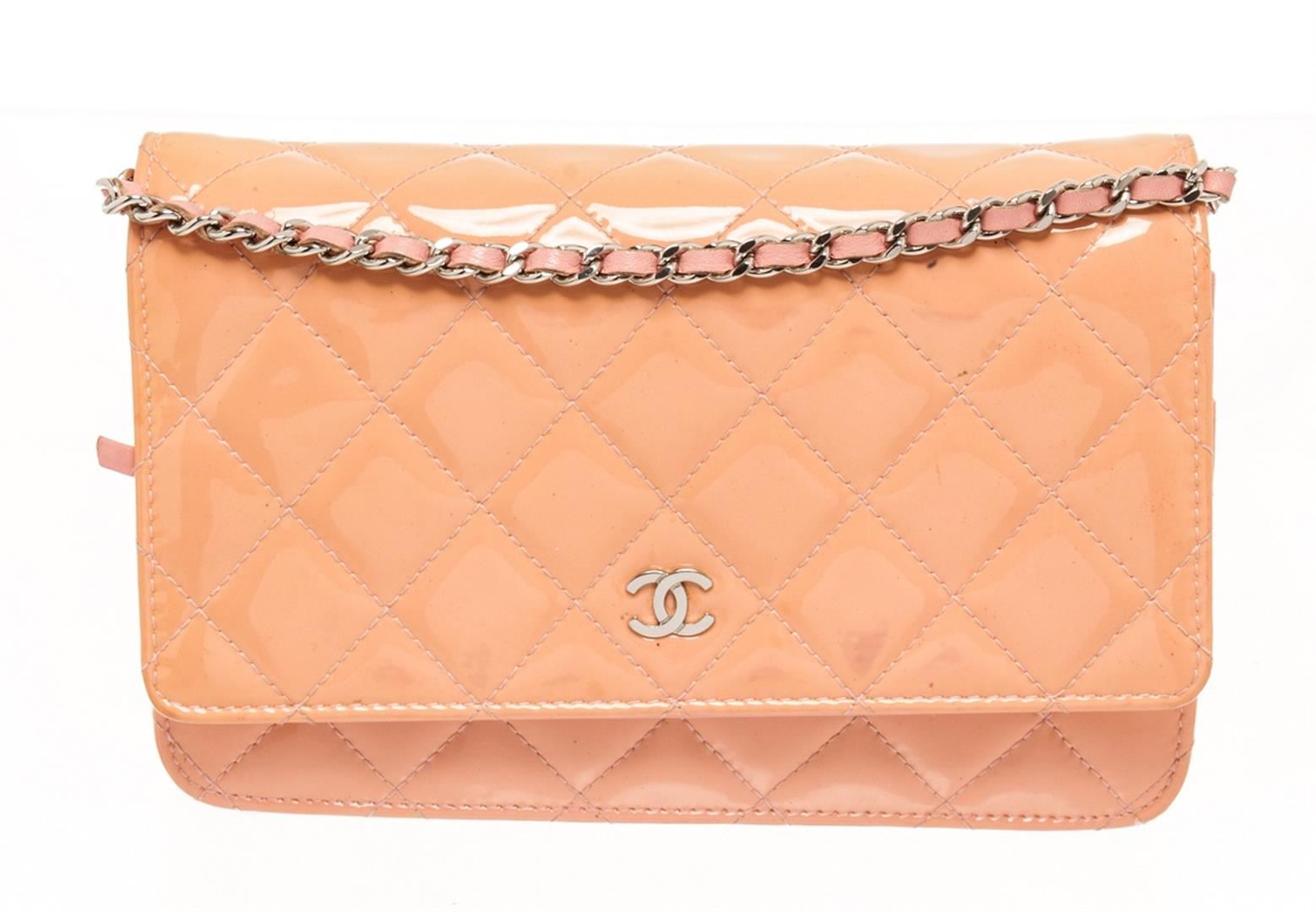 Chanel Pink Patent Leather Wallet on Chain Crossbody Bag. All available information is listed in the description and shown in the photos. chanel pink patent leather wallet on chain crossbody bag with interlocking cc logo, silver-tone hardware, chain-link shoulder strap, single exterior pocket, grosgrain lining & dual interior pockets, snap closure at front. Height: 5.25" Width: 7.75" Depth: 0.75", Shoulder Strap Drop: 15.75" / 13.33 x 19.68 x 1.90 Cm