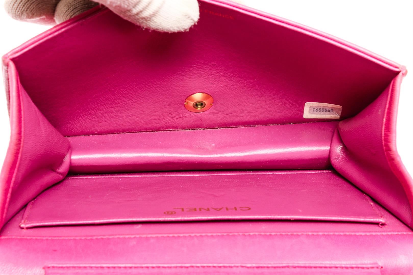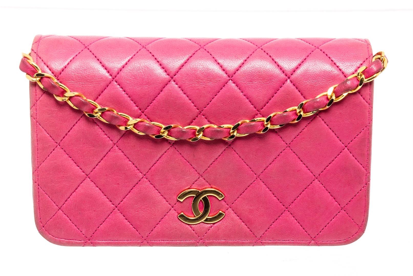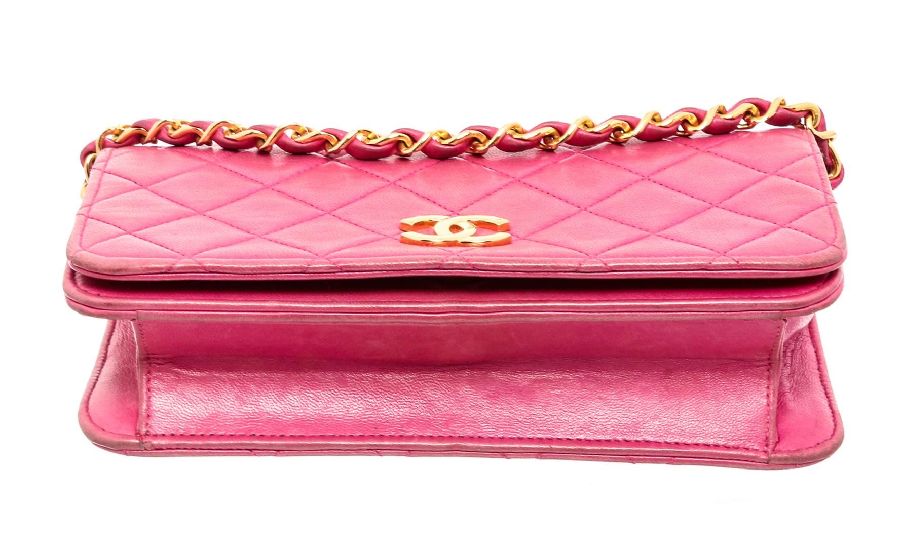 Pink Lambskin quilted leather vintage Chanel Wallet on Chain with gold-tone hardware, single chain-link and leather shoulder strap, interlocking CC logo embellishment at front, tonal leather lining, single interior pocket and snap closure at front flap.
