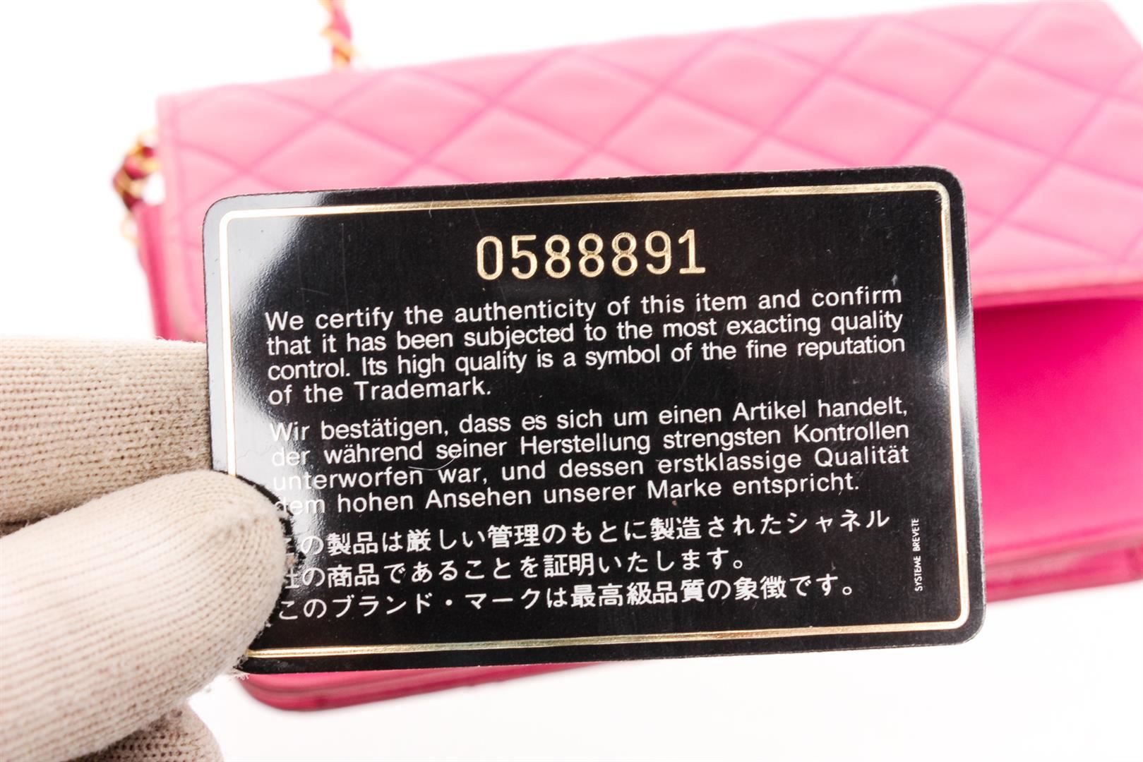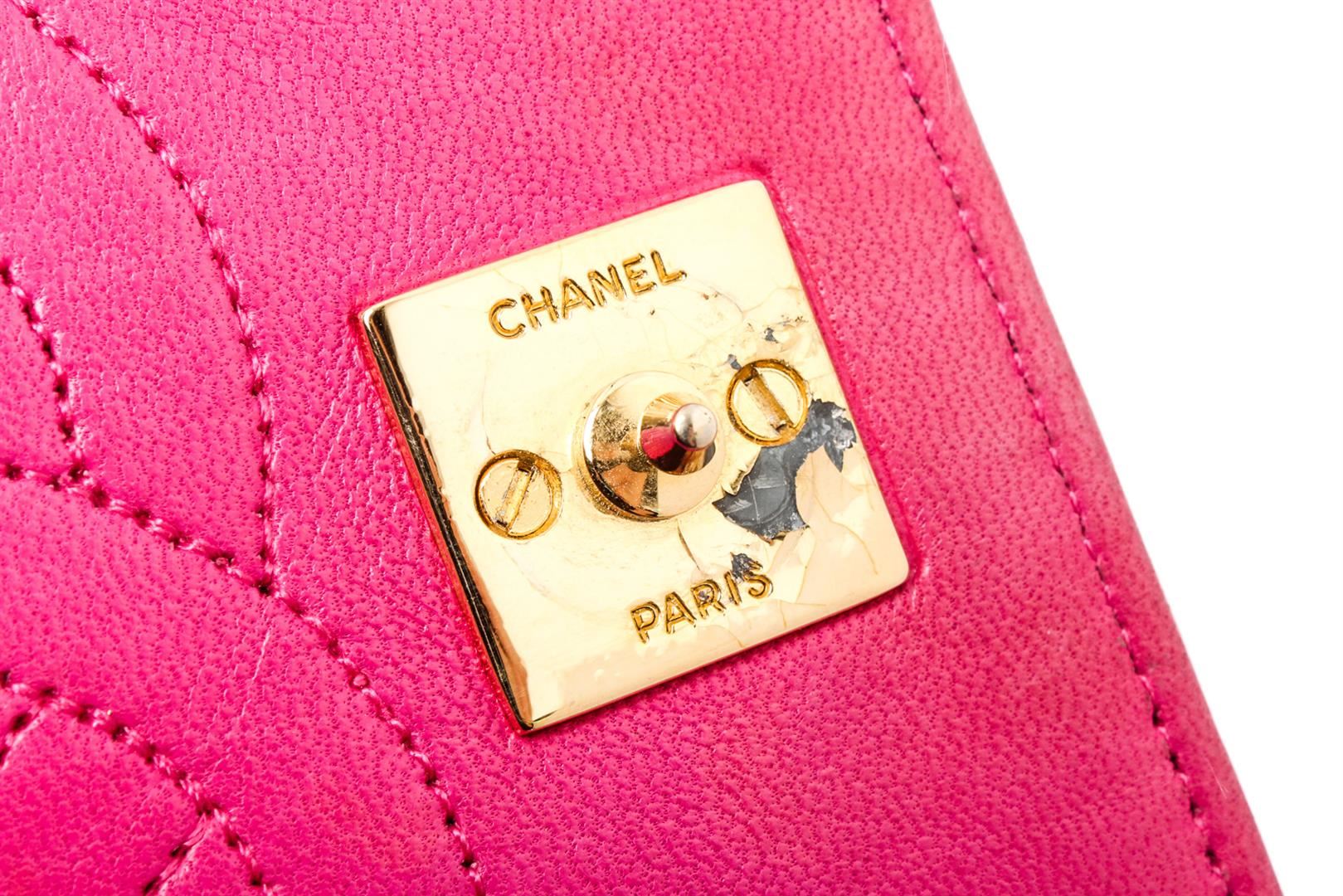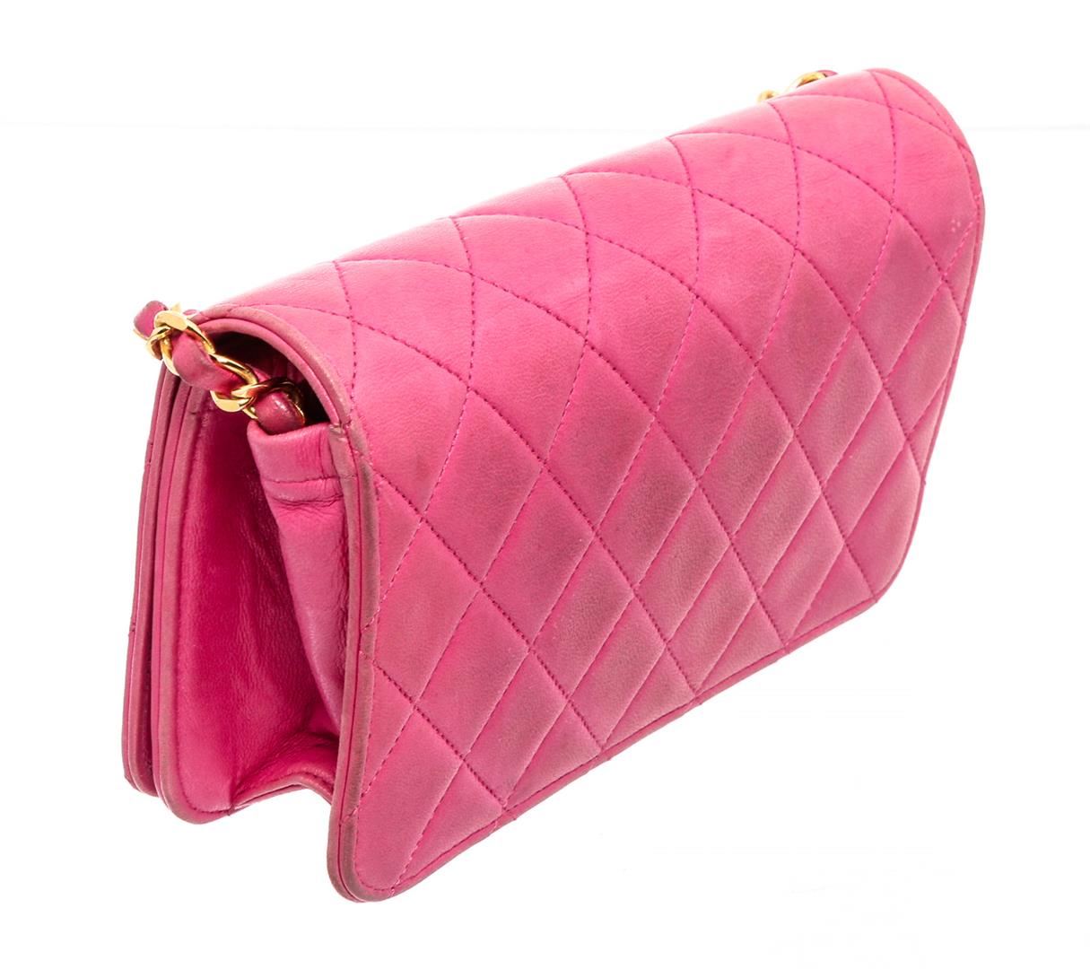 Pink Lambskin quilted leather vintage Chanel Wallet on Chain with gold-tone hardware, single chain-link and leather shoulder strap, interlocking CC logo embellishment at front, tonal leather lining, single interior pocket and snap closure at front flap.