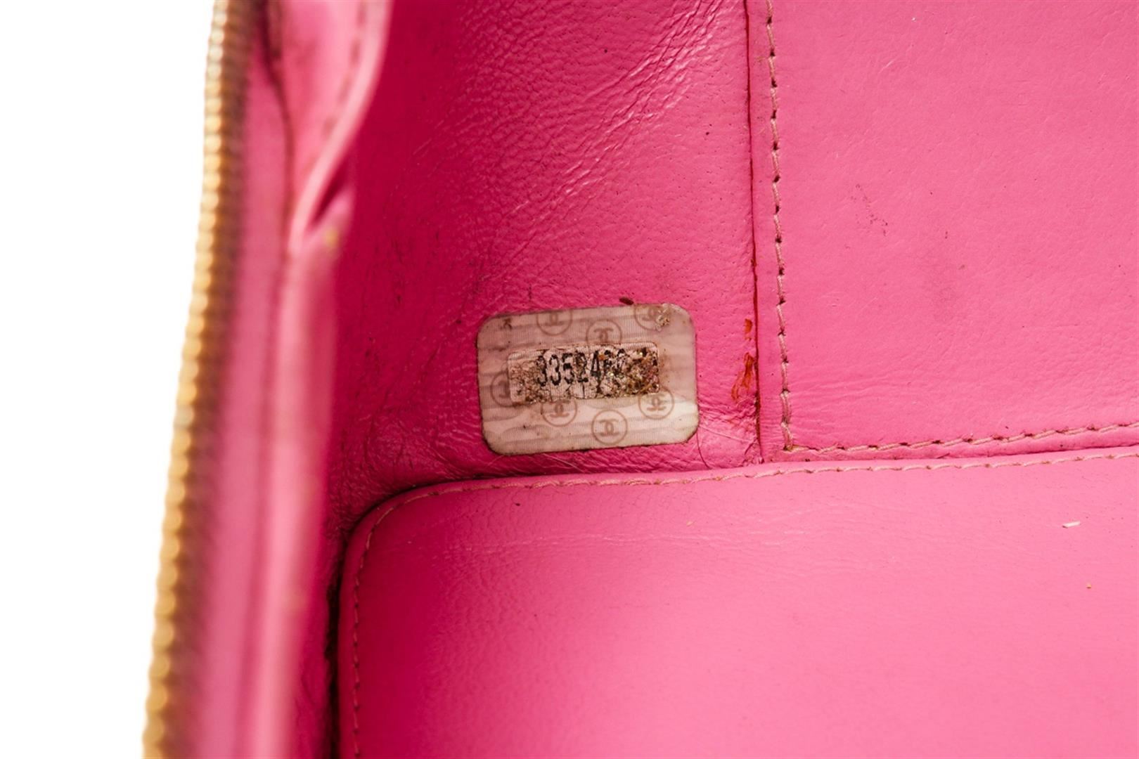 One Chanel Pink Quilted Patent Leather 2-Way Bag. Item is sold AS-IS. All available information is listed in the description and shown in the photo. Chanel pink quilted patent leather 2-way bag with gold-tone hardware, single top handle and a shoulder strap with woven leather and chain-link accent, protective feet at base, zip around closure, pink leather lining, one slip pocket, and one zip pocket on the interior wall. There is some wear on the leather lining, date code is intact and some markings on the patent leather as shown in pictures. There is creasing and color transfer. Height: 11" Width: 3.9" Depth: 8.3" , Shoulder Drop: / 27.94 x 9.91 x 21.09 Cm