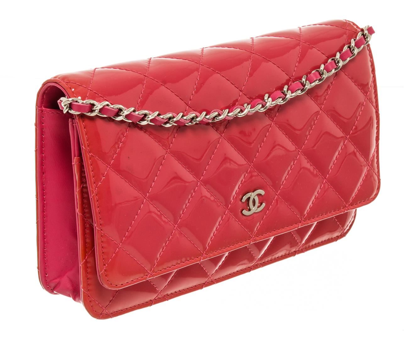 Chanel Pink Quilted Patent Leather Wallet on Chain. All available information is listed in the description and shown in the photos. Chanel Pink Quilted Patent Leather Wallet on Chain with silver-tone hardware, exterior patch pocket at the back, CC metal interlocking logo at front, interior zipper compartment, interior card slip pockets, pink fabric lining, chain leather shoulder strap, and snap closure. .