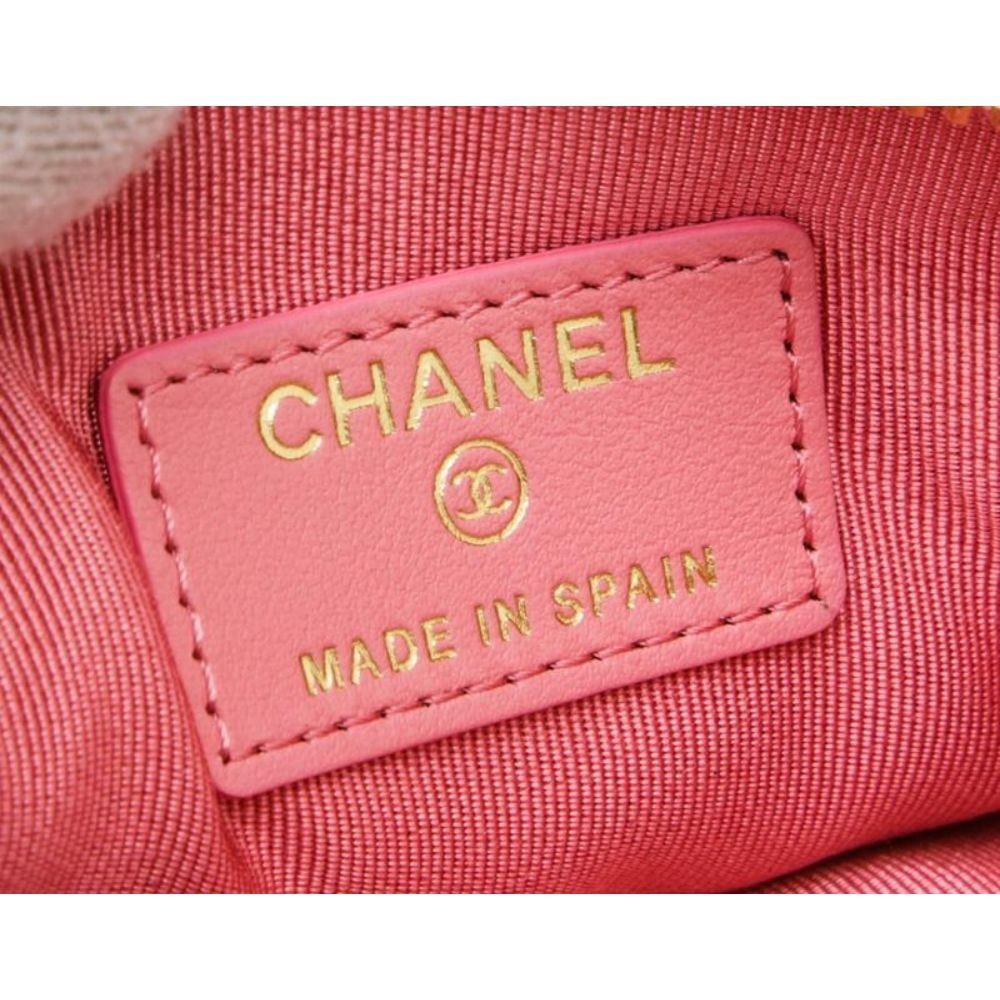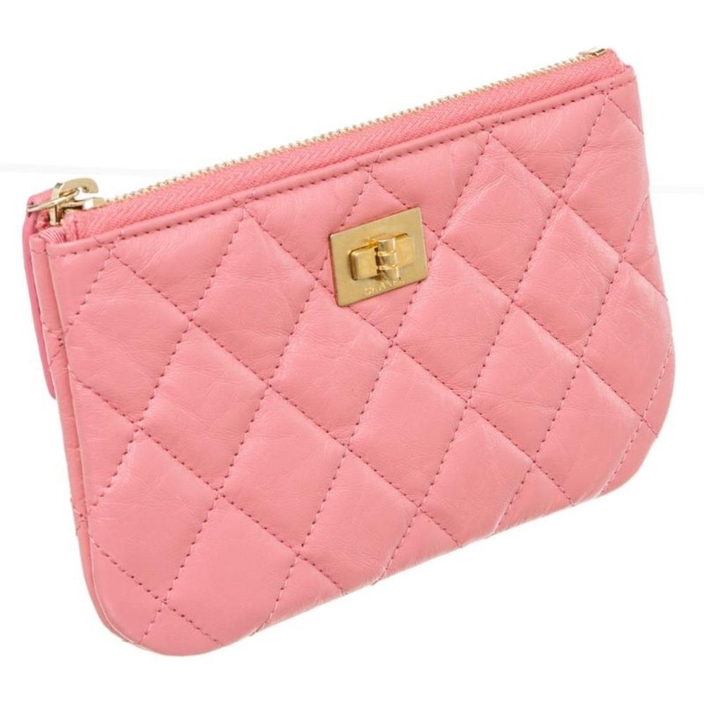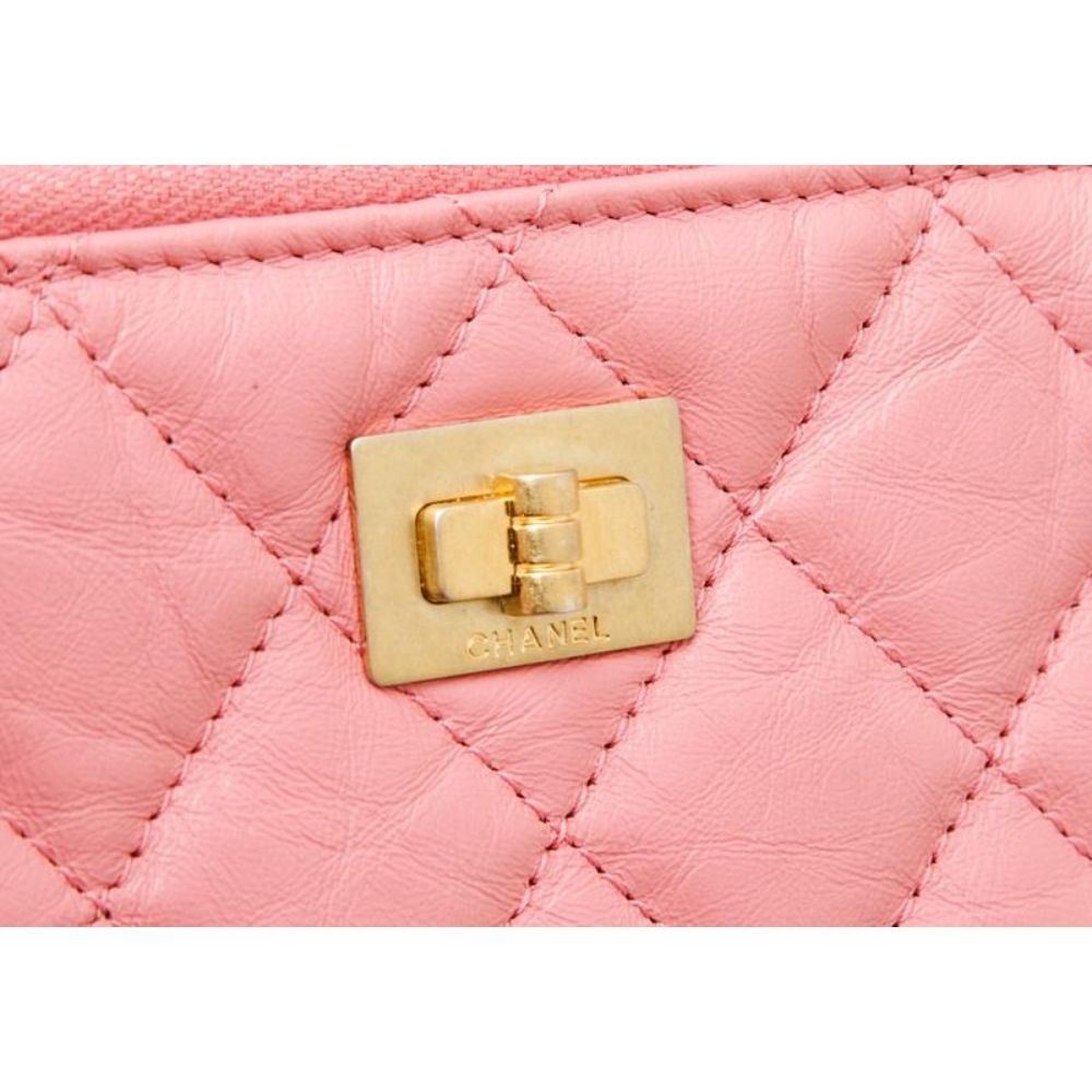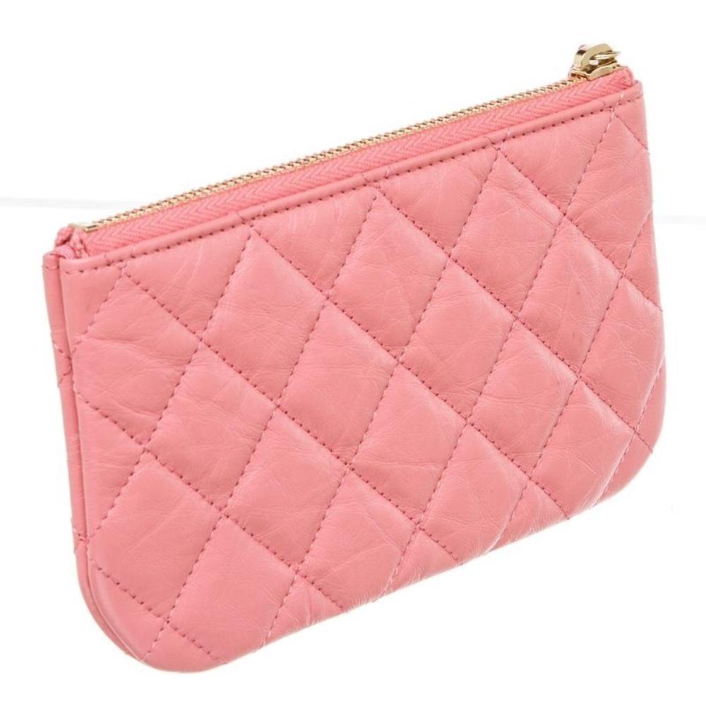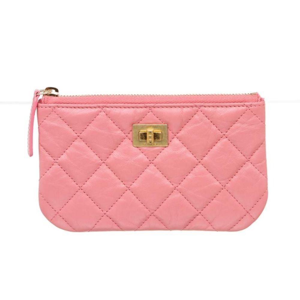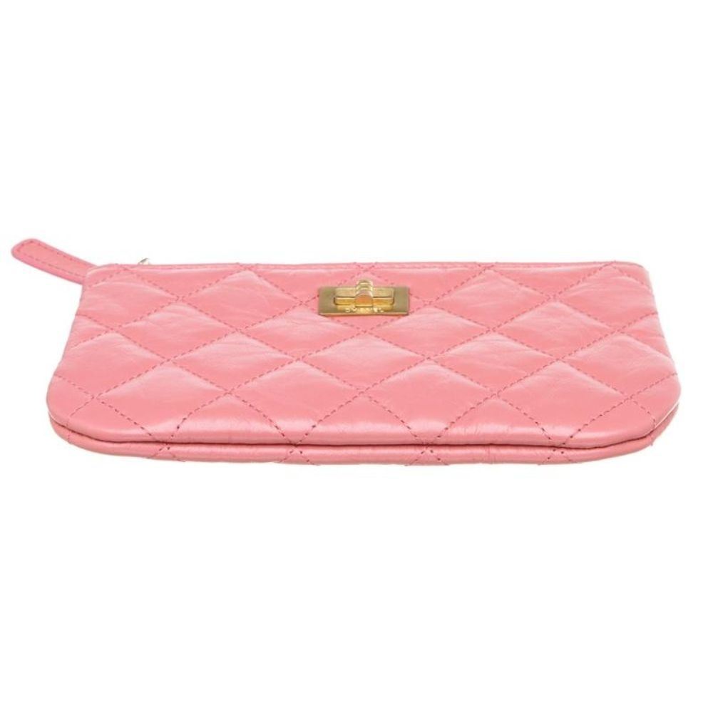 This stylish cosmetic pouch is crafted of diamond quilted calfskin leather in pink, with a small polished gold faux mademoiselle turn-lock on the front. The top zipper opens to a matching fabric interior.