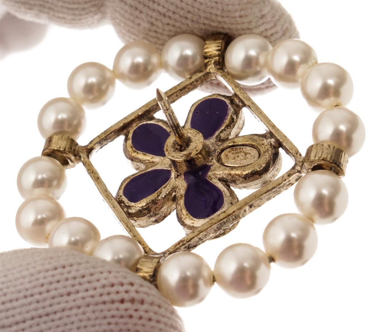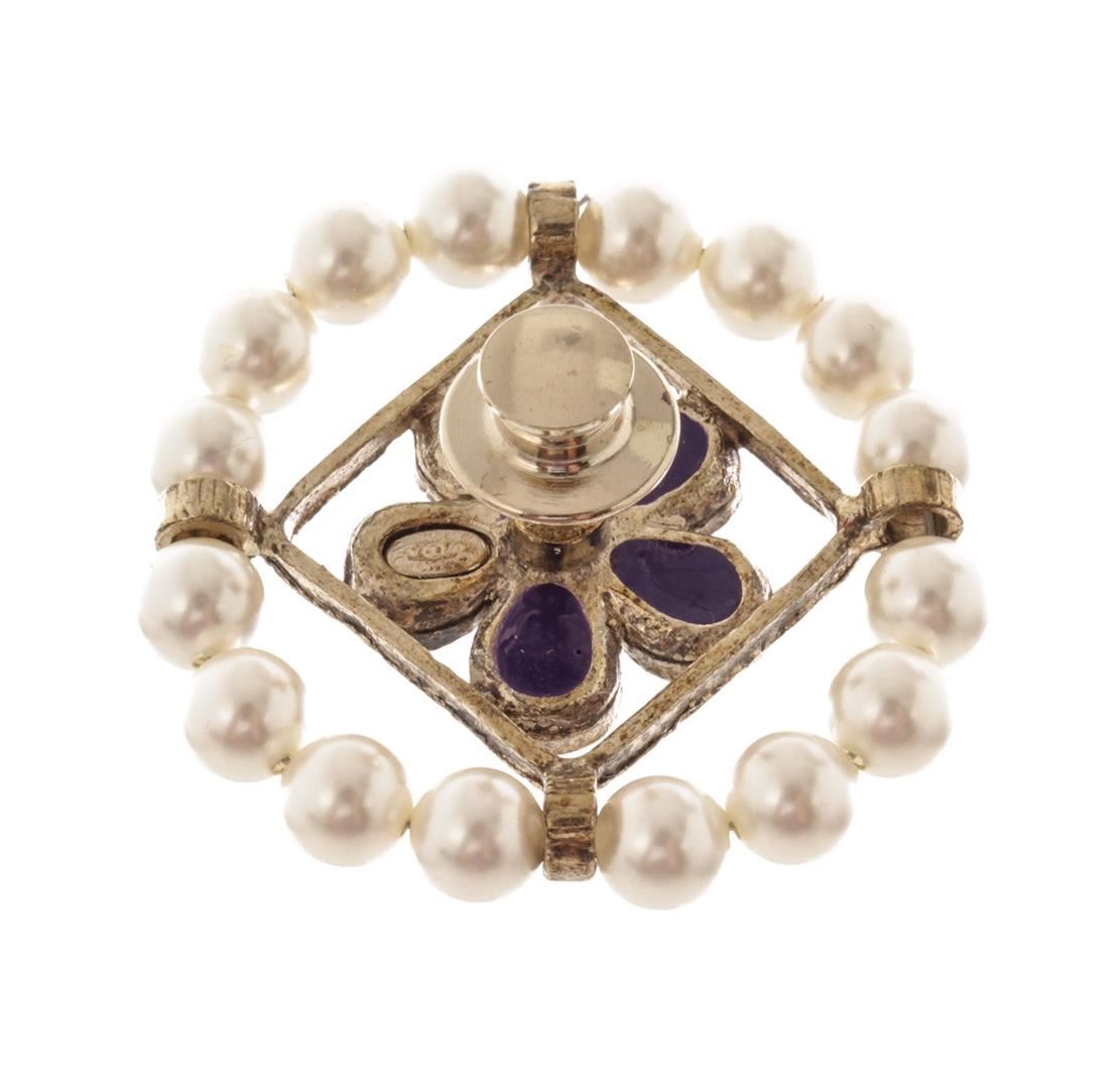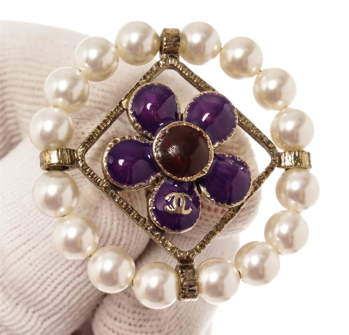 Chanel Purple Colored Stones and Pearl Flower Brooch features purple-colored making a flower shape, pearls, gold-tone hardware and stud closure.