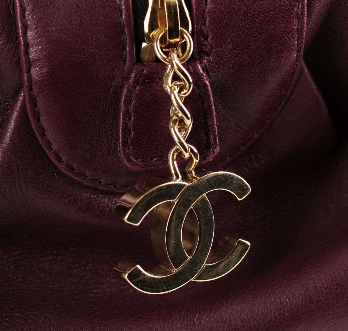 One Chanel Purple Handbag. This authentic roomy tote epitomizes everyday sophistication and makes a perfect everyday bag, large enough to hold all your essentials in style. The leather handbag measures Length 14in, Width 6in. Interior includes 2 open pockets and 1 closed pocket with zipper. The interior is clean and in good condition.