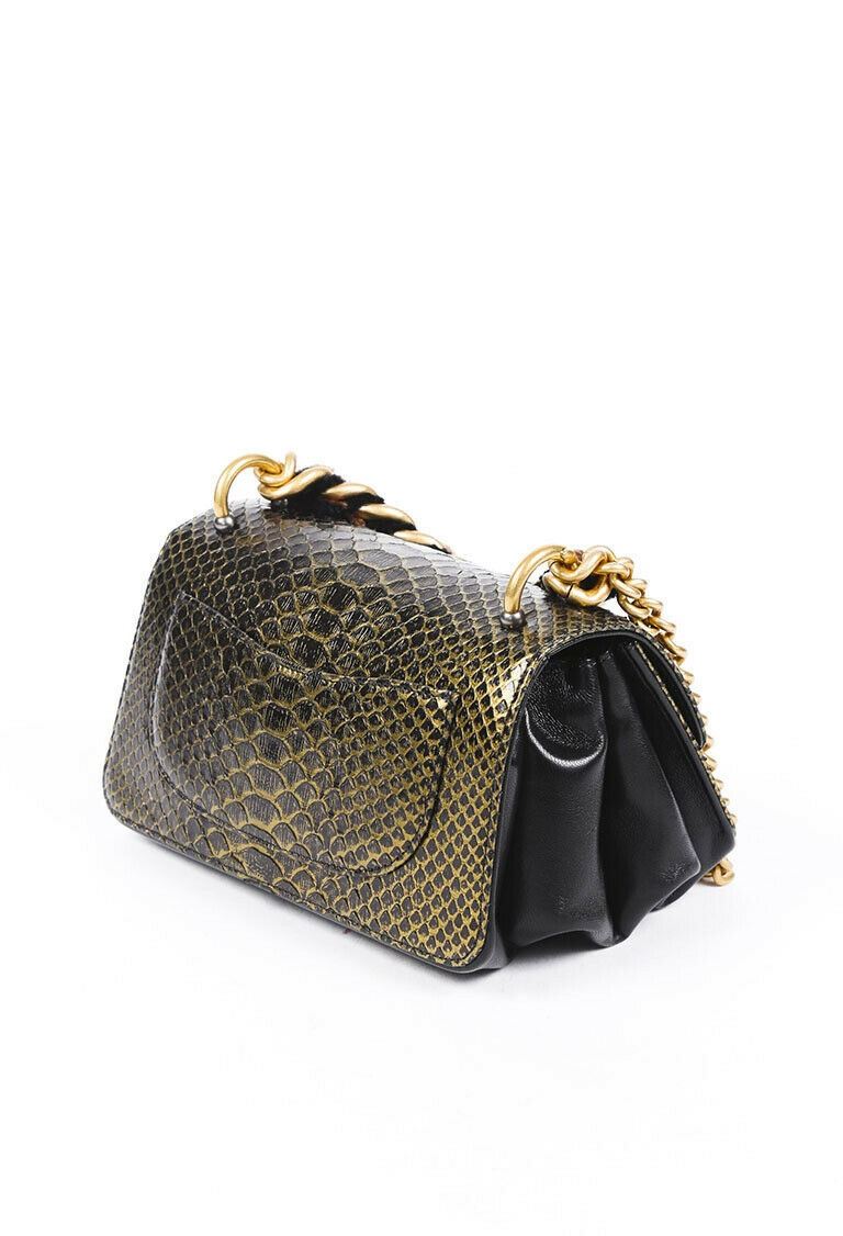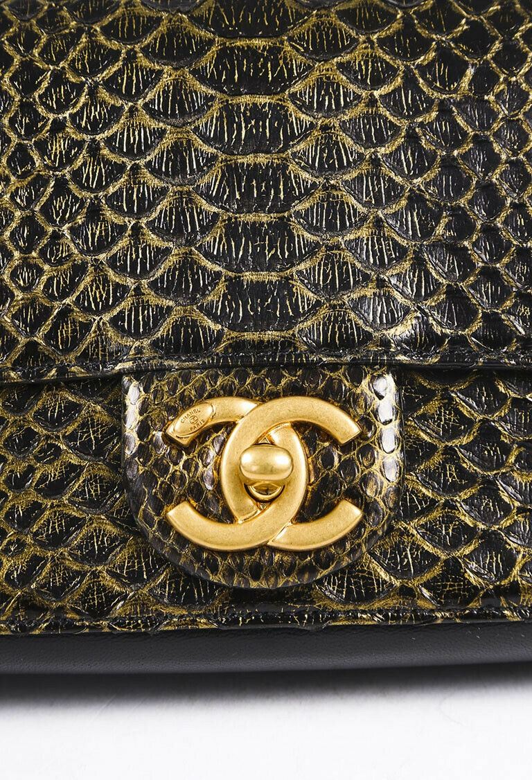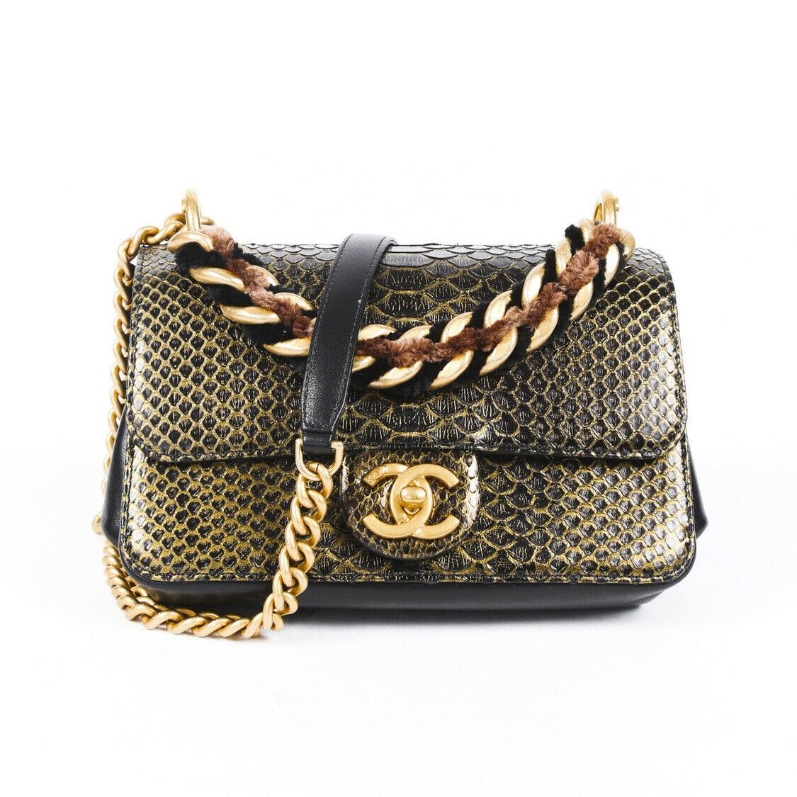 Circa Fall 2017. Chanel Flap bag is crafted from python snakeskin and features gold tone hardware, a faux fur lined chainlink handle, chain strap with a leather shoulder protector, back slip pocket, flap with the iconic CC turn lock closure, and a compartmentalized leather interior with a zipped pocket.