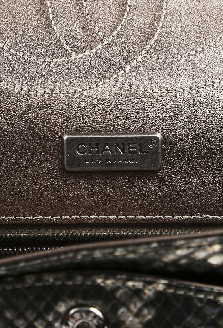 Description : Chanel 2.55 Reissue 226 Python Shoulder Bag. Circa 2015. Created by Coco Chanel in 1955, the 2.55 Reissue is given a luxe update. This stunning 2.55 Reissue is crafted from metallic python snakeskin and features antiqued silver tone hardware, an adjustable chain strap, back slip pocket, front flap with a Mademoiselle turn lock closure, and a leather interior with pockets.