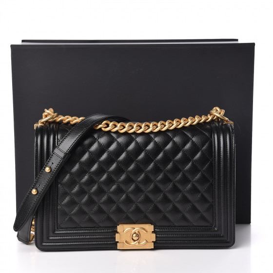 Description: Crafted of luxurious diamond quilted caviar leather in black. The bag features a matte gold chain link shoulder strap with a leather shoulder pad and a linear quilted border with a gold tone Boy Chanel CC push lock. This opens to a black fabric interior with zipper and patch pockets.