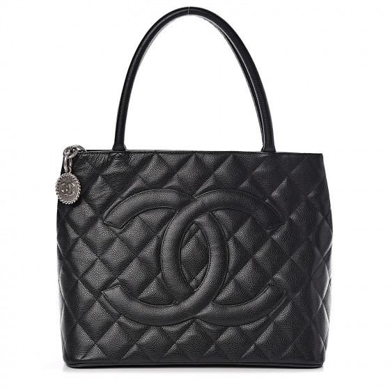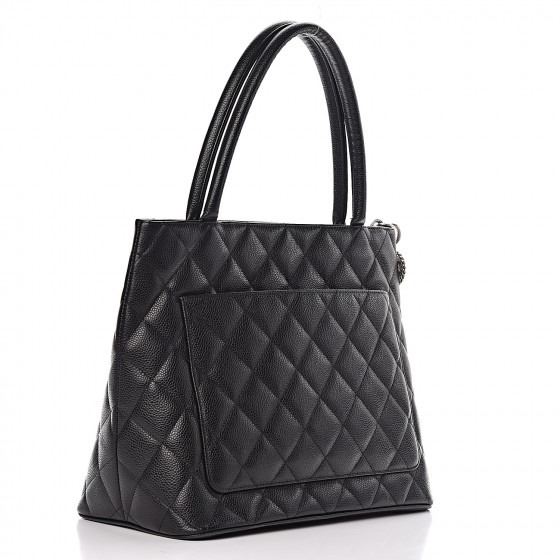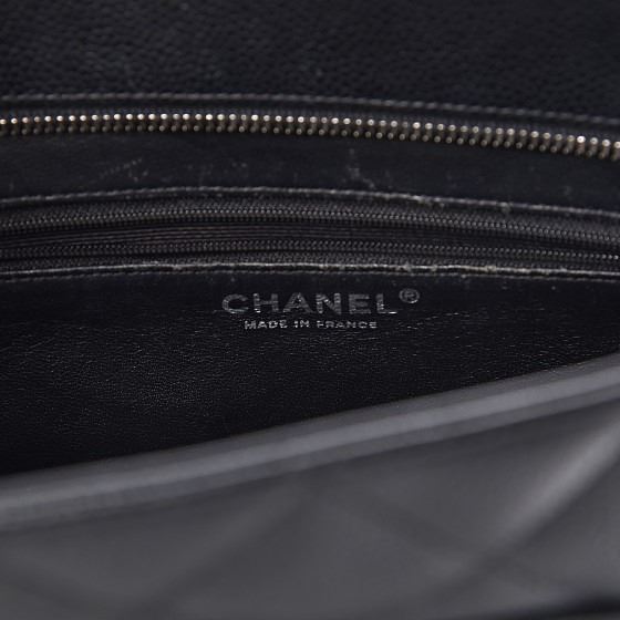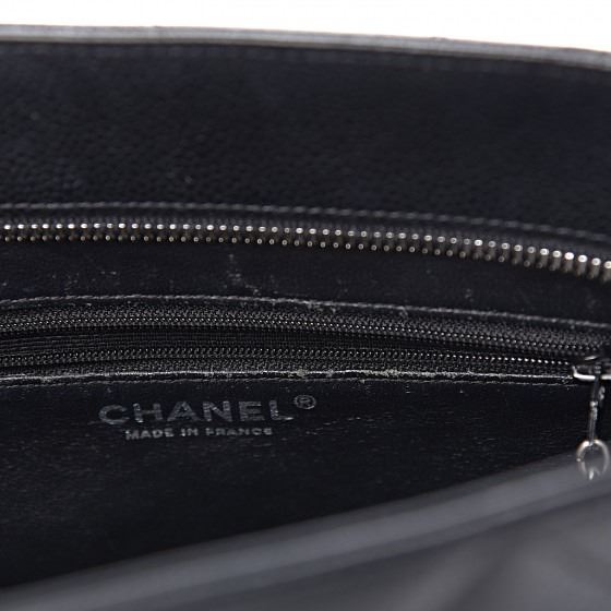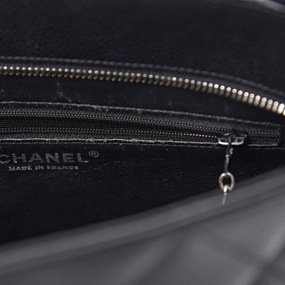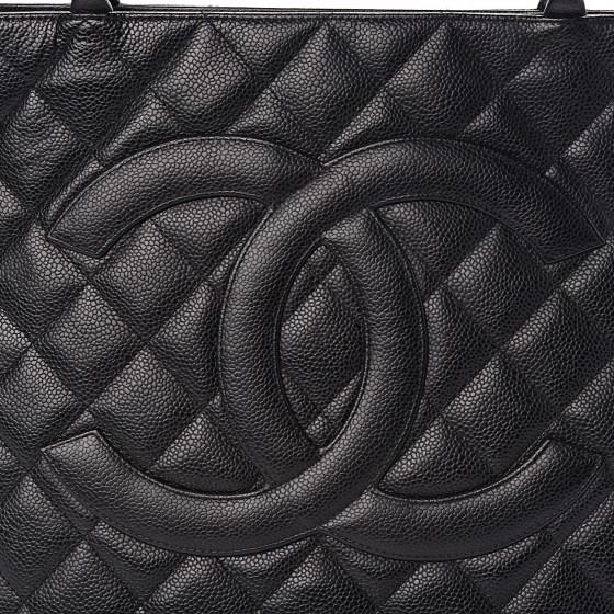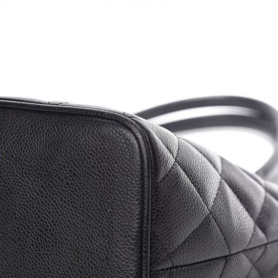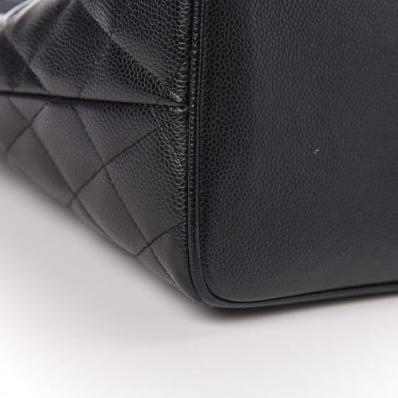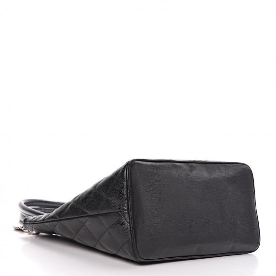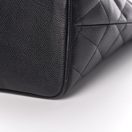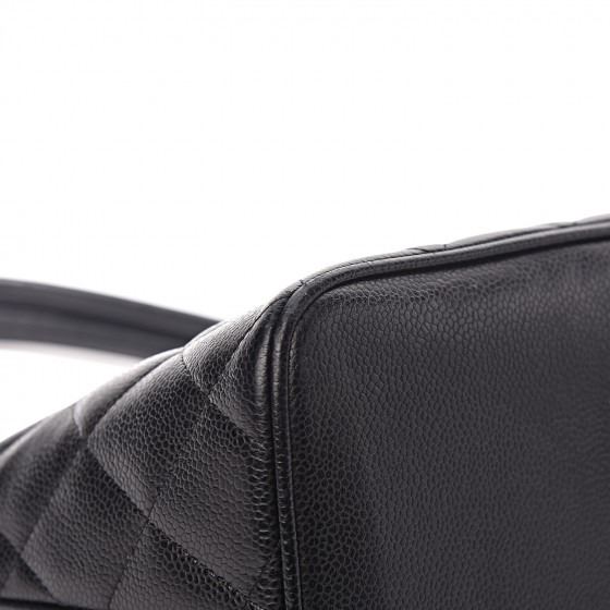 Black tote is crafted of diamond quilted caviar leather. The bag features a large Chanel CC leather patch, rolled leather top handles, and opens to a matte leather interior with zipper and patch pockets.