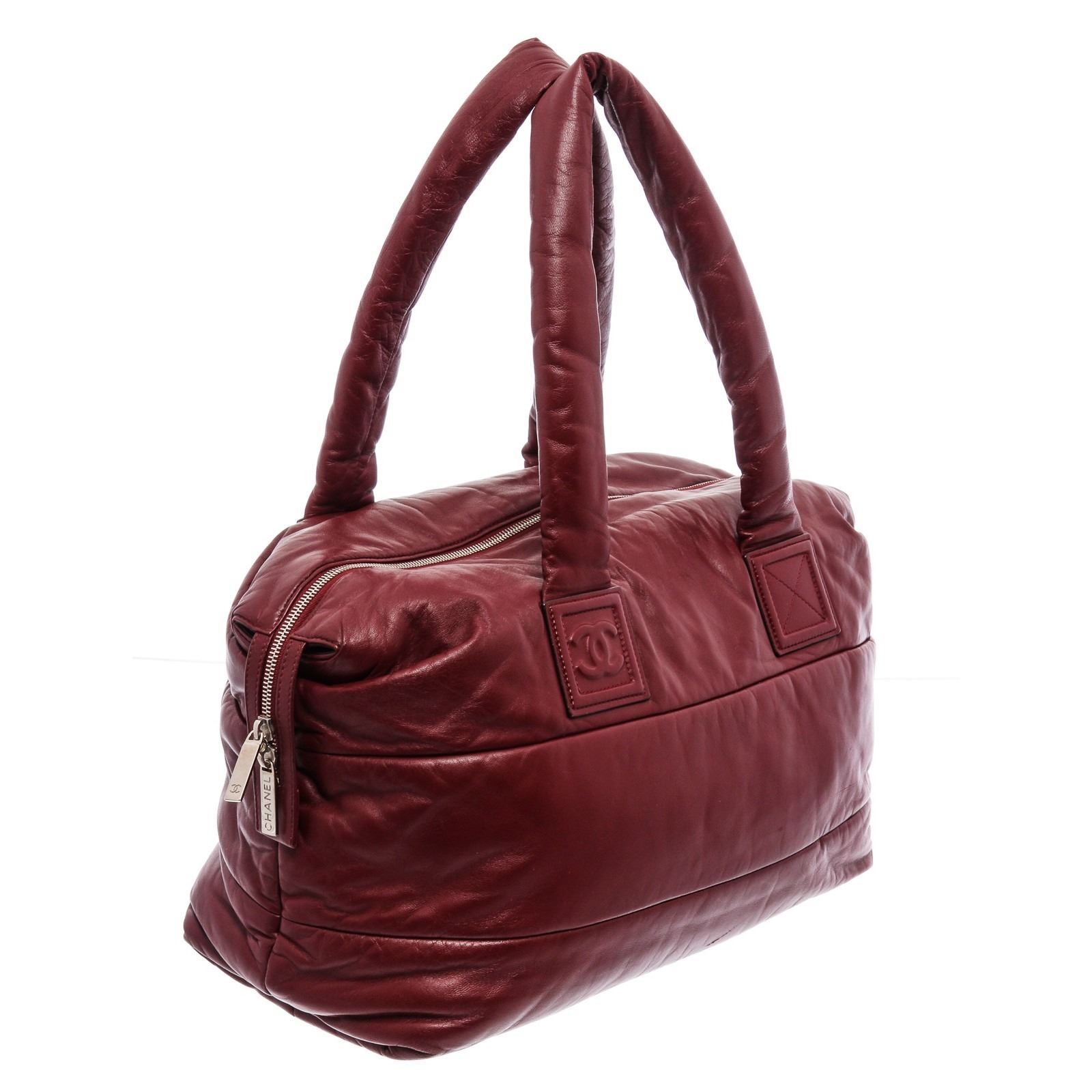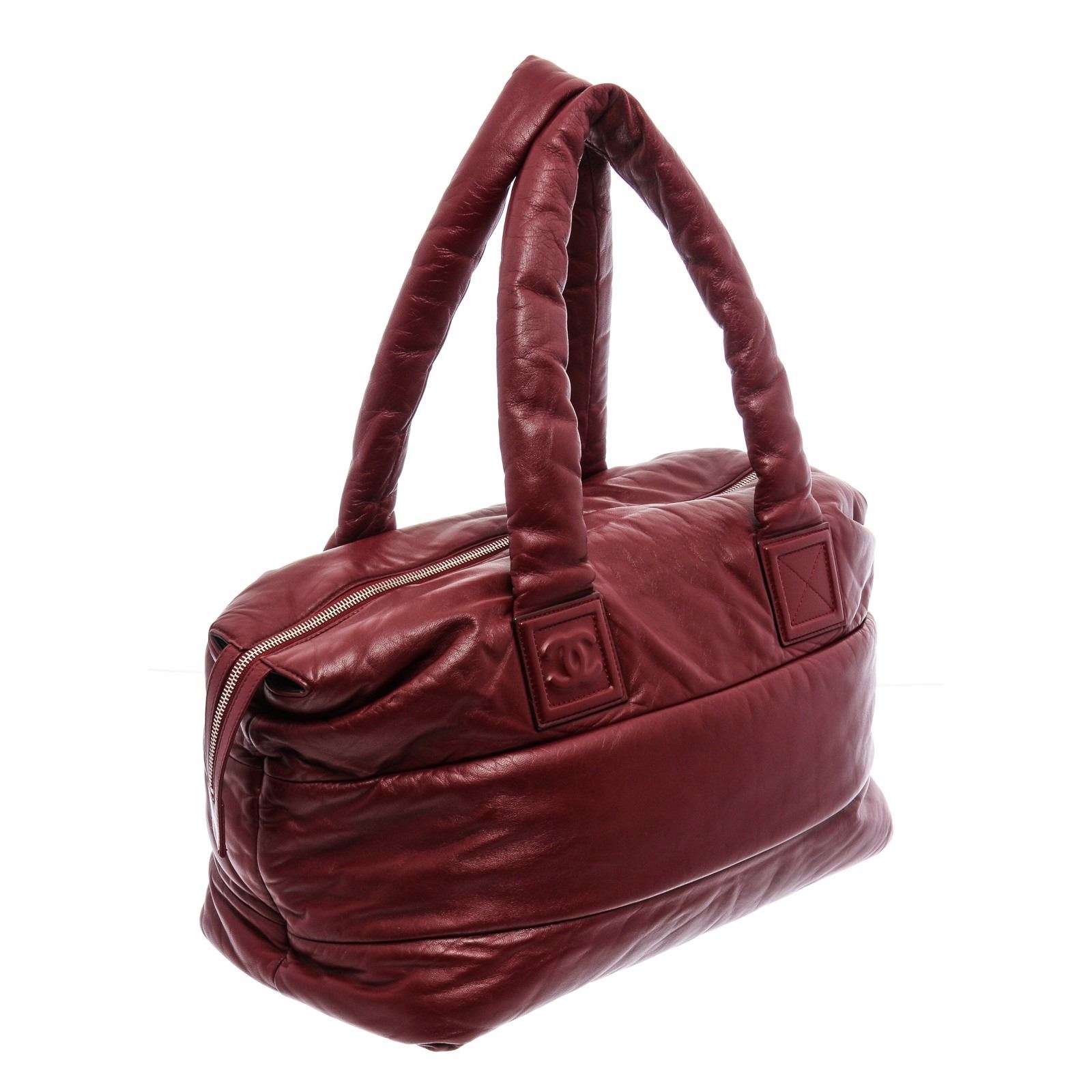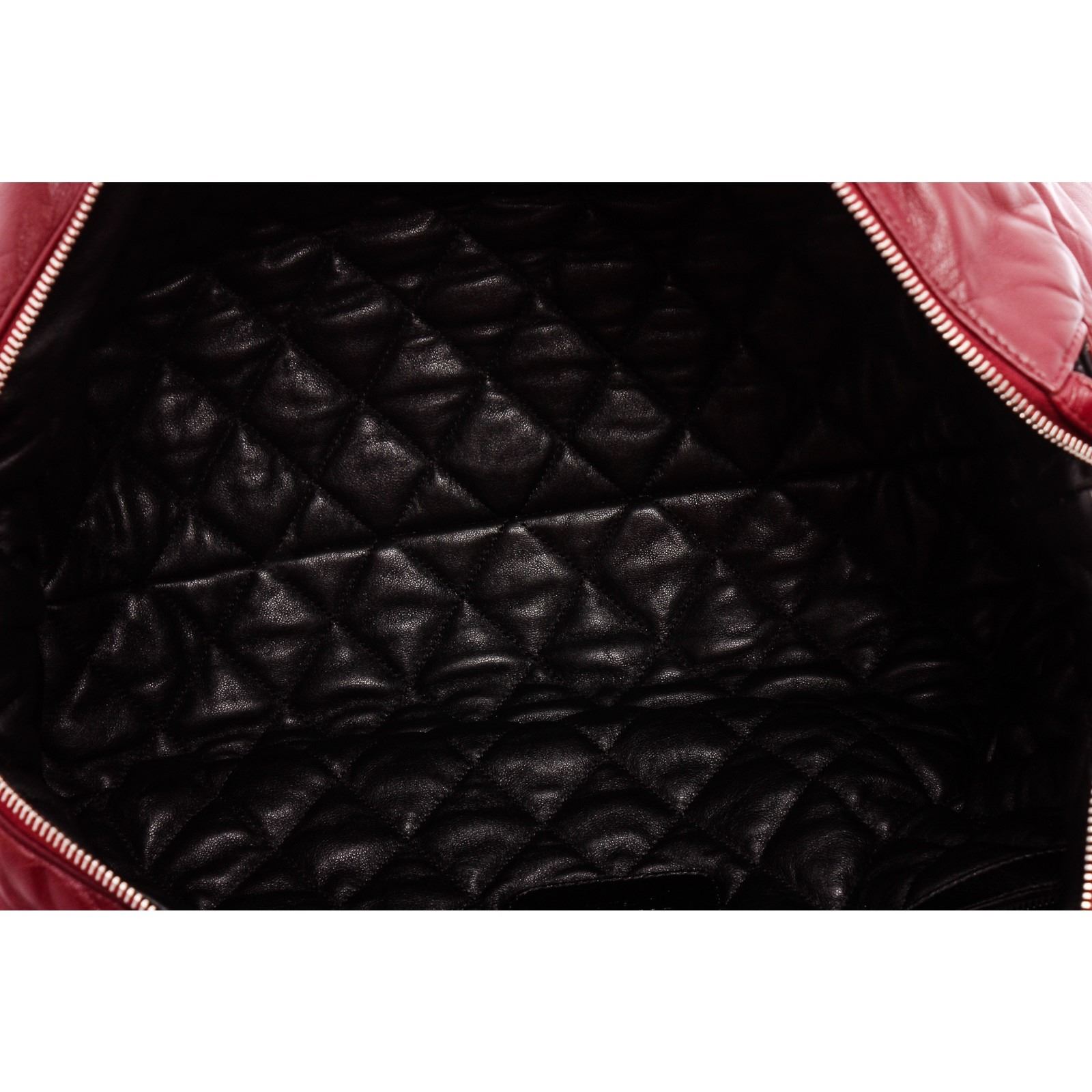 Black and burgundy quilted leather Chanel Coco Cocoon Reversible tote bag with silver-tone hardware, dual rolled shoulder straps, single exterior zip pocket, black leather lining and clasp closure at top.