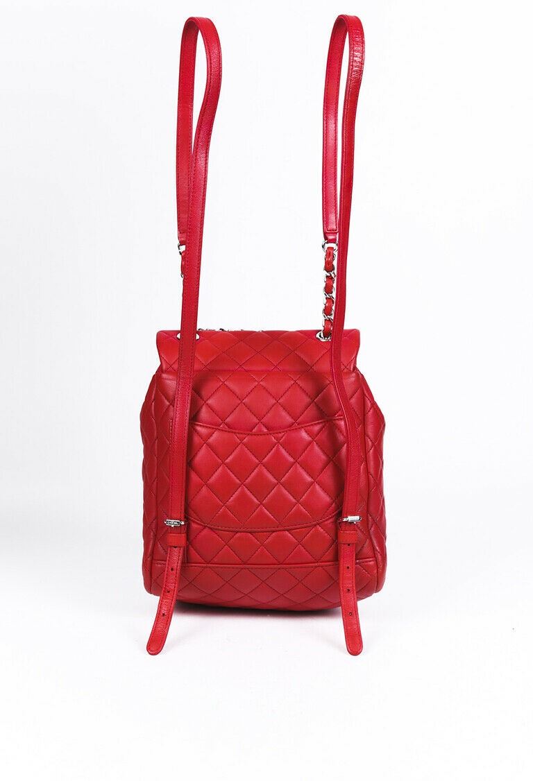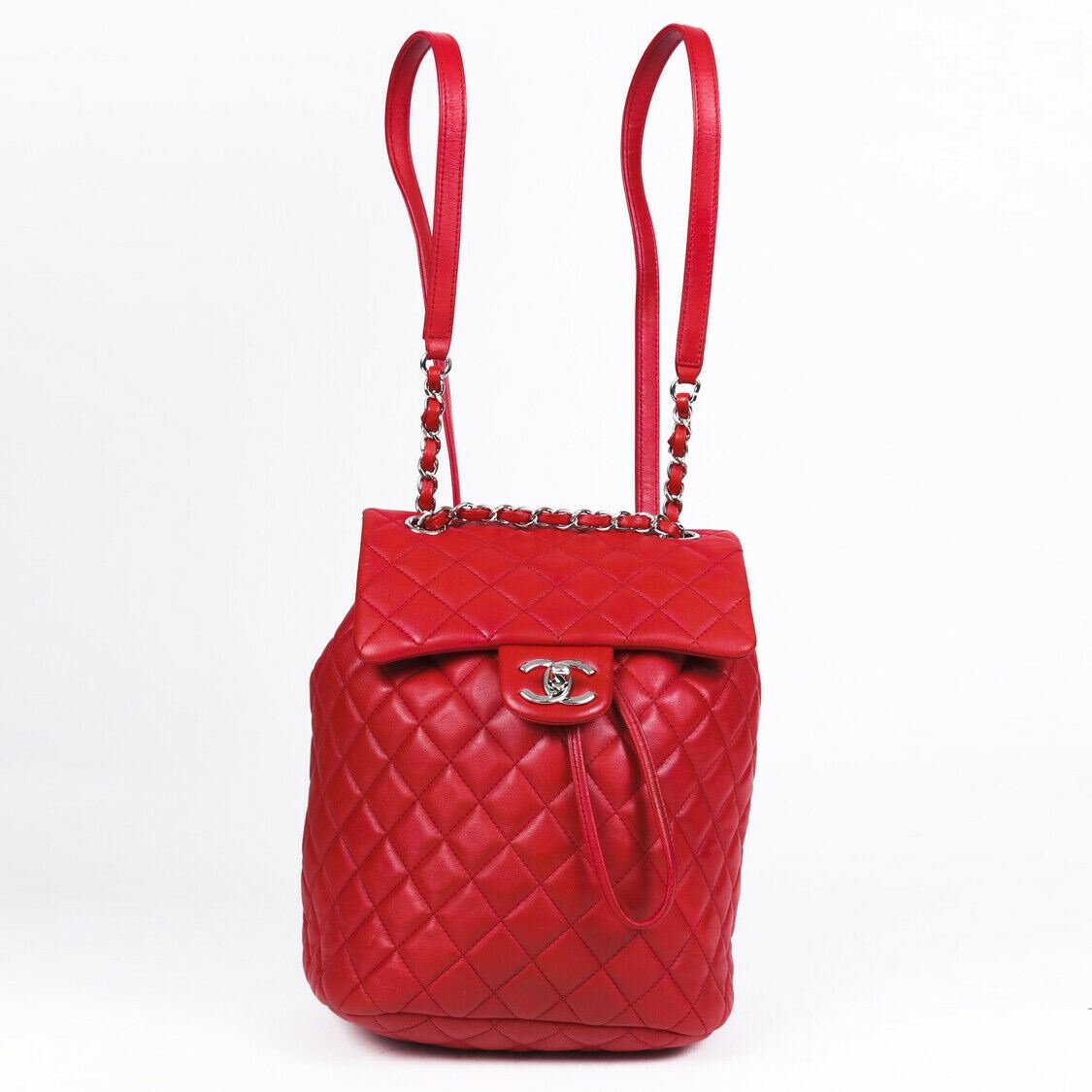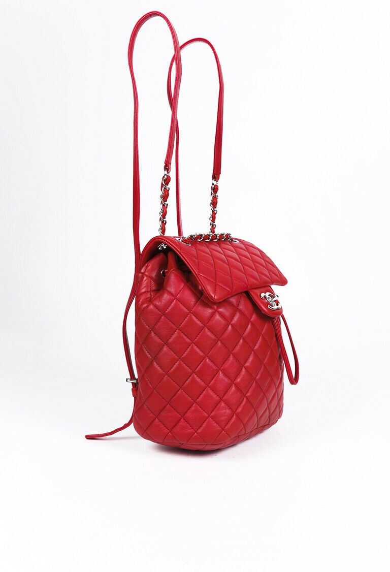 Circa 2016-2017. Chanel small Urban Spirit backpack is crafted from quilted lambskin and features silver tone hardware, adjustable interwoven chain and leather straps, back slip pocket, front flap with the iconic CC turn lock, drawstring closure, and a canvas interior with pockets.