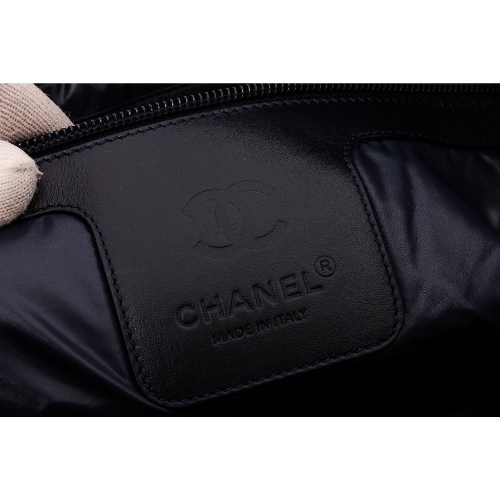 Black quilted nylon Chanel Large Coco Cocoon tote with silver-tone hardware, dual rolled top handles, single zip pocket at front, blue nylon lining, single zip pocket at interior wall and zip closure at top.
