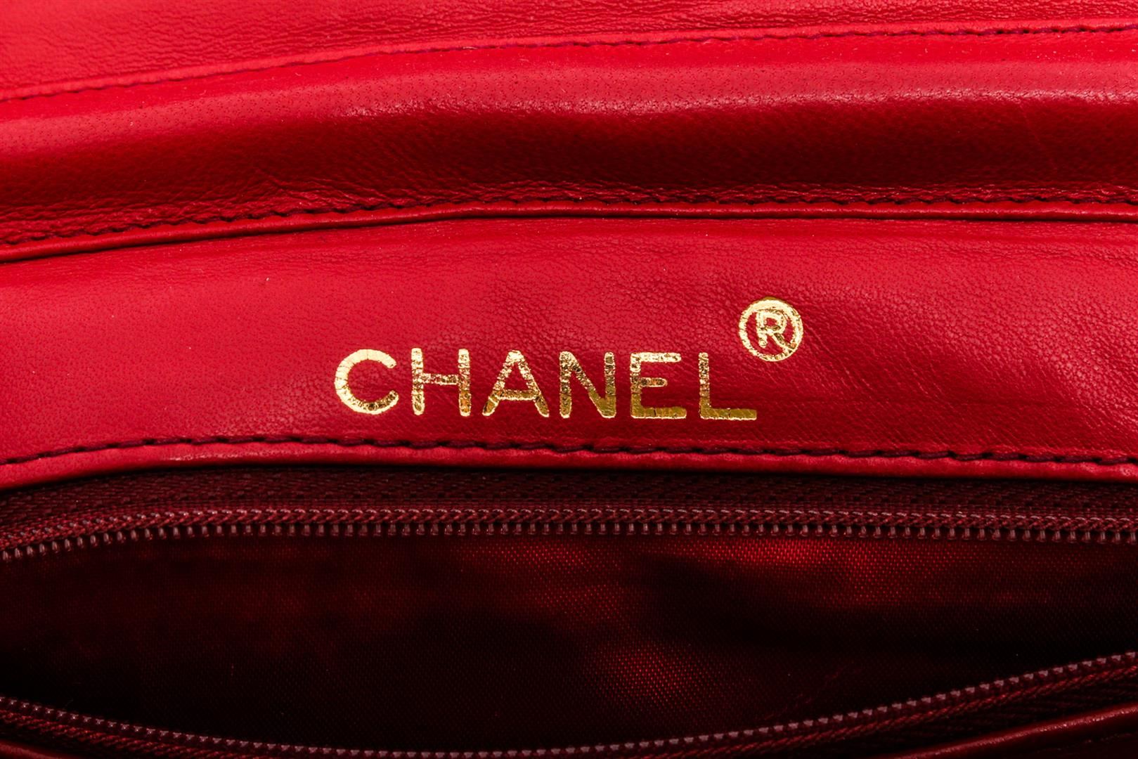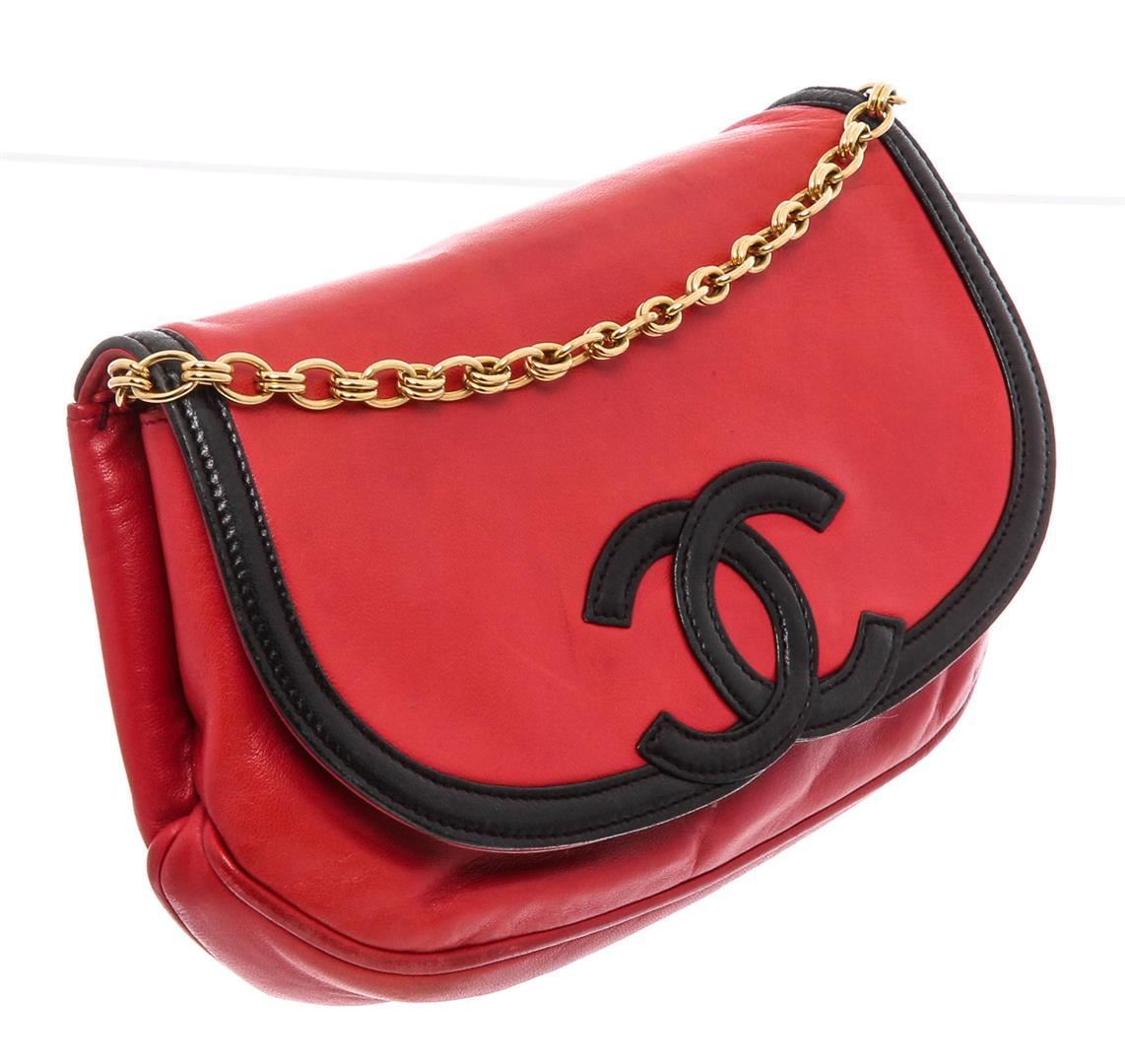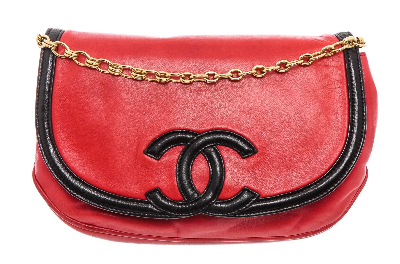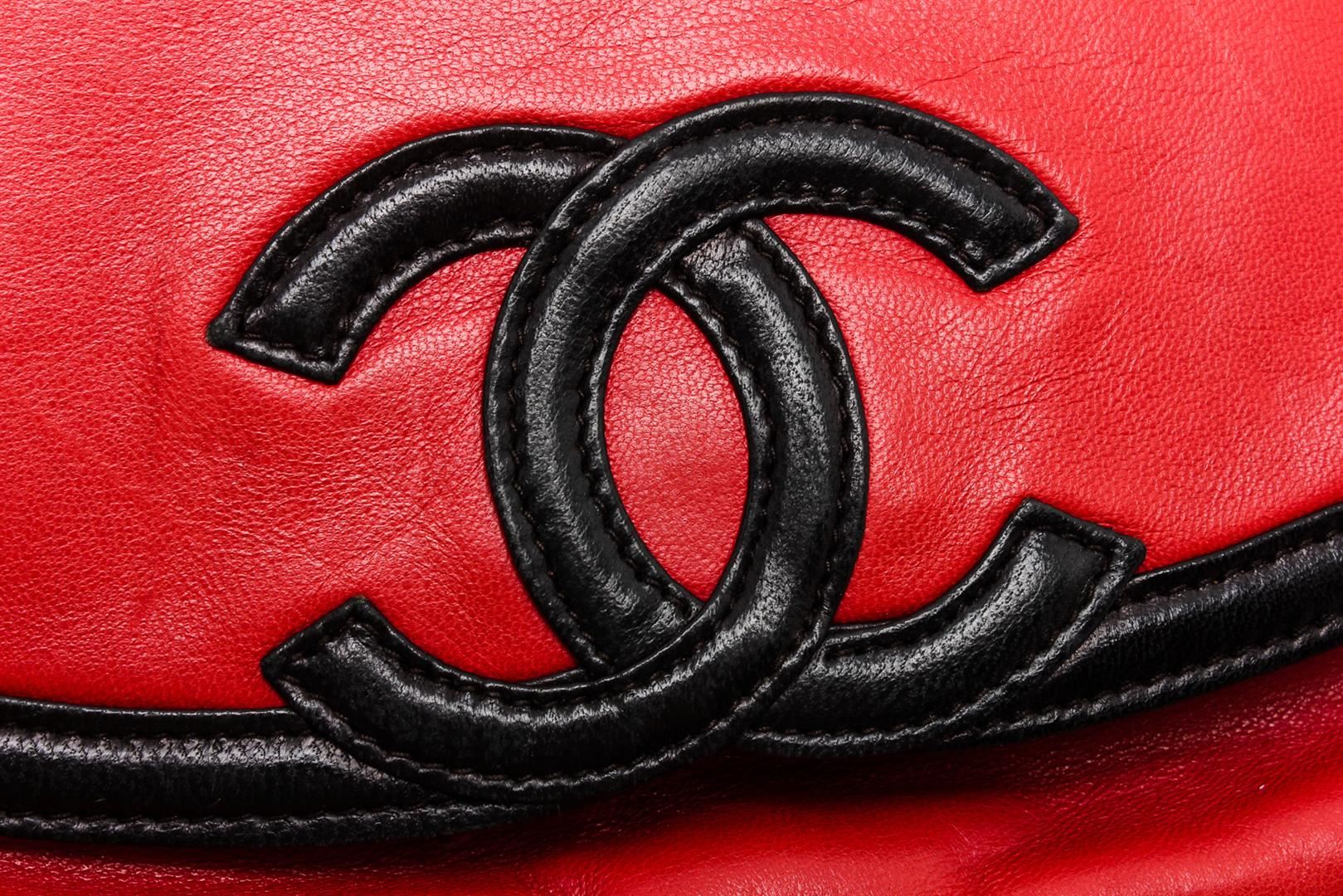 Red lambskin leather Chanel rounded flap bag with gold-tone hardware, black leather trim, gold chin-link shoulder strap, tonal leather lining, one zippered pocket at interior wall and one slip pocket, overall flap with black logo CC snap closure at front.