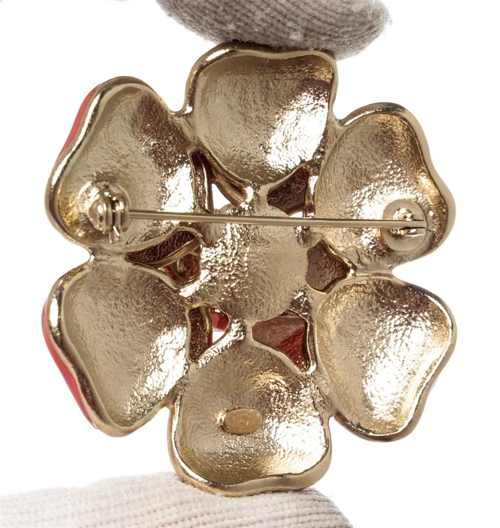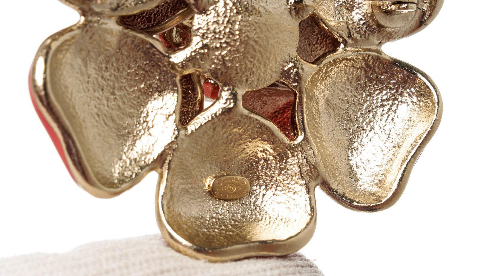 Gold-tone Chanel Camelia Brooch CC logo with red color flower and gold-tone hardware.