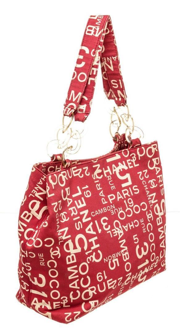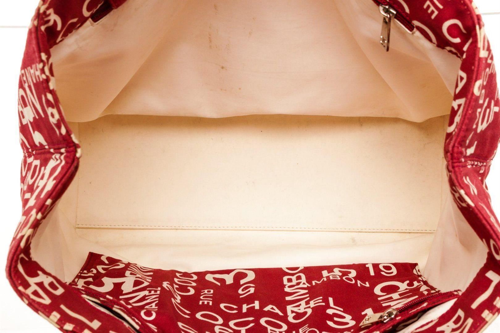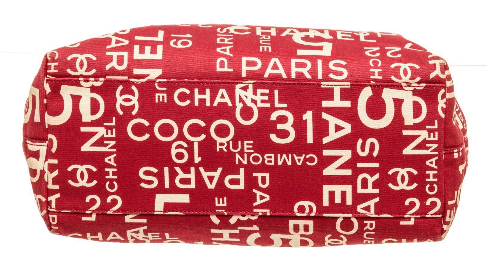 Chanel Red Canvas Logo Tote Bag with canvas, gold-tone hardware, dual chain-link and leather shoulder straps, stitched interlocking CC logo detail at front, exterior slip pockets, tonal leather lining, dual interior zip pockets and zip closure at top.