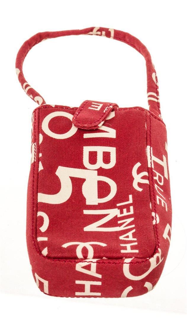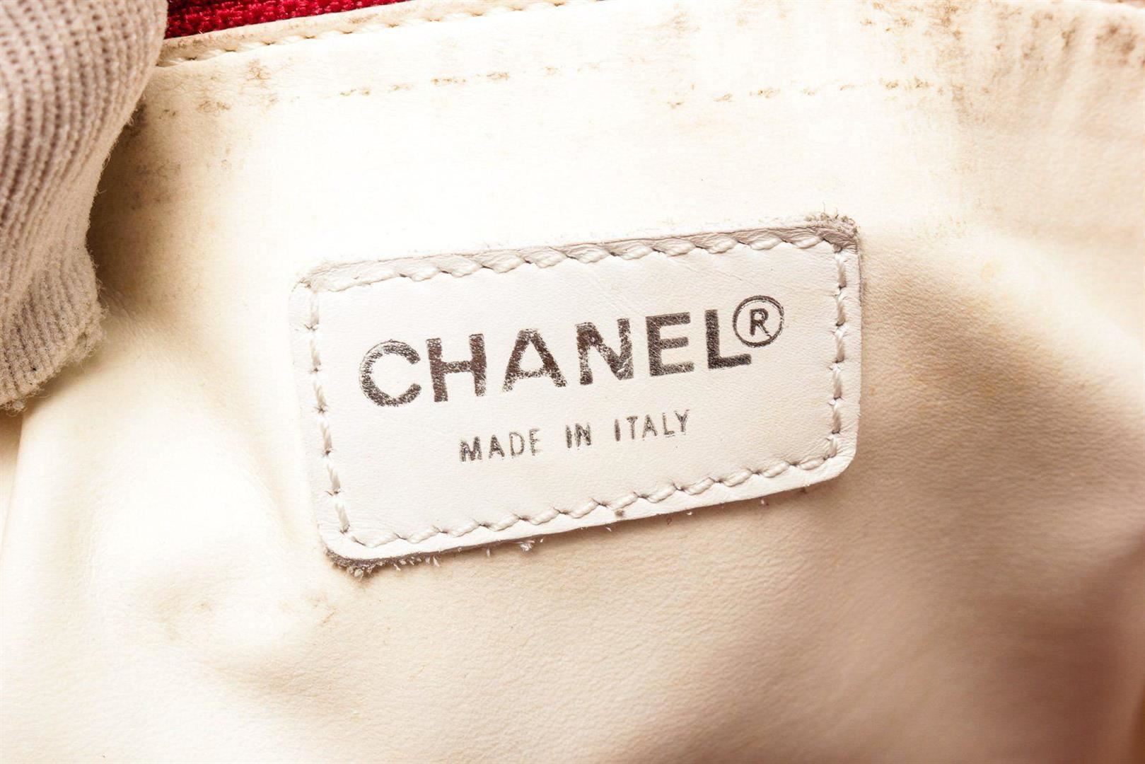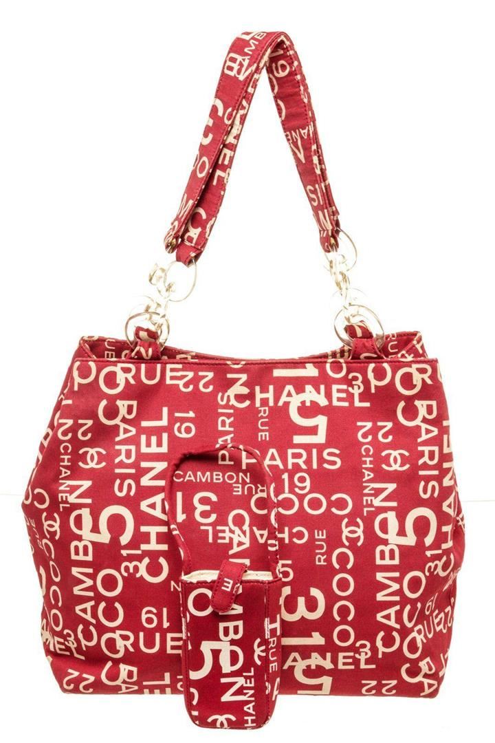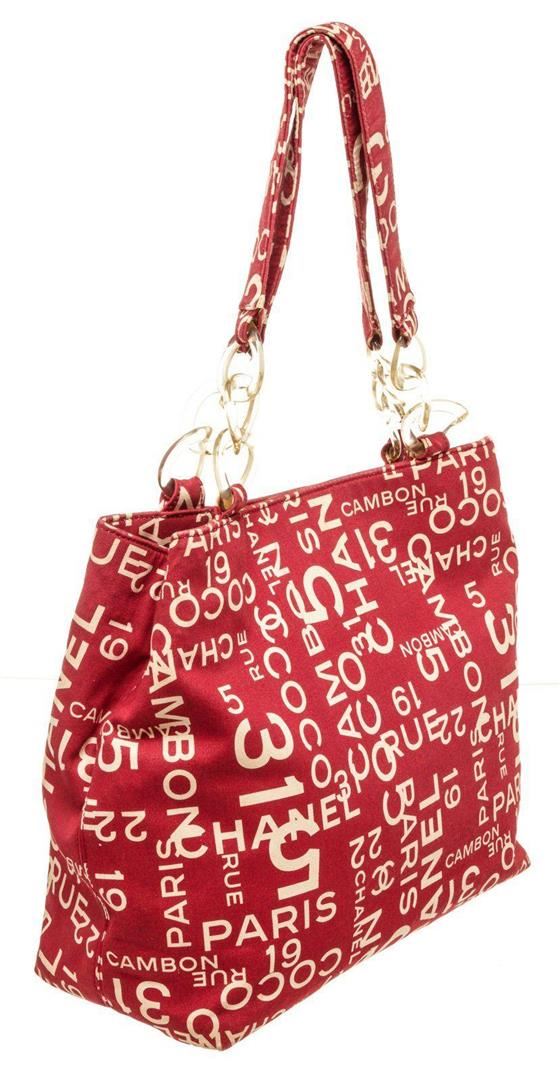 Chanel Red Canvas Logo Tote Bag with canvas, gold-tone hardware, dual chain-link and leather shoulder straps, stitched interlocking CC logo detail at front, exterior slip pockets, tonal leather lining, dual interior zip pockets and zip closure at top.