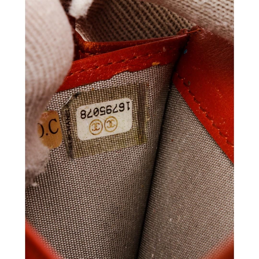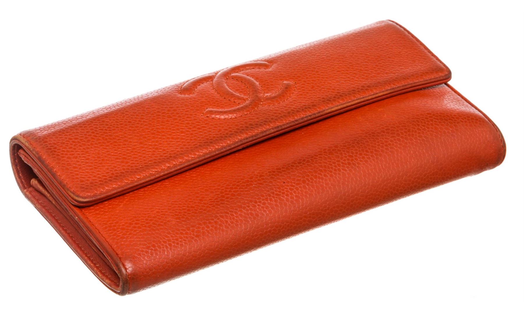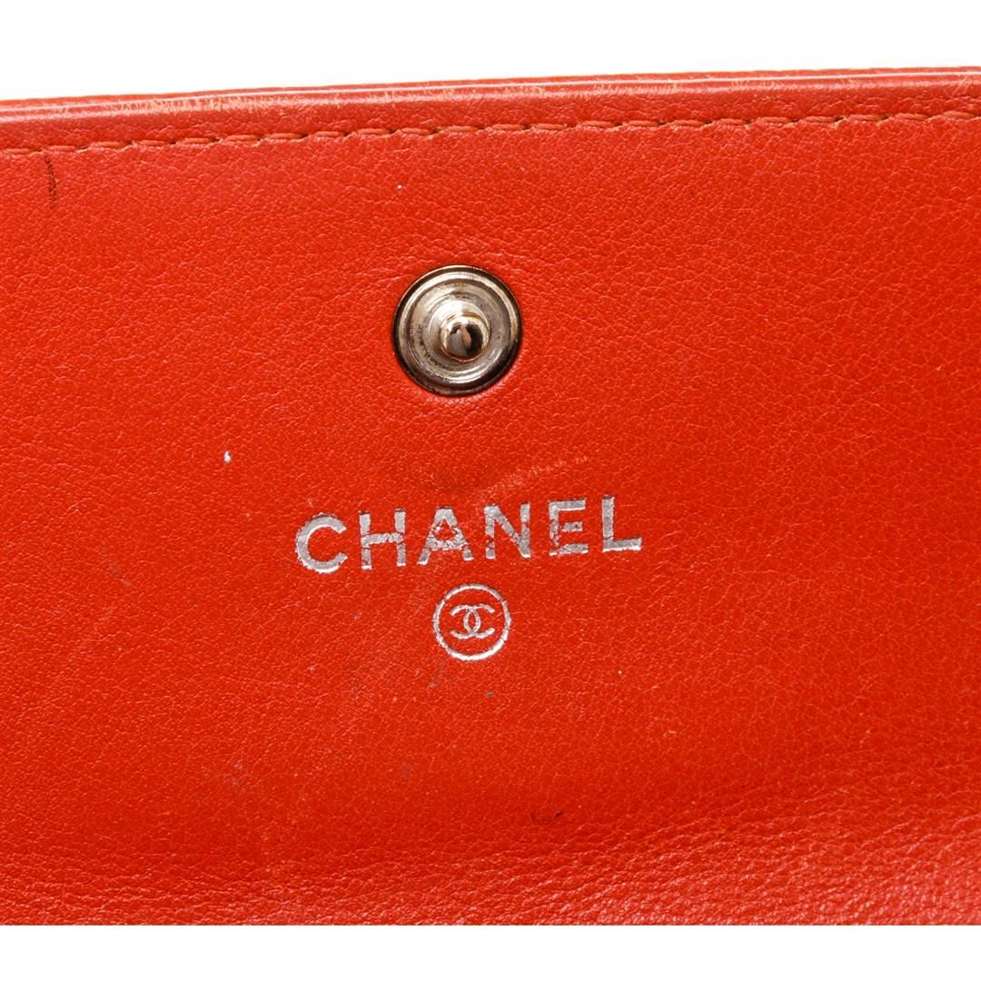 Red caviar leather Chanel CC long flap wallet with tonal leather lining, twelve credit card slots, three compartments one with zipper closure, one bill pocket and overall flap with button snap closure. Authentic.