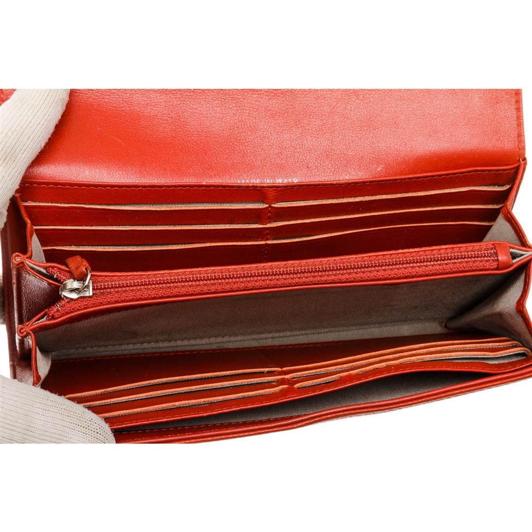 Red caviar leather Chanel CC long flap wallet with tonal leather lining, twelve credit card slots, three compartments one with zipper closure, one bill pocket and overall flap with button snap closure. Authentic.