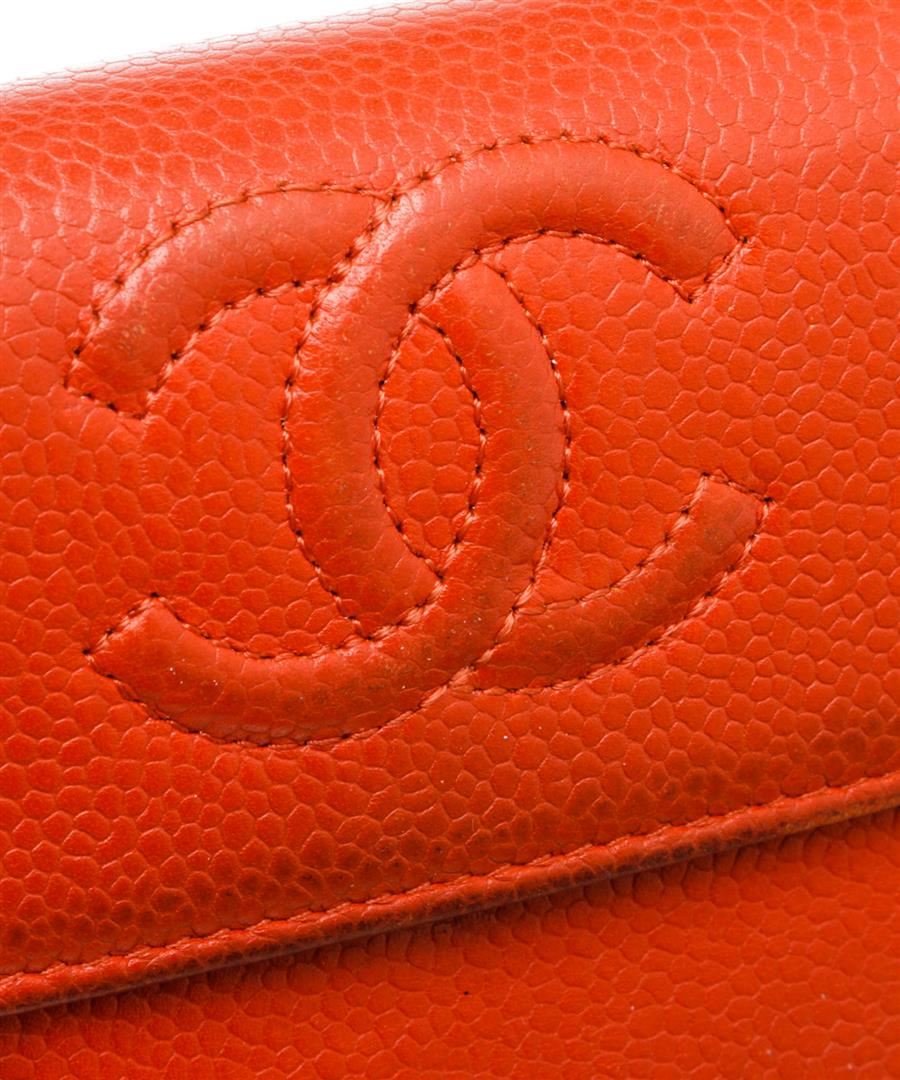 One Chanel Red Caviar Leather CC Long Flap Wallet. Red caviar leather Chanel CC long flap wallet with tonal leather lining, twelve credit card slots, three compartments one with zipper closure, one bill pocket and overall flap with button snap closure. MKX