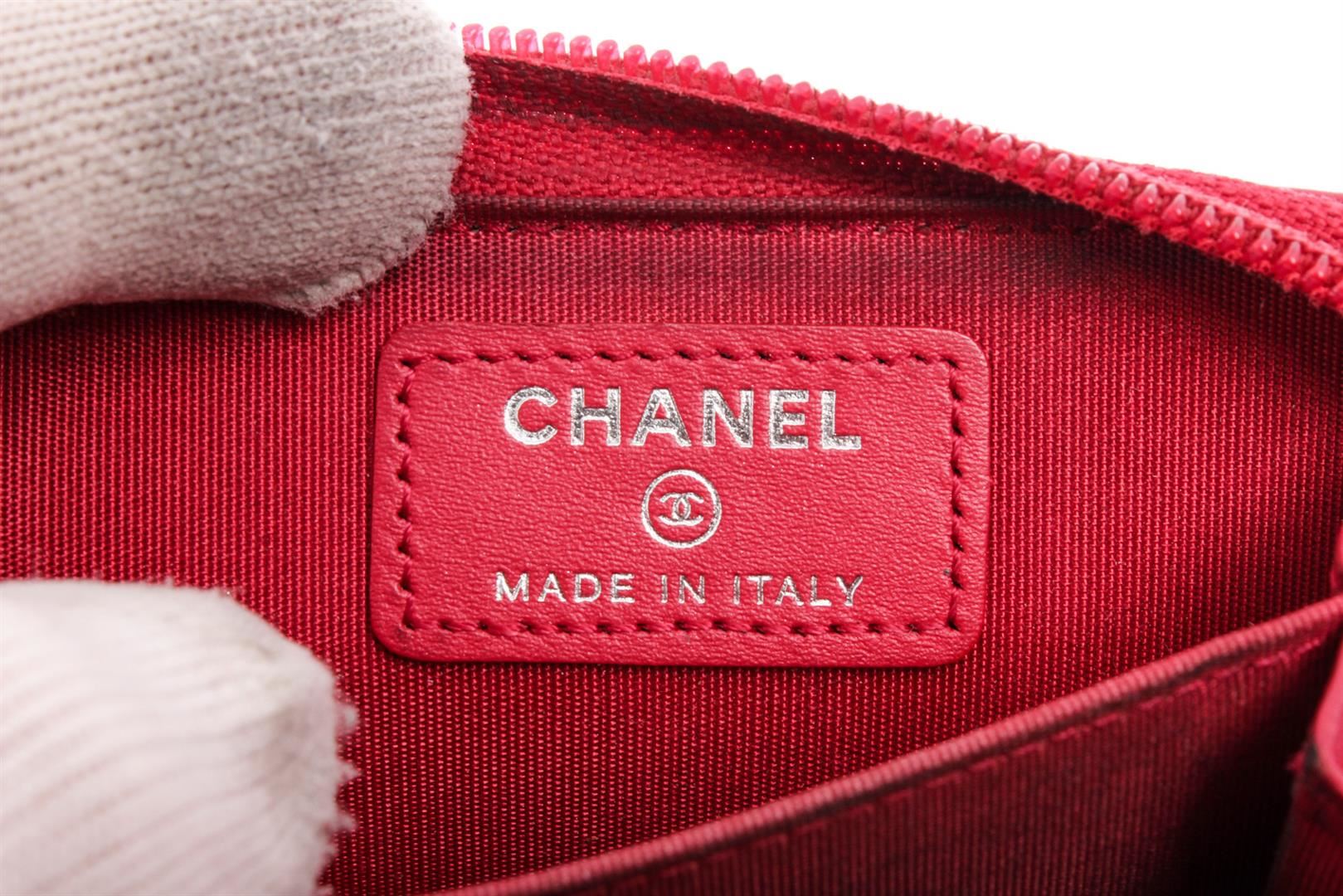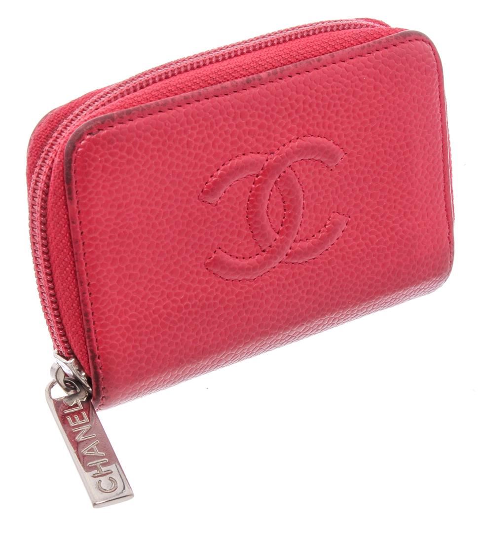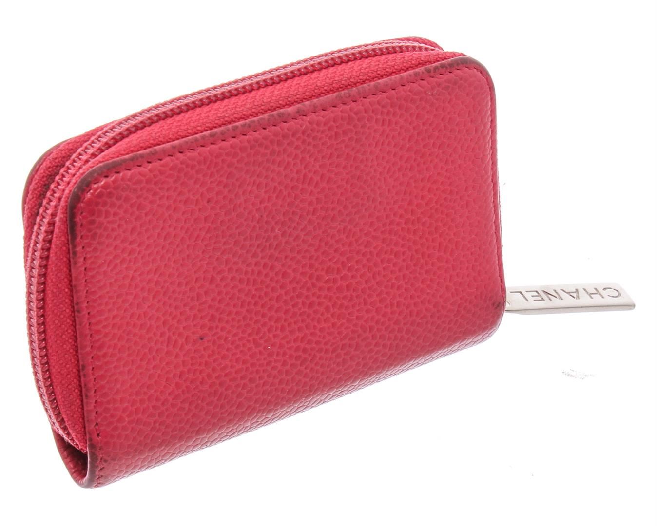 Red Caviar leather Chanel Timeless coin purse with gold-tone hardware, embossed CC logo at front, tonal grosgrain lining, three interior compartments and zip-around closure at top.