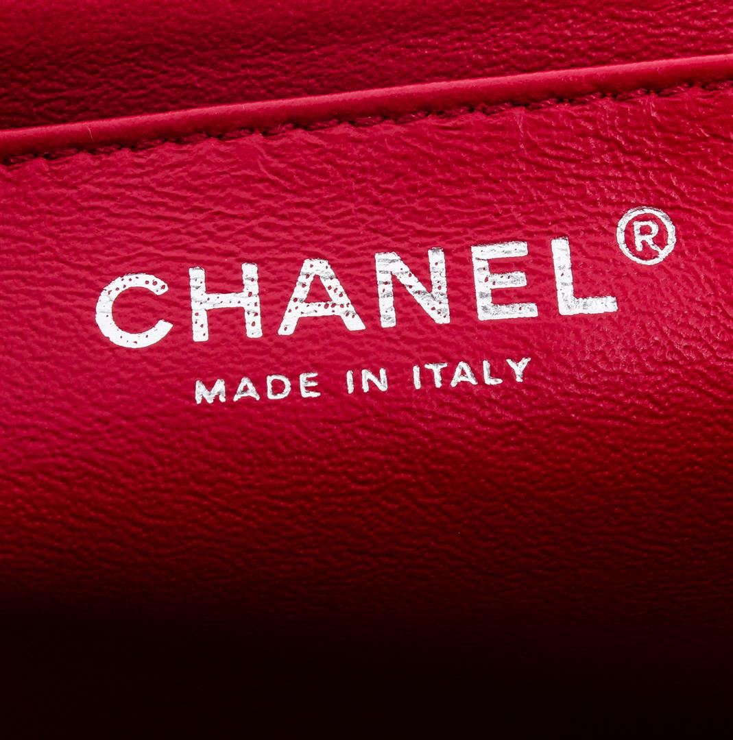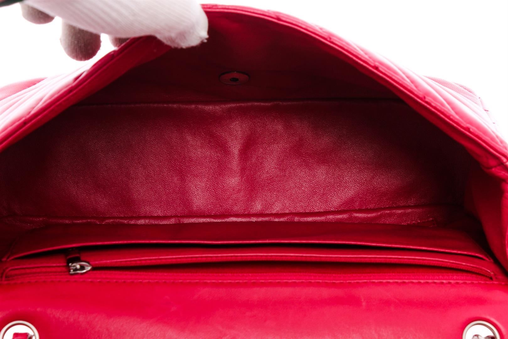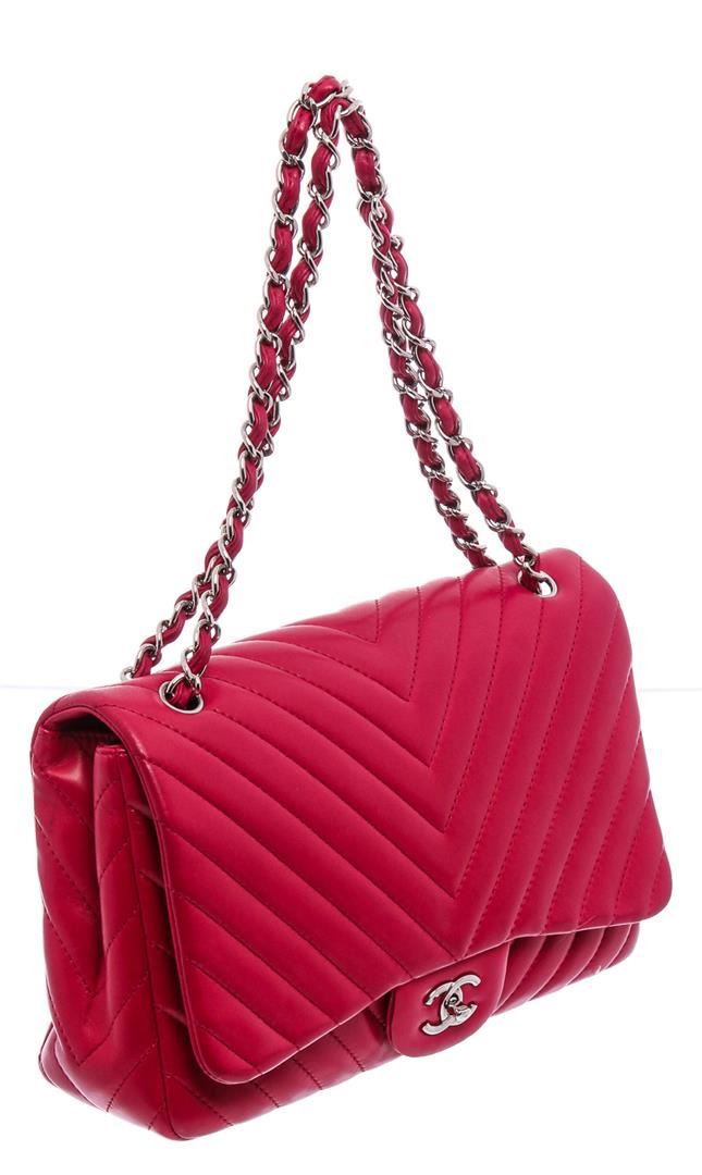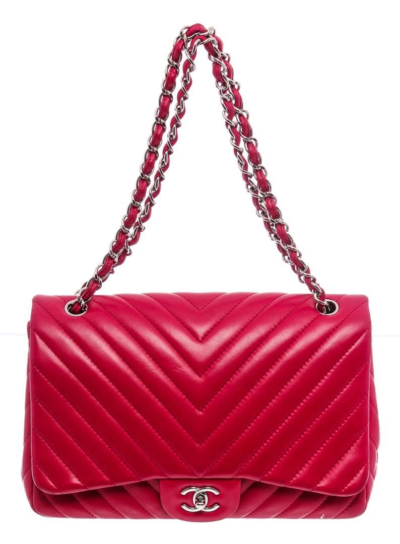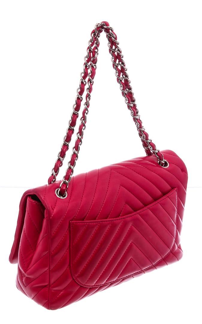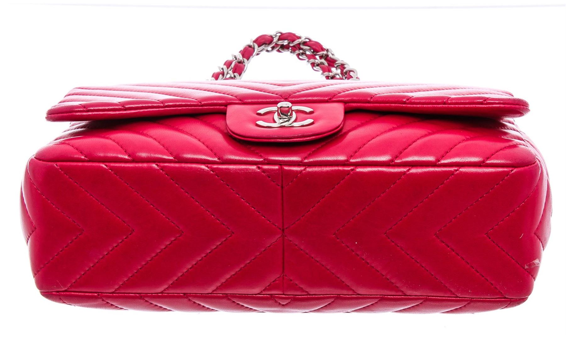 One Chanel Red Chevron Quilted Leather Maxi Flap Bag. Red chevron quilted leather Chanel Classic Maxi Flap Bag with silver-tone hardware, dual convertible woven leather chain-link shoulder straps, single exterior patch pocket, tonal leather lining, dual pockets at interior wall; one with zip closure and CC turn-lock closure at front flap.