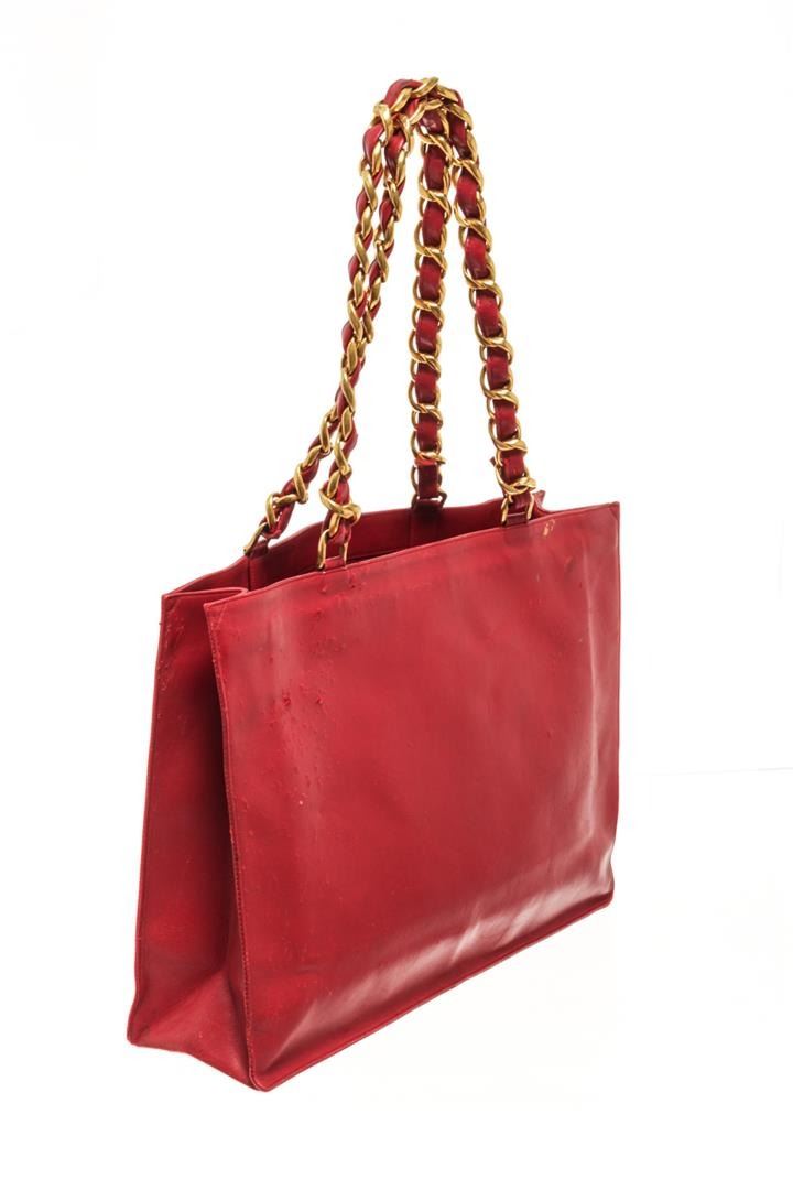 One Chanel Red Lambskin Chain Shoulder Bag. Item is sold AS-IS. All available information is listed in the description and shown in the photo. Chanel Red Lambskin Chain Shoulder Bag with gold-tone hardware, two leather and chain-link shoulder strap, open top, main compartment internal zip-fastening pocket, internal logo stamp. Depth 4.3 in, Height 12.2 in, Strap 12.2 in, Width 16.3 in / Depth 11 cm, Height 31 cm, Strap 31 cm, Width 41.5 cm