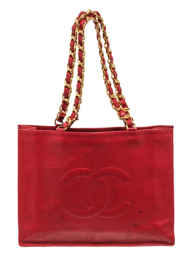 One Chanel Red Lambskin Chain Shoulder Bag. Item is sold AS-IS. All available information is listed in the description and shown in the photo. Chanel Red Lambskin Chain Shoulder Bag with gold-tone hardware, two leather and chain-link shoulder strap, open top, main compartment internal zip-fastening pocket, internal logo stamp. Depth 4.3 in, Height 12.2 in, Strap 12.2 in, Width 16.3 in / Depth 11 cm, Height 31 cm, Strap 31 cm, Width 41.5 cm